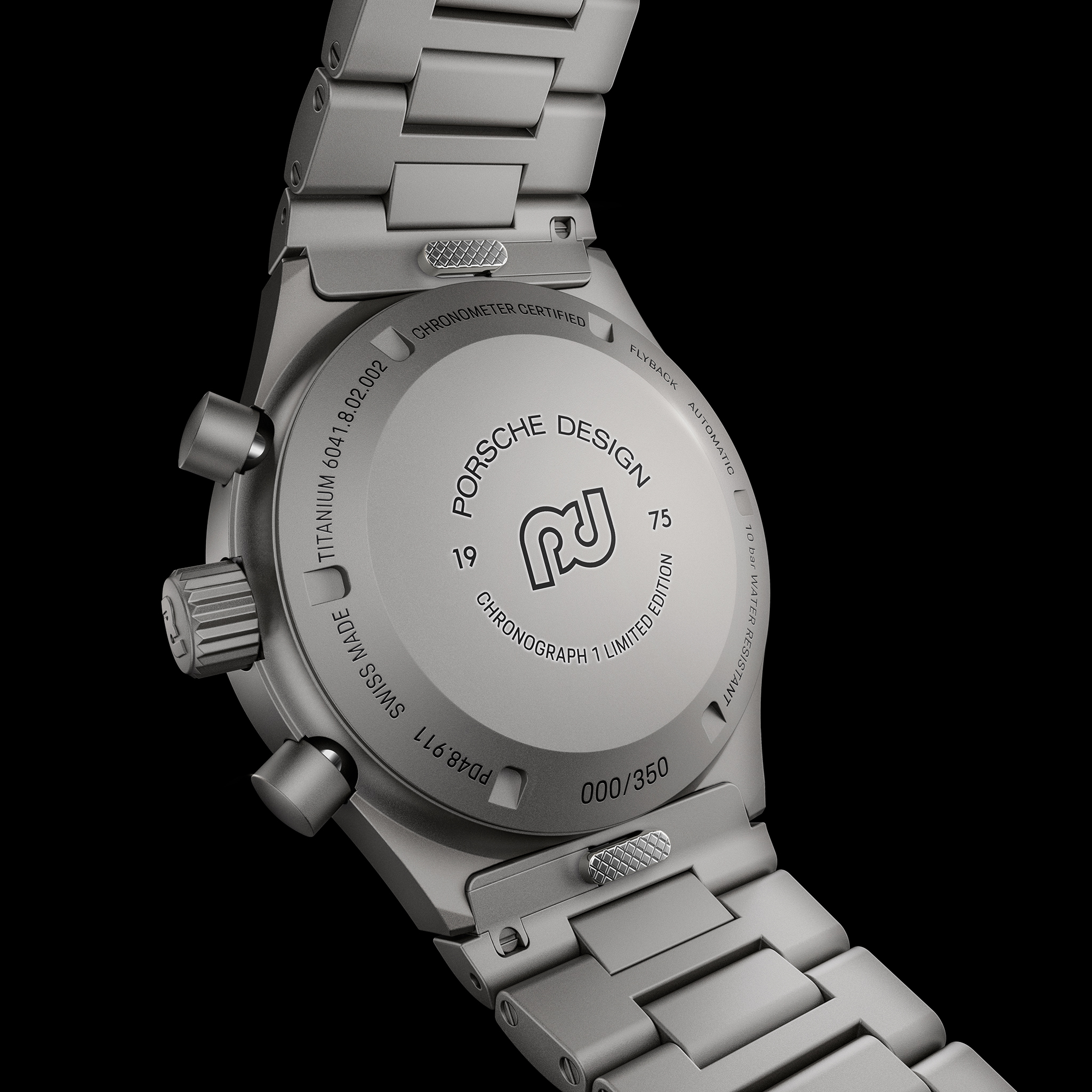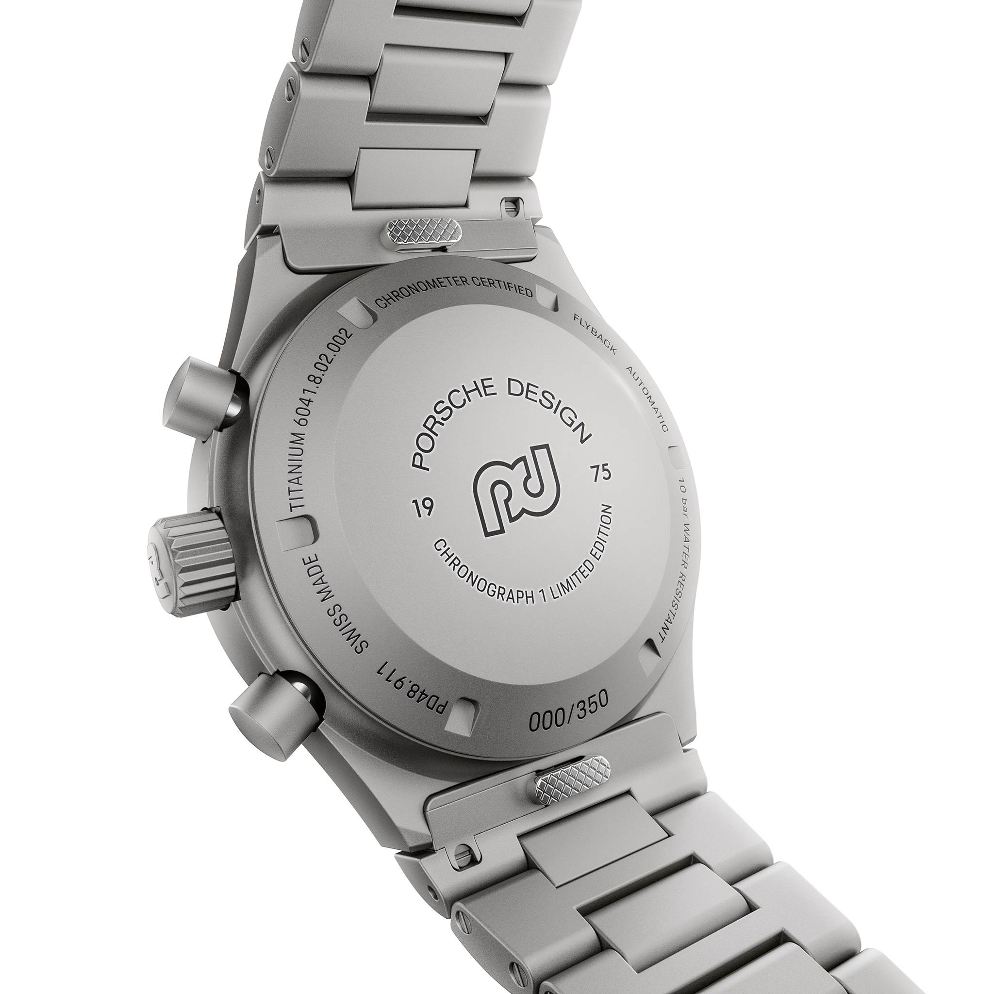 Der Chronograph 1 – 1975 Limited Edition ist mit einem glasperlgestrahlten Titanarmband ausgestattet, das in Material und Ausführung auf das Gehäuse abgestimmt ist. Seine Titan-Faltschließe mit Feineinstellung trägt das historische Porsche Design Icon. Das minimalistische und dennoch robuste Design erinnert an die Ästhetik von automobilen Hochleistungskomponenten. Mit einer massiven Titankrone und einem Gehäuseboden, auf dem das bedeutende Marken-Symbol eingraviert ist, zeigt der Chronograph 1 – 1975 Limited Edition auf der Rückseite stolz die Gravur „Flyback Automatic“ und offenbart die mechanischen Fähigkeiten des Porsche Design Kalibers WERK 01.240. Zusätzliche Gravuren der Jahreszahl „1975″ und der individuellen Limitierungsnummer erhöhen den Sammlerwert der Uhr. Wie alle Porsche Design Zeitmesser wird auch der Chronograph 1 – 1975 Limited Edition in der Porsche-eigenen Uhrenmanufaktur im Schweizer Solothurn in Handarbeit gefertigt. Die Edition wird in einer exklusiven, limitierten Box präsentiert und enthält eine Plakette mit der Editionsnummer und der eingravierten Unterschrift von Prof. F. A. Porsche.