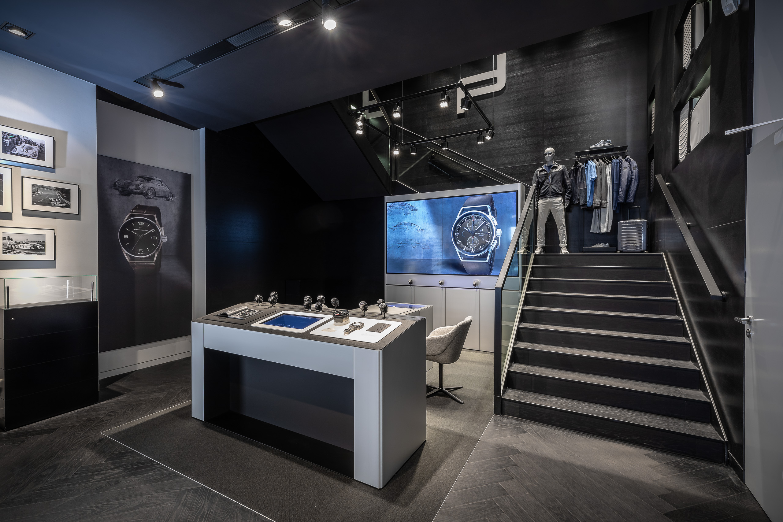 Schon von weitem ziehen die neuen Schaufenster mit emotionalen Bewegtbildern und einer fokussierten Uhren-Präsentation die Blicke der Passanten an. Im Inneren des Stores kreiert der neu geschaffene Uhrenbereich eine eigene, multisensorische und interaktive Welt rund um die Kompetenz und Heritage von Porsche Design Timepieces. Im Zentrum: die exklusiven Zeitmesser selbst – zum Anfassen nah. Zum ersten Mal werden diese nicht hinter einer Glasvitrine, sondern über eine eigens entwickelte Halterung mit Nahwirkung präsentiert. Ohne Spiegelung. Ohne Barrieren.