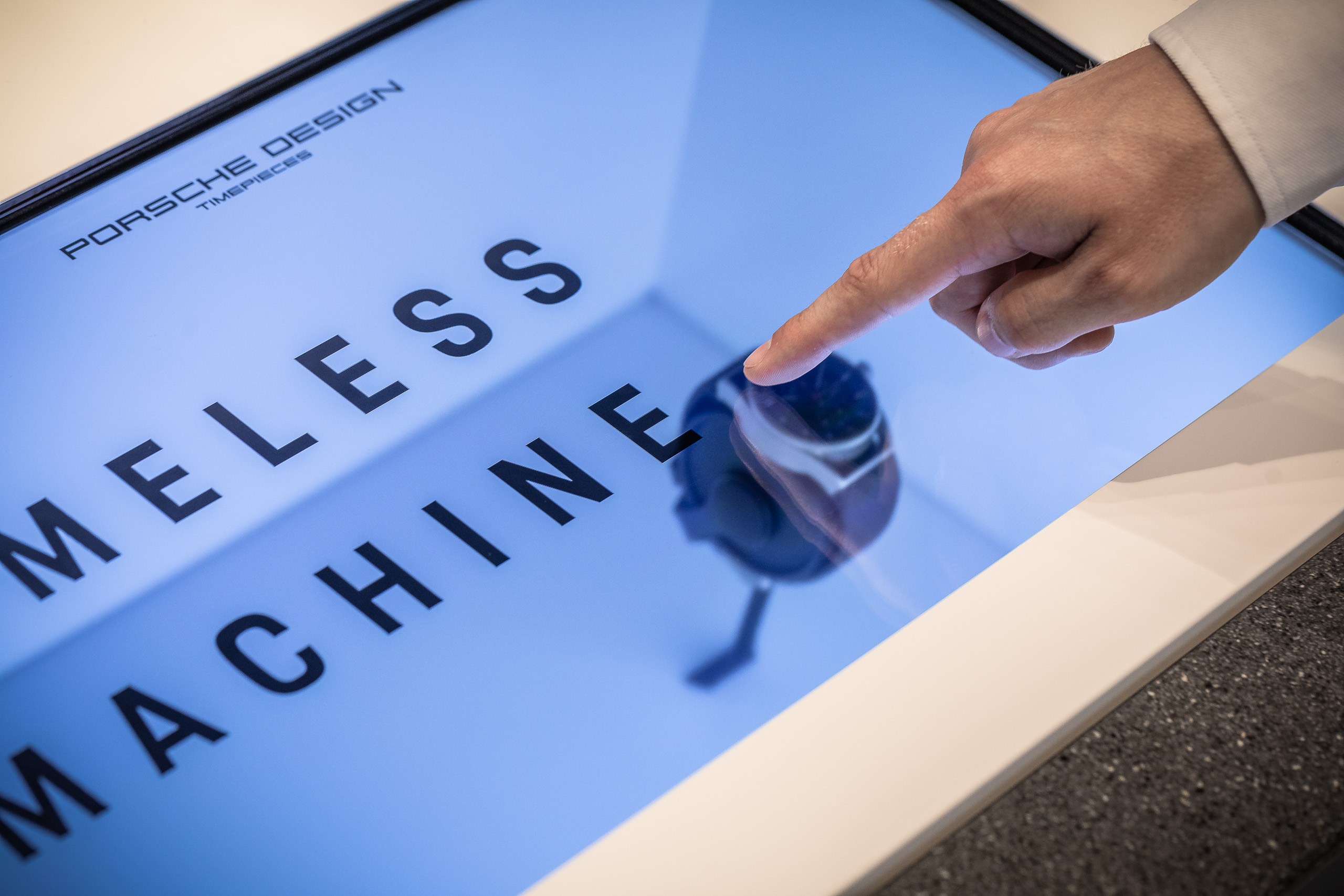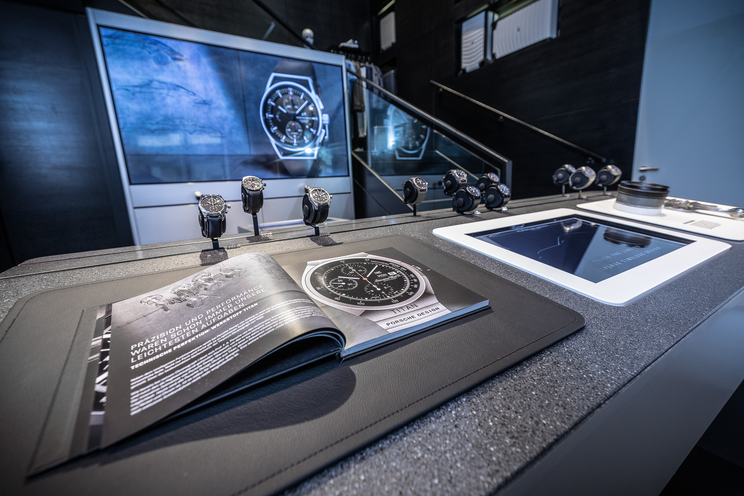Rund um die Uhren werden Geschichte und Momentum der neusten Porsche Design Uhrenmodelle über einen 98‘‘-Monitor und die innovative Hypebox individuell erlebbar. Per interaktivem Screen können Uhrenliebhaber und Interessierte sich tiefer über Modelle und Marke informieren, im Hauptkatalog die aktuelle Kollektion entdecken. Das sensorische Highlight aber sind Muster jener Materialien und Instrumente aus dem Rennsport, die Funktion und Design der Timepieces maßgeblich inspiriert haben – und es noch immer tun: Titan, Sportwagen-Interior-Leder sowie klassische Anzeigeinstrumente. Anfassen ausdrücklich erwünscht.