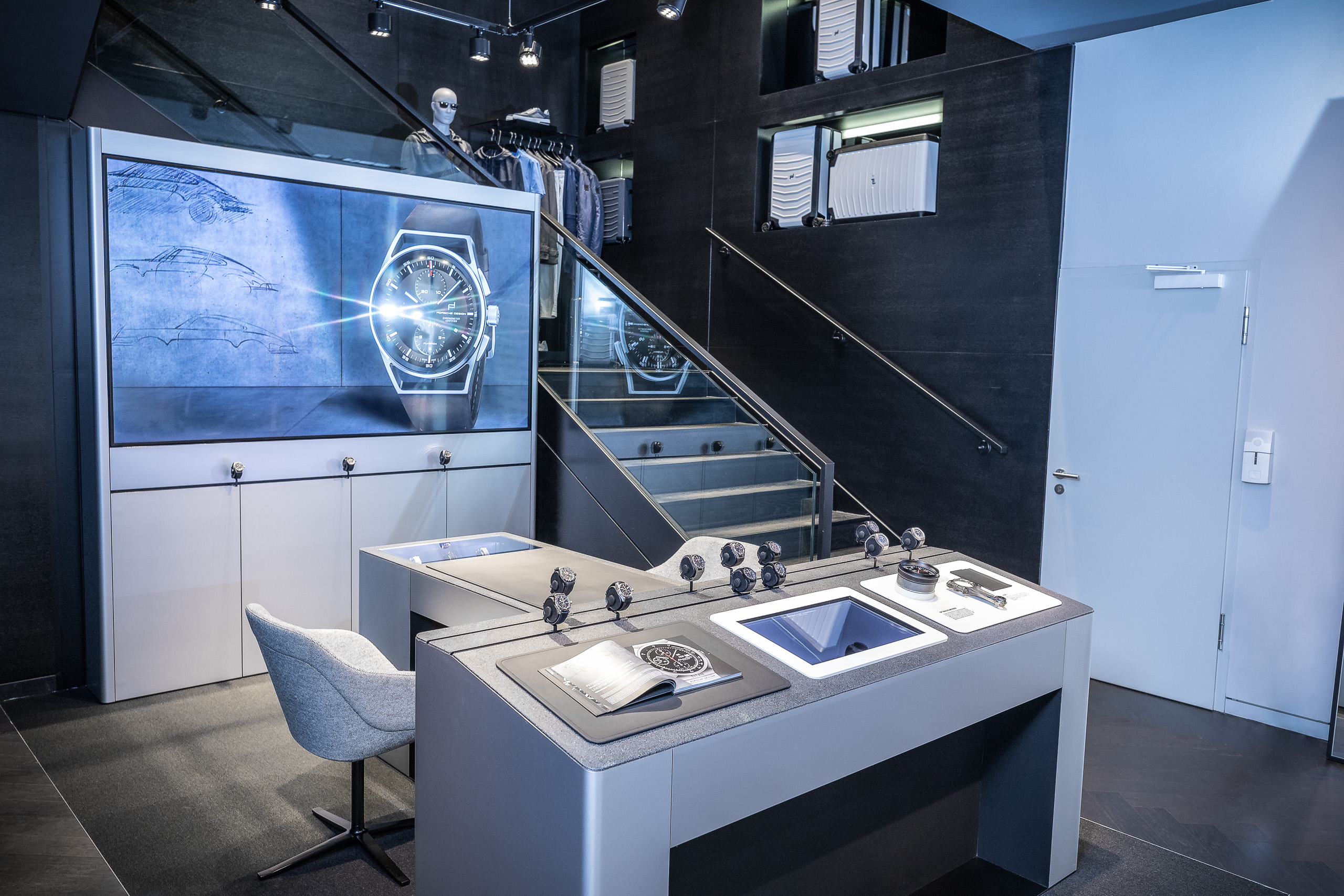 Ein spannender Mix aus digitalen und realen Erlebnisräumen, involvierende Videos und Animationen sowie eine neuartige, offene Uhrenpräsentation laden die Besucher des Porsche Design Flagship-Store in Hamburg ein, voll und ganz in die Welt von Porsche Design Timepieces einzutauchen.