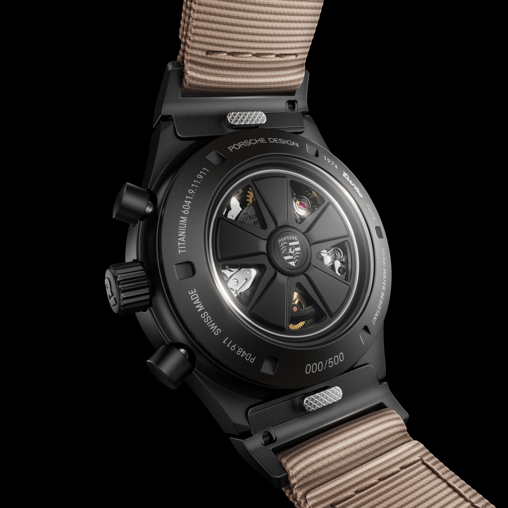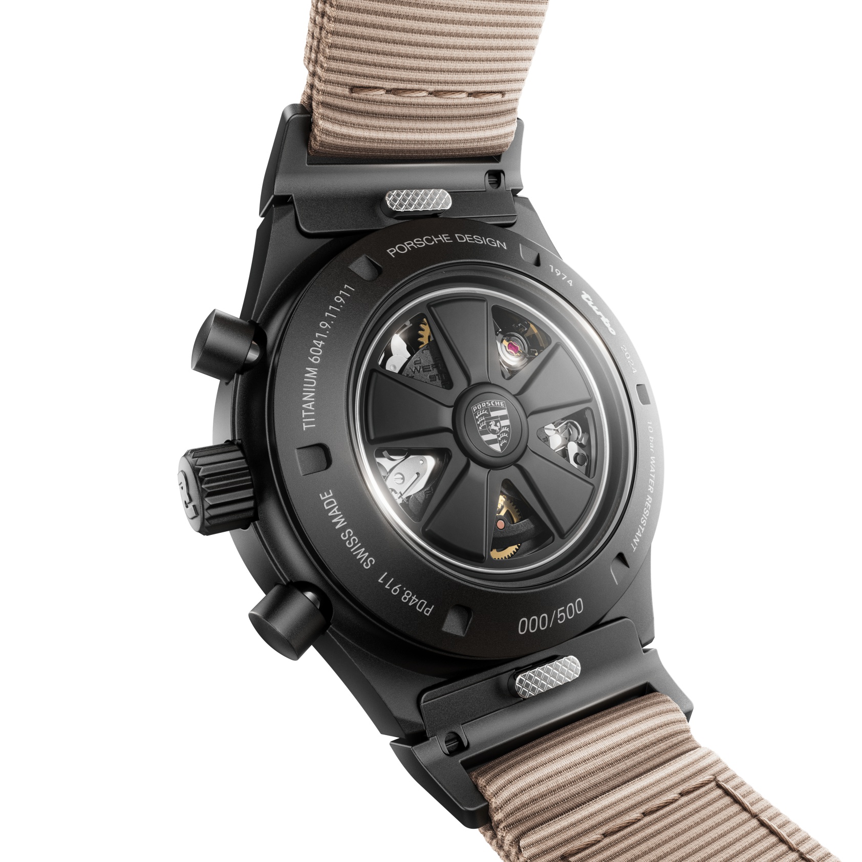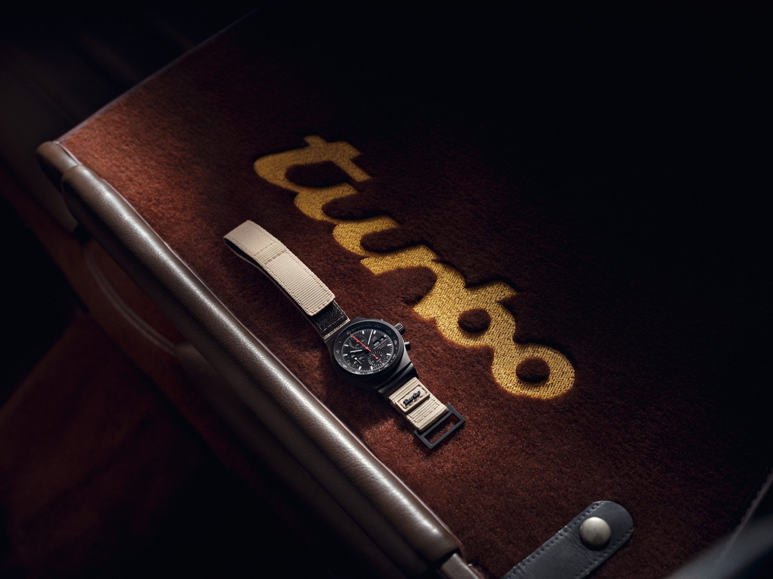 The beige-colored textile leather strap features a quick-change mechanism with a black velcro fastener and black loops. The soft, black material is reminiscent of the carpet of the Turbo interior and ensures outstanding wearing comfort. The choice of color for the strap pays homage to the metallic beige paintwork and the full leather interior of the first 911 Turbo. A distinctive badge on the strap at the 6 o’clock position displays the iconic Turbo branding, which can also be found on the back of the backrest of the vehicle seats. It makes it clear that this timepiece was developed specifically for Turbo enthusiasts. The additional titanium strap with black titanium carbide coating rounds off the scope of delivery.