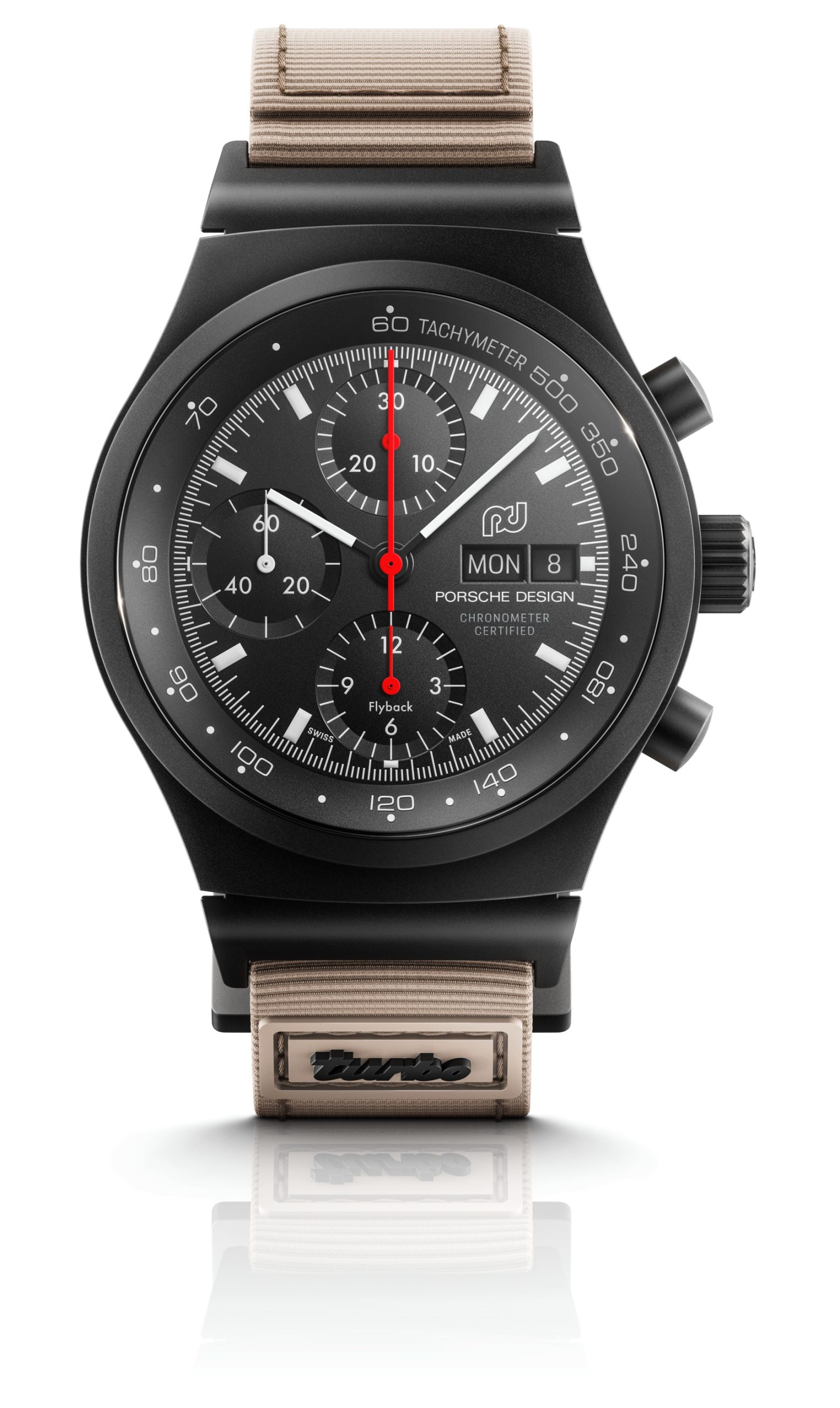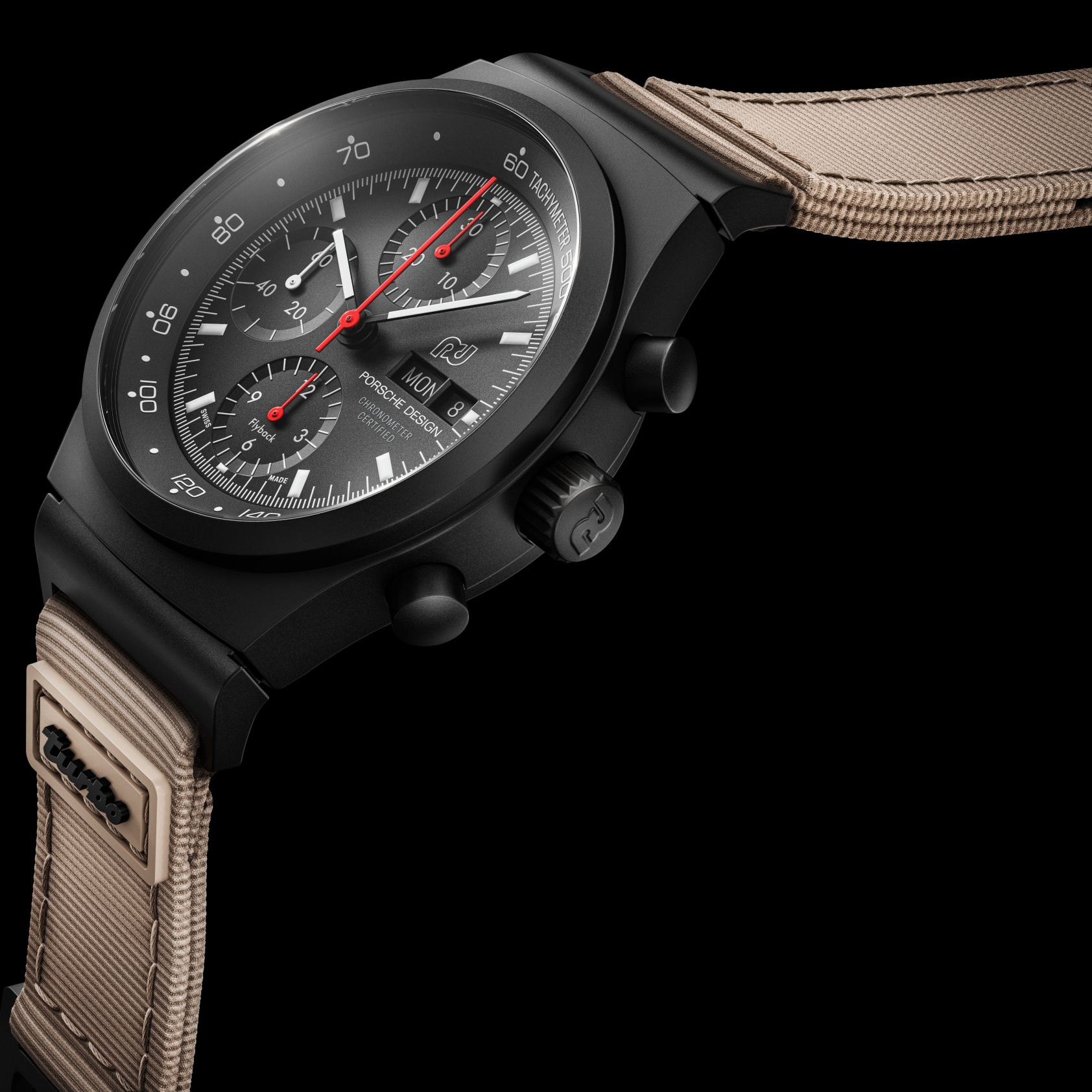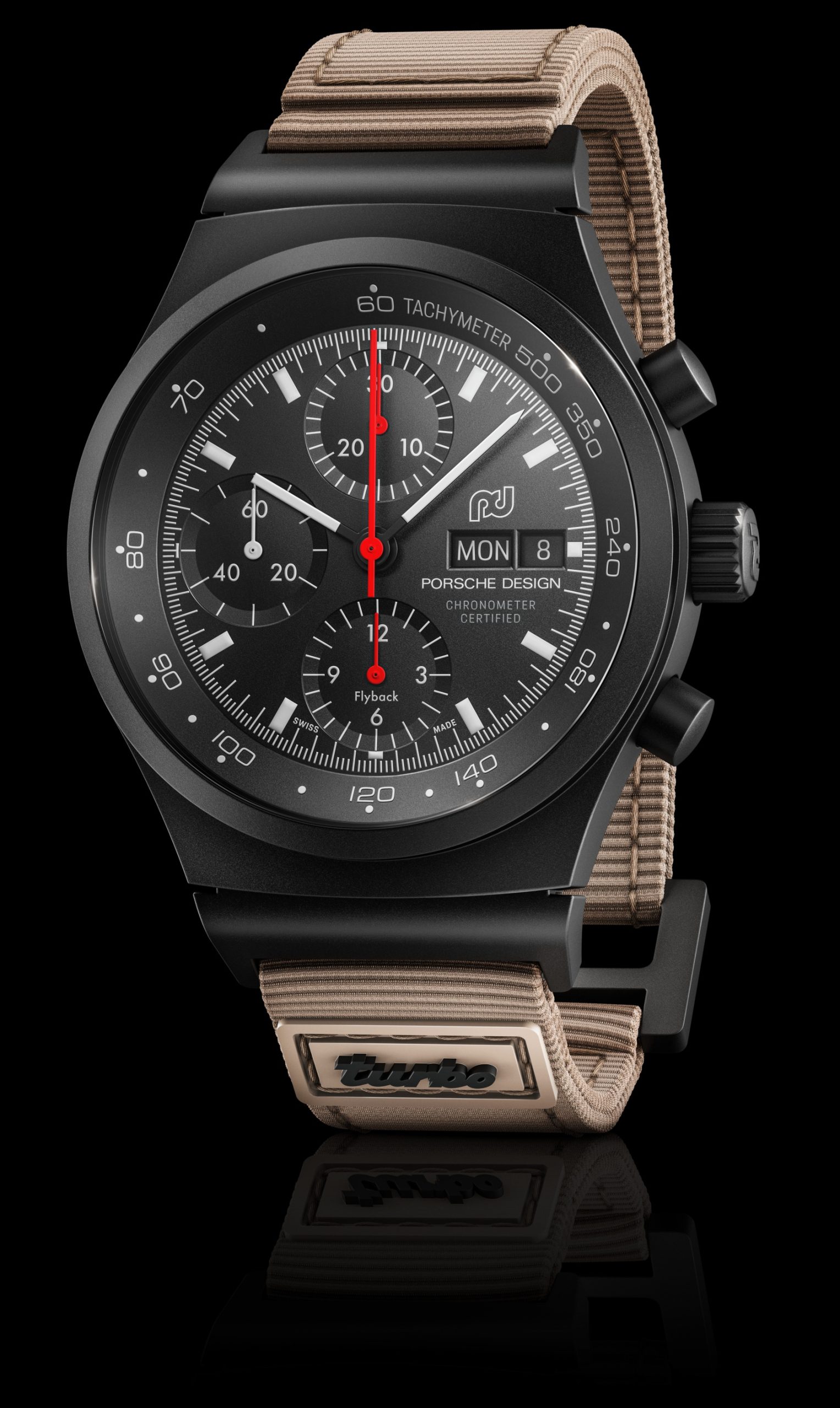 The beige-colored textile leather strap features a quick-change mechanism with a black velcro fastener and black loops. The soft, black material is reminiscent of the carpet of the Turbo interior and ensures outstanding wearing comfort. The choice of color for the strap pays homage to the metallic beige paintwork and the full leather interior of the first 911 Turbo. A distinctive badge on the strap at the 6 o’clock position displays the iconic Turbo branding, which can also be found on the back of the backrest of the vehicle seats. It makes it clear that this timepiece was developed specifically for Turbo enthusiasts. The additional titanium strap with black titanium carbide coating rounds off the scope of delivery.