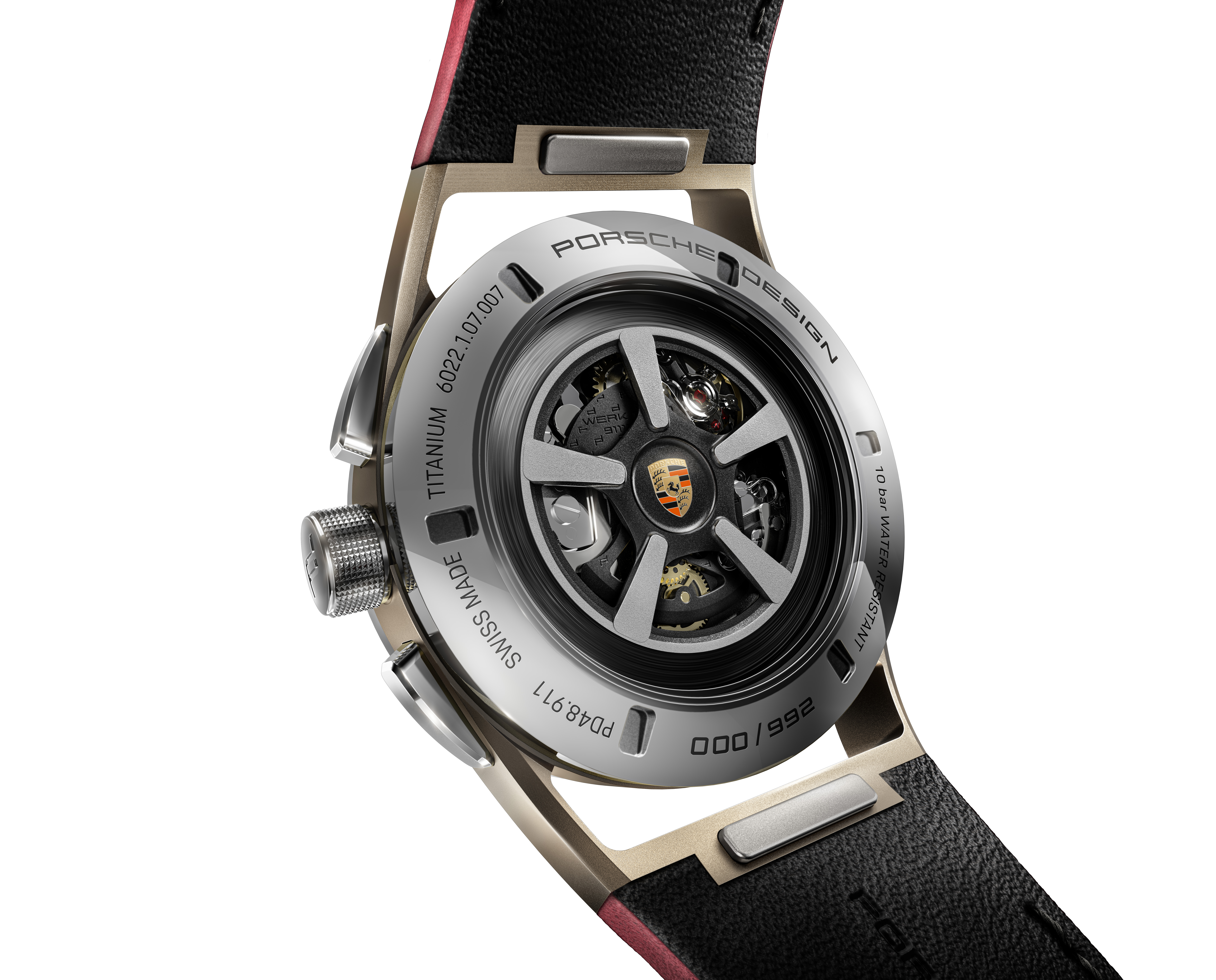 Precise timekeeping is guaranteed by the new Porsche Design Chronograph caliber WERK 01.100, which bears a chronometer certificate from the Swiss C.O.S.C.-Institute. Its rotor mimics the design of the Fuchsfelge (Fuchs wheel), which was originally developed for the first Porsche 911. Based on the specification of the owner’s car, the watch rotor can be either high-gloss black or satin platinum. The historic Porsche crest also pays homage to the roots of the brand and adorns the rotor’s centre lock. The limited edition number that corresponds to that of the car is laser-engraved onto the bottom of the case back.