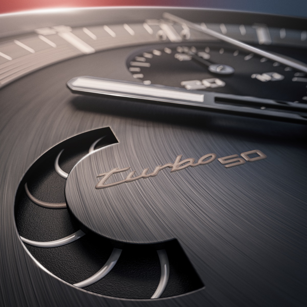 In the 1970s, car fans were fascinated to see the magic number 300 on the speedometer of the 911 Turbo. There is even more to discover on the new 911 Turbo 50 Years, like the Porsche Design Sport Chrono Package, which has been developed exclusively for the unique design of the special model. The analog timepiece on the dashboard shows the direct link to the Chronograph 911 Turbo 50 Years. The white indices and lettering provide a perfect contrast to the black sunburst dial and the Turbonite-colored rings – an exclusive color scheme reserved solely for the Porsche Turbo models. The 9 o’clock position features not only the “turbo 50” motif but also the seconds dial, whose design is based on the shape of a turbocharger wheel.