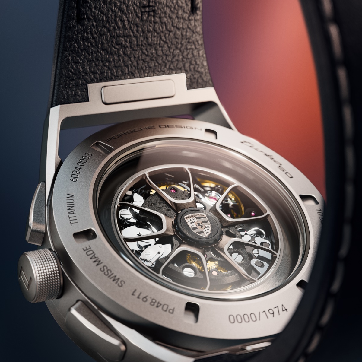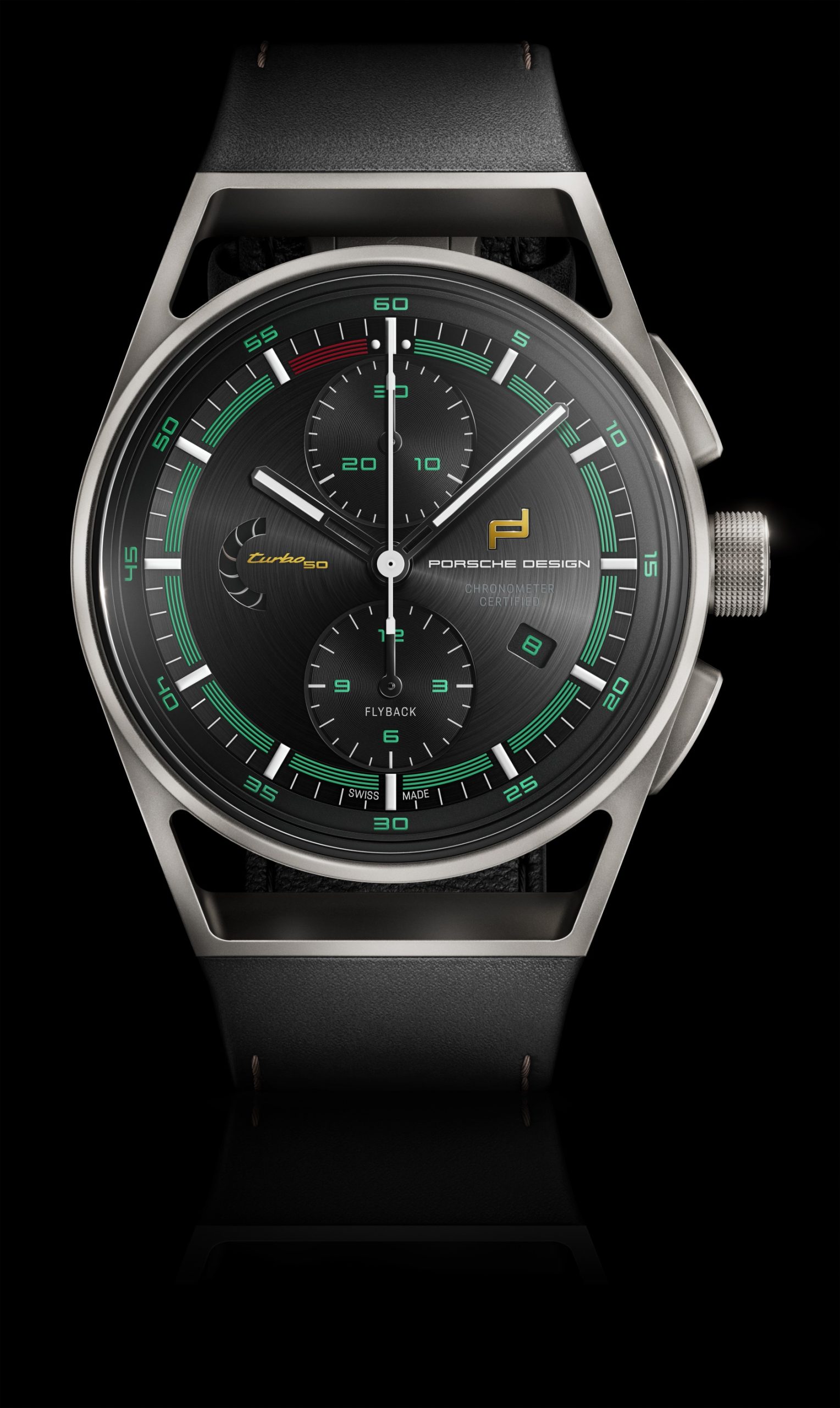 The similarities between the Chronograph 911 Turbo 50 Years and the high-performance sports car special model are also evident on the back of the timepiece: The winding rotor is based on the design of the wheel on the 911 Turbo 50 Years. The wheel and center cap featuring the Porsche crest are in the color Turbonite, while the titanium anthracite spokes provide sporty, elegant contrasts. The classic black leather strap made of authentic Porsche vehicle leather is embellished with original Porsche yarn in Turbonite. The titanium folding clasp with push-button release keeps the timepiece secured to the wrist, while the quick-change mechanism allows the strap to be easily replaced.