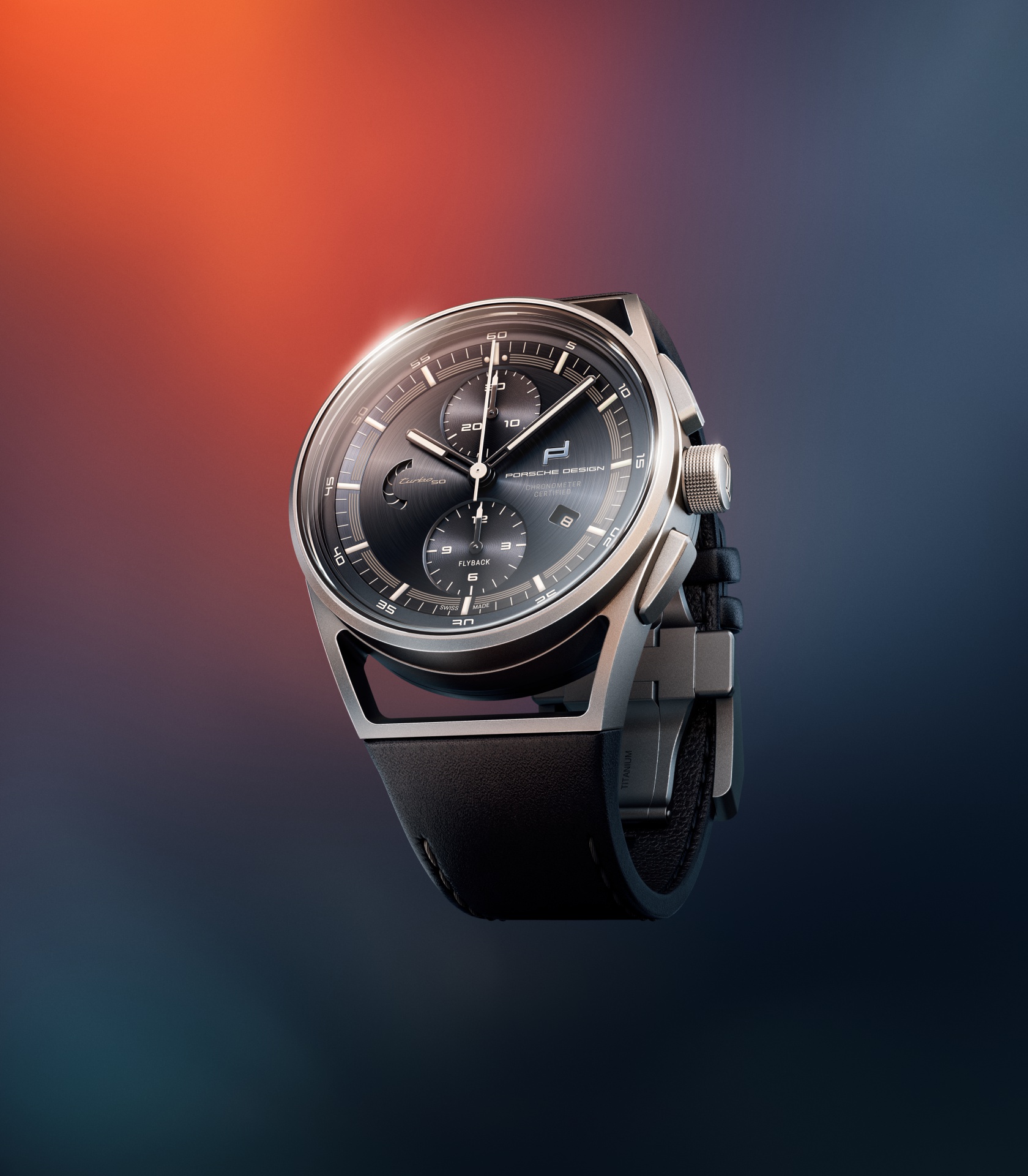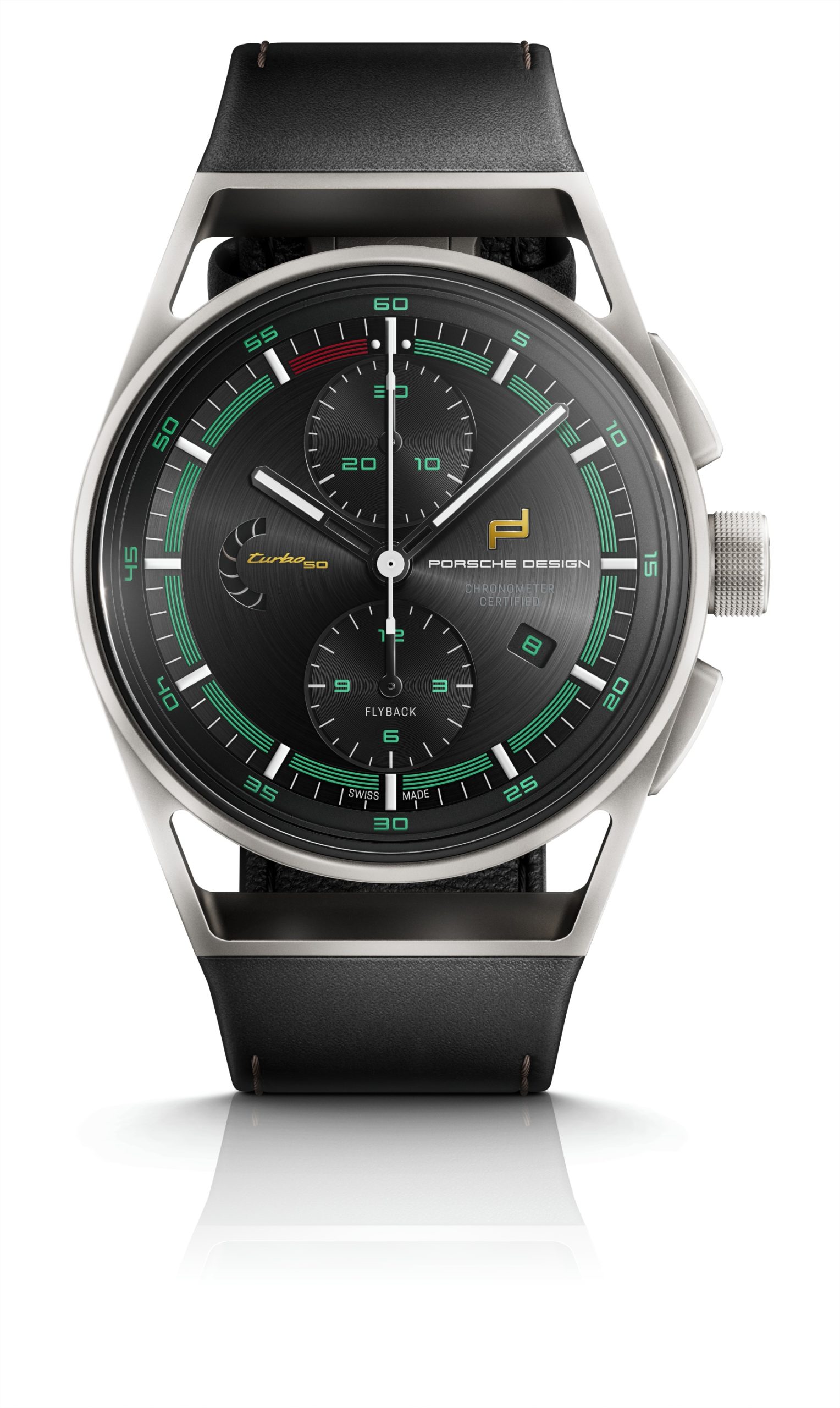 The case of the chronograph is made of titanium, consistently building on the lightweight design concept of the 911 Turbo 50 Years. It is not only extremely lightweight but also scratch-resistant, along with typical Porsche features. The vehicle’s limited-edition number, engraved on the back of the case, underlines the close connection to the special model. Powered by the Porsche Design WERK 01.200 caliber, the COSC-certified chronograph not only works with high precision but also records successive time intervals with ease. Thanks to the flyback function, starting, stopping, and resetting to zero is possible in just one operation.