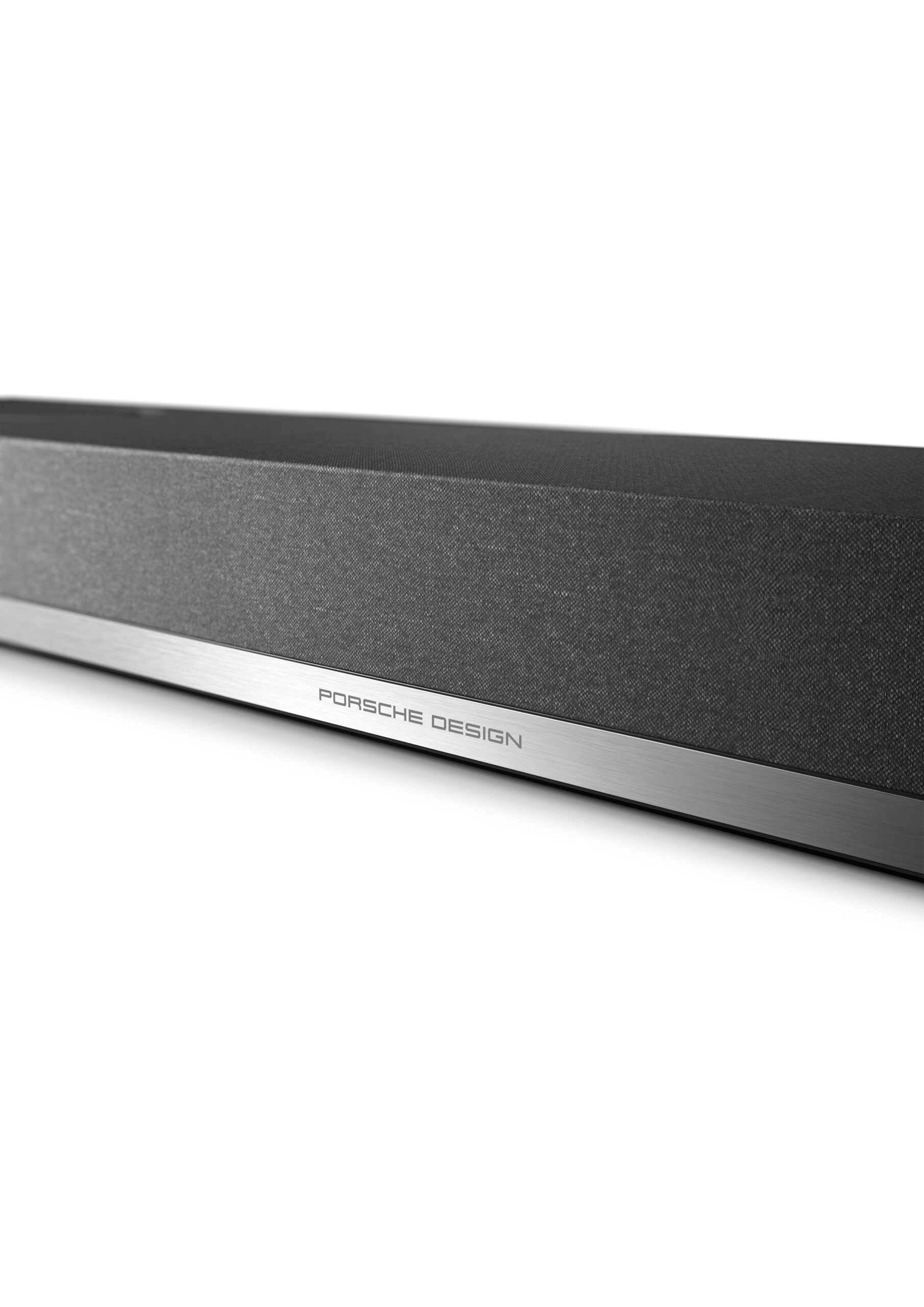 The size of the soundbar is a reflection of its outstanding performance, while the understated, functional design featuring a fabric cover and polished aluminum inlay with Porsche Design logo enhances any room. The clear, angular lines are a perfect fit for modern interiors, whether free-standing for a near-floating effect, or mounted on the wall. The PDB90 comes with wall brackets as well as an HDMI cable and can be operated using the provided remote control. The most important functions such as on/off and volume control can also be intuitively activated via touch buttons on the side of the soundbar. The control elements and display integrate organically under the fabric cover. The exclusive, timeless design and incomparable sound make the soundbar an absolute must-have for all discerning design and audio enthusiasts.