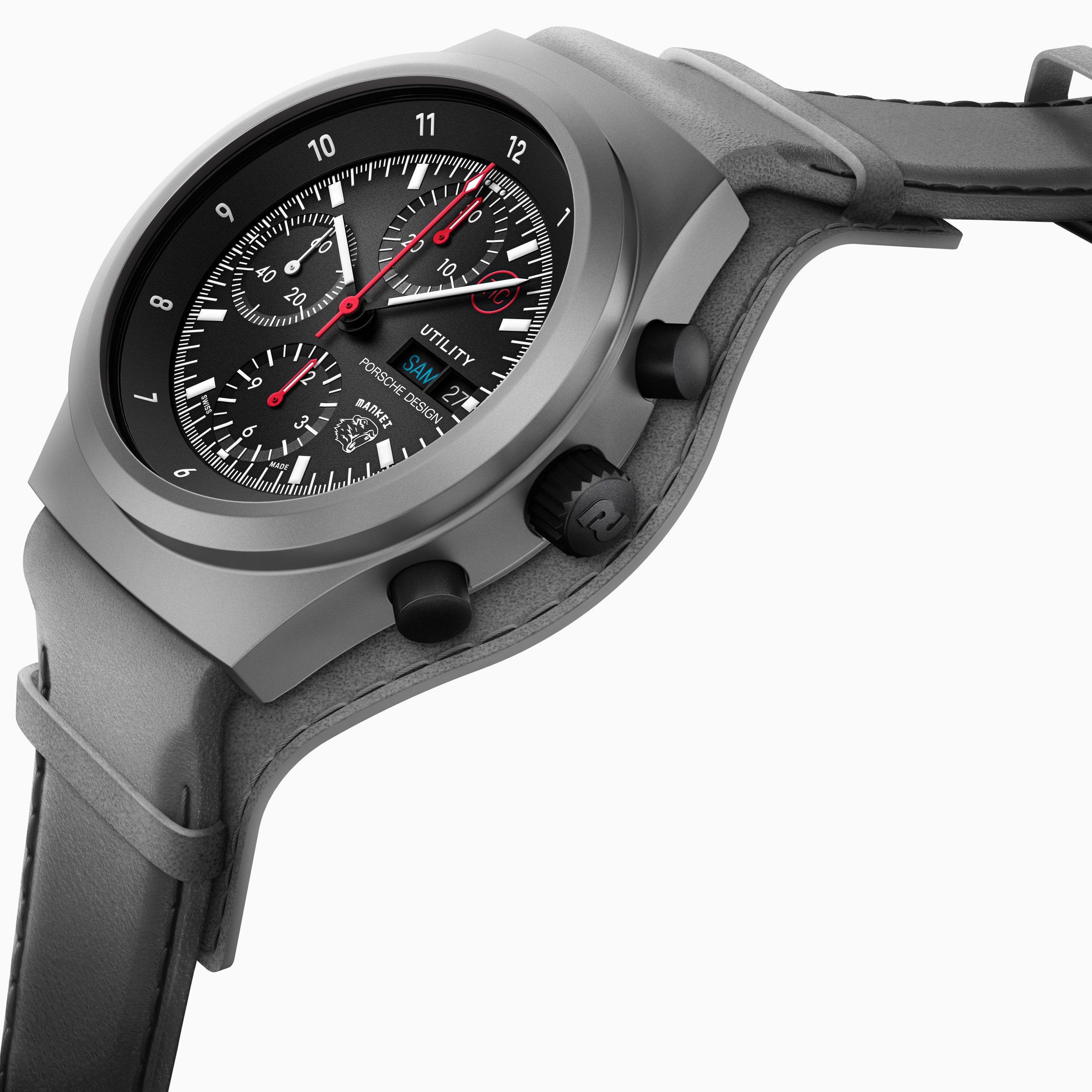 The design of the Chronograph 1 Utility – Limited Edition remains true to its heritage: a matte black dial with optimal readability, historical typefaces, and the signature red „TiC“ logo, which replaces the earlier 3H symbol to highlight the use of titanium carbide. Modern Super-LumiNova® luminescent material in a vivid light blue ensures visibility even in darkness, while enhanced minute and second markers further improve readability. As a playful homage, the watch features the “Mankei” icon – a screaming marmot symbolizing the collaboration with F.A.T. Mankei on the Grossglockner High Alpine Road, located near Studio F. A. Porsche in Zell am See.