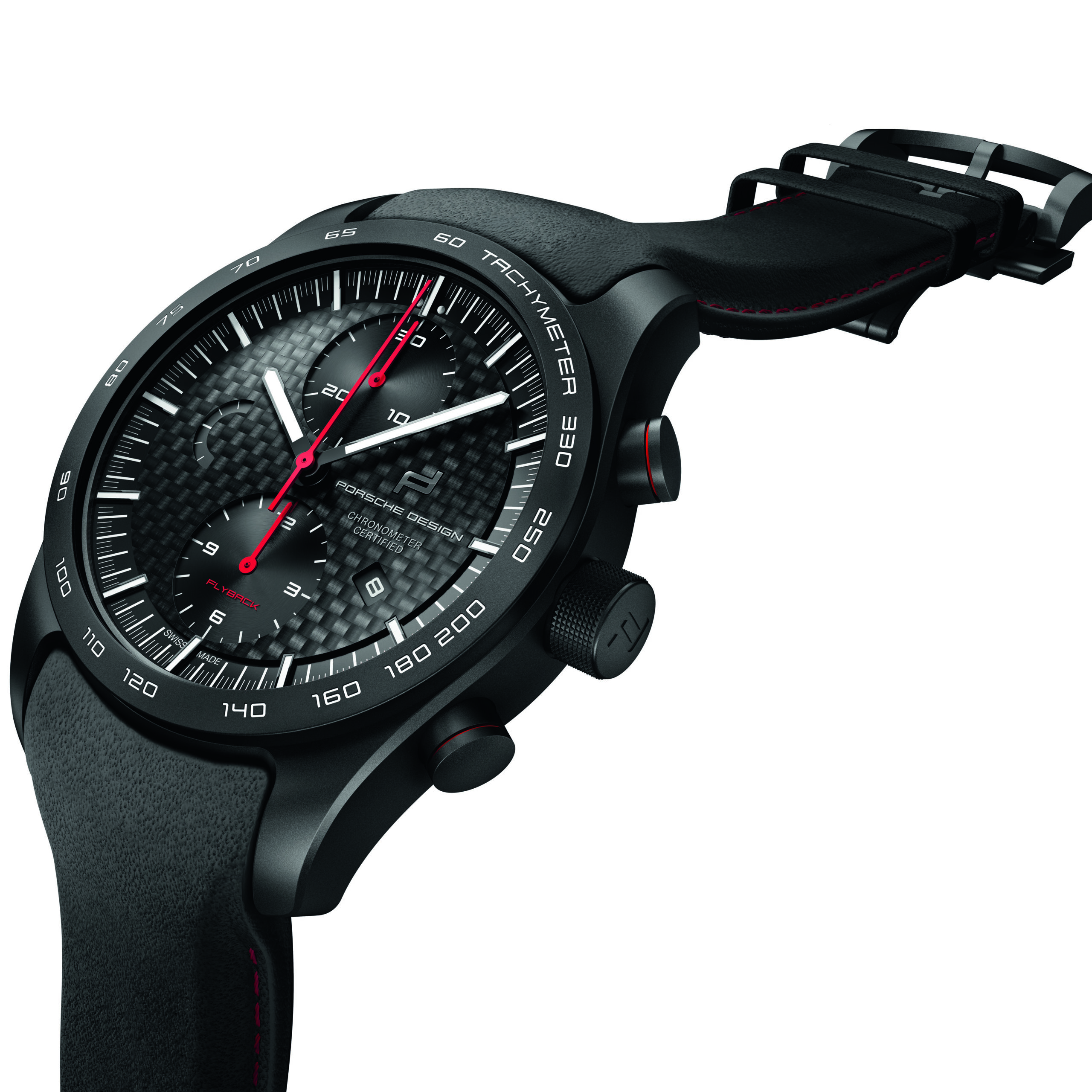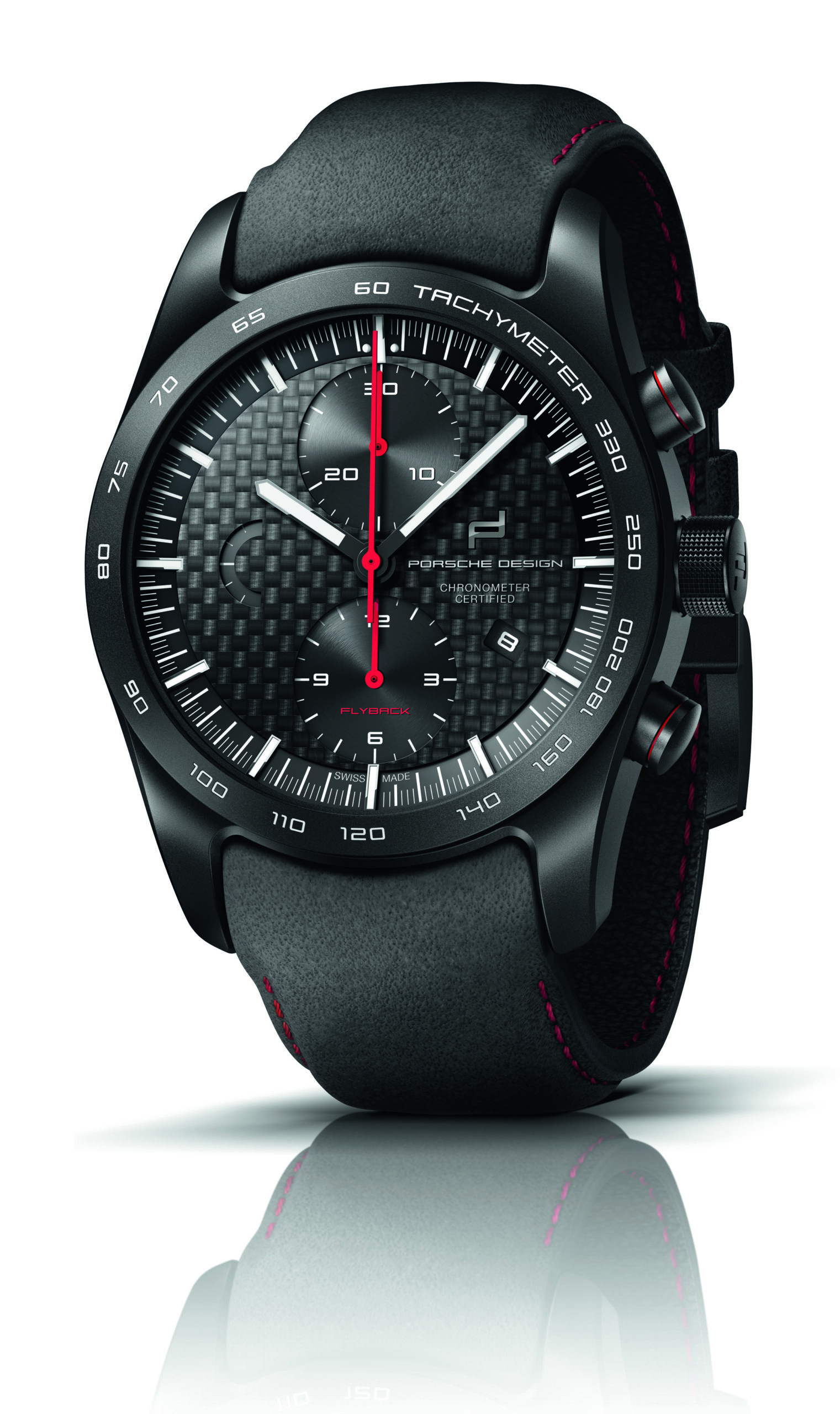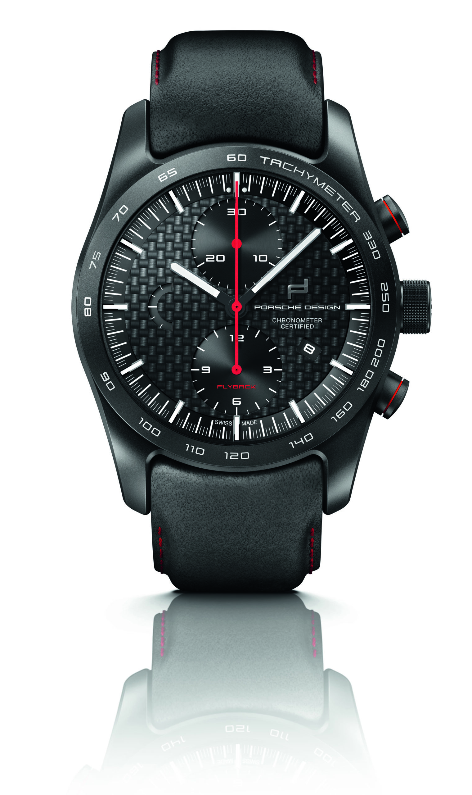 The Chronotimer Collection and Porsche sports car are two of a kind, as both are entirely dedicated to function and precision. This new edition effortlessly reflects the essence of the style-forming Porsche Heritage. The 42-mm diameter timepiece, water-resistant to five bar, features an innovative titanium case – compulsory at Porsche Design since 1980 – with a black titanium carbide-coating. A further tribute to motor-sport and lightweight construction, the watch utilizes a matte-black carbon dial reminiscent of Porsche instrument gauges. The stop-second hand and the rings around the chronograph push pieces are designed using red to distinguish the stop-function from the regular time indication, in order to increase the overall functionality.