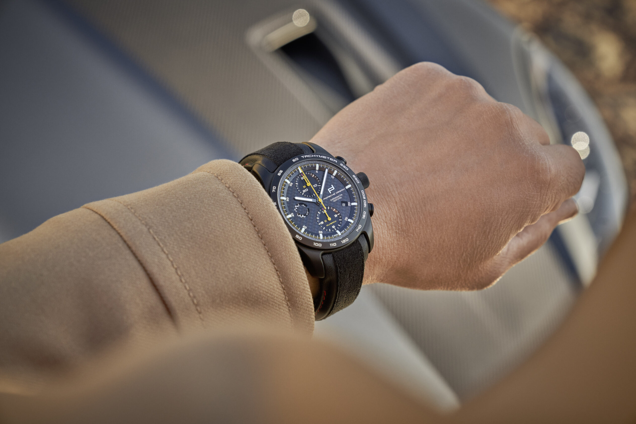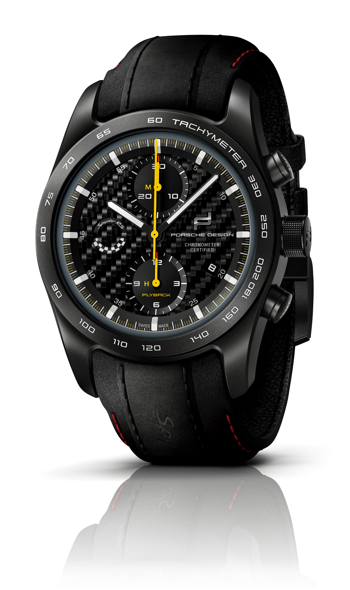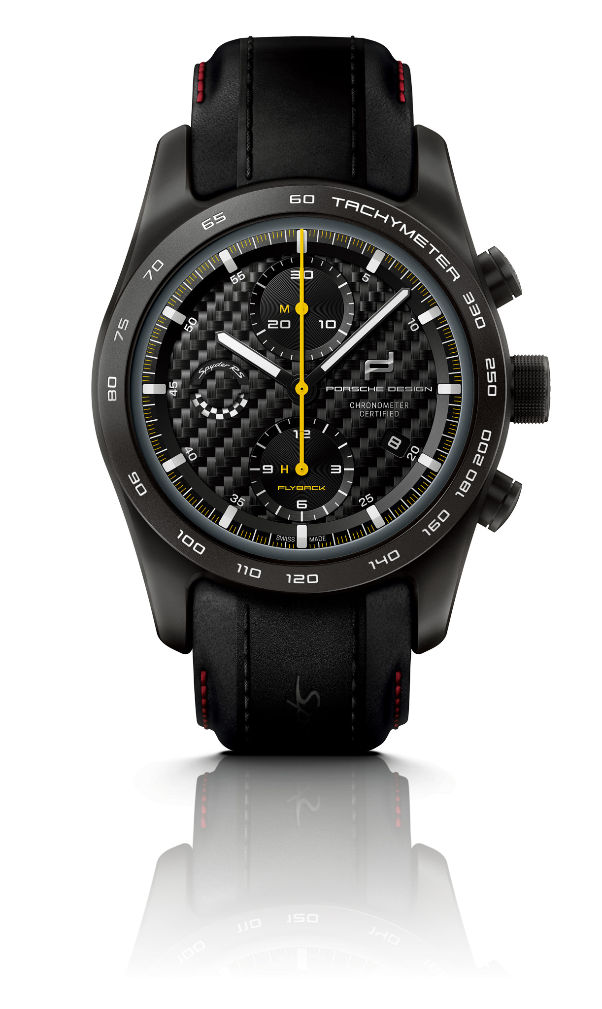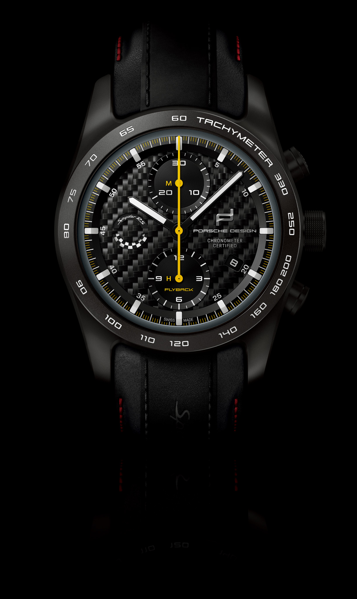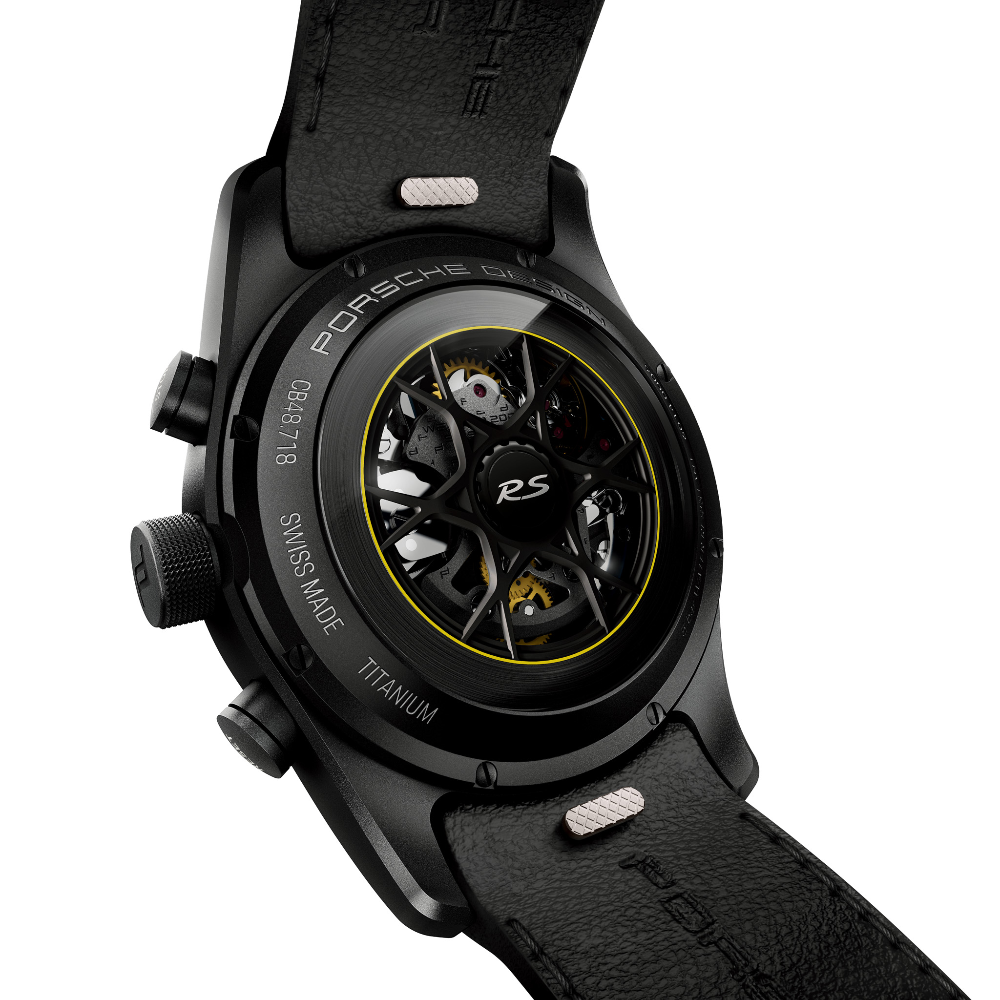 The 718 Spyder RS stands out from the crowd with its flat silhouette and characteristic streamliners. Its six-cylinder mid engine, race-proven GT chassis, and lightweight construction promise maximum agility. The accompanying chronograph is equally designed for performance and, thanks to its lightweight titanium case, doesn’t weigh a gram too much. What’s more, it can be configured just as individually as its motorized counterpart. The case is available in natural titanium or Black titanium. The bezel is in the corresponding color version and is available with a tachymeter or minute dial. The Porsche Design timepieces configurator offers all available Spyder RS standard, metallic, and special colors for the individual color ring around the dial as well as 114 additional colors of choice (‘Paint to Sample’) – including numerous historic Porsche colors. The scratch-resistant sapphire crystal with seven-fold antireflective coating on both sides guarantees optimum readability on every thrilling bend in the road. The carbon “RS” dial and the “GT” dial in black provide additional motorsport touches while the white hour and minute indexes made of ceramic Super-LumiNova® luminous material provide a sporty contrast. The totalizers are adorned with “Flyback” lettering and an “M” and an “H” – for minutes and hours – in Racing Yellow. The hands in PERFORMANCE (white), ESSENCE (black), or GT (yellow) intensify the fascination of racing with every second. The mechanical gear indicator at 9 o’clock underscores the ultimate motorsport genes of the 718 Spyder RS with a chequered flag design in black and white and dynamic “Spyder RS” lettering.