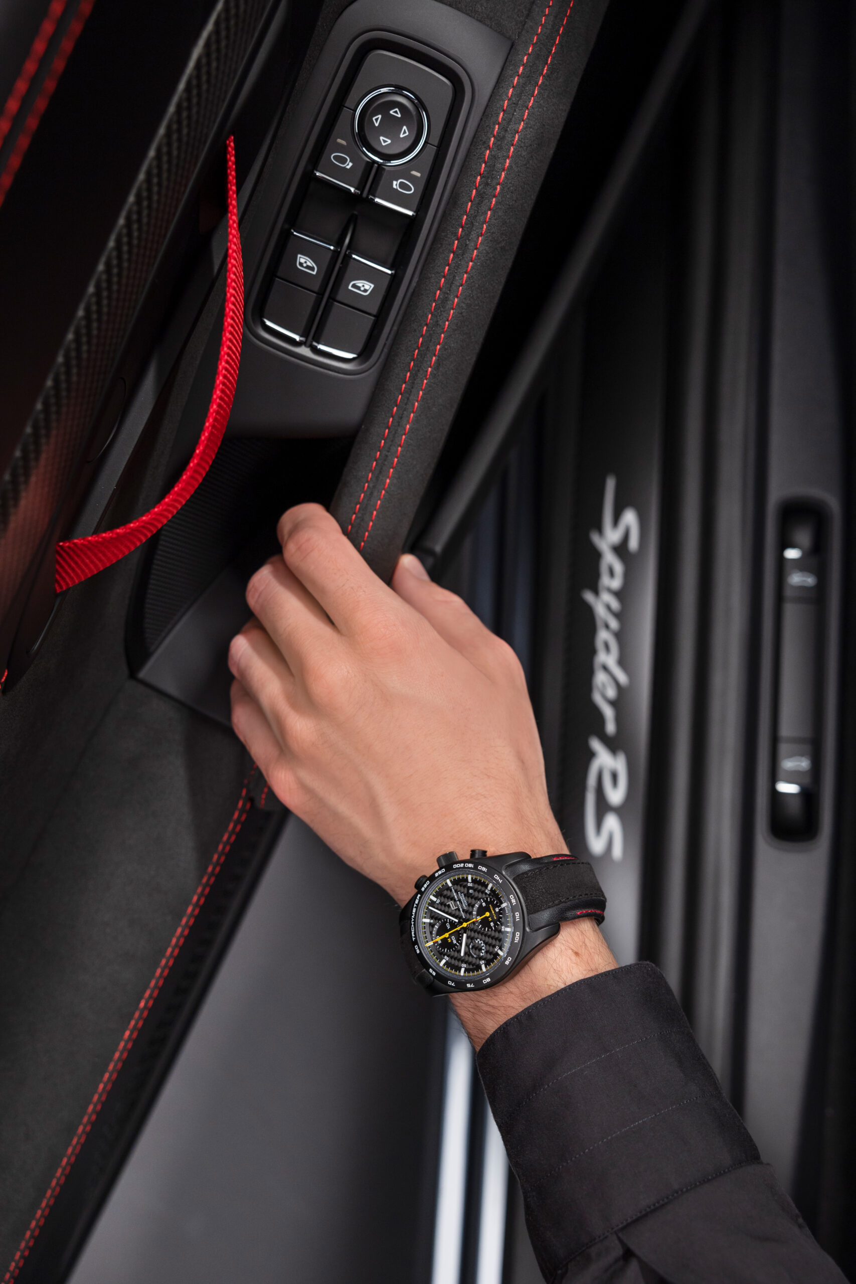 The COSC-certified Porsche Design WERK 01.200 is enclosed in the glass bead–blasted titanium back in the case color. The movement also features a flyback function that combines starting, stopping and resetting in a single operation. The only drawback of a chronograph with such a high-precision movement: it shows to the second when it would actually be time to finish the thrilling drive in the 718 Spyder RS and head home. The leather strap that is included accentuates the close connection to the 718 Spyder RS – with black, smooth vehicle leather and an attachment made of black Race-Tex with “Spyder RS” embossed on the 6 o’clock position. The contrasting stitching is optionally available in Carmine Red or Arctic Gray. On request, the chronograph can also be equipped with high-quality metal straps, which – just like the buckle – are made of titanium. All straps[1] come with a quick-change mechanism and a folding clasp with pushers that match the case color.