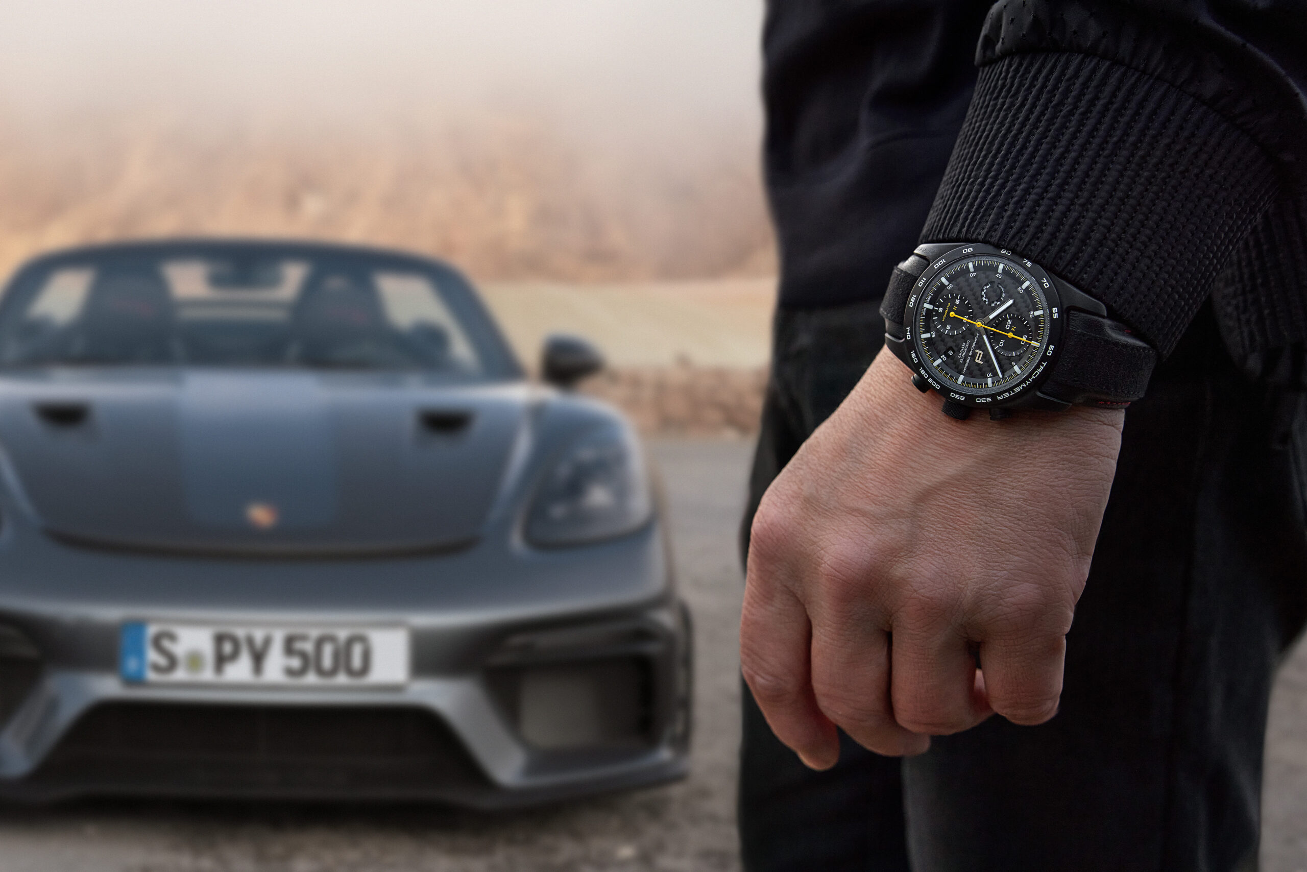 From May 10, 2023, the Porsche Design Chronograph 718 Spyder RS is available exclusively for buyers of the new Porsche 718 Spyder RS and Porsche 718 Spyder RS with Weissach package and can be ordered on porsche-design.com at a starting price of 9,500 euros (RRP) in Porsche Centers worldwide. Customers will receive their chronograph together with a plaque including the limitation number in a high-quality box. The configurator can also be used to enter an individual text for a personal engraving on the plaque. When a 718 Spyder RS with Weissach package and matching chronograph are purchased, the metal is adorned with a “Weissach RS” graphic featuring a stylized test track of the Porsche Development Centre in Weissach