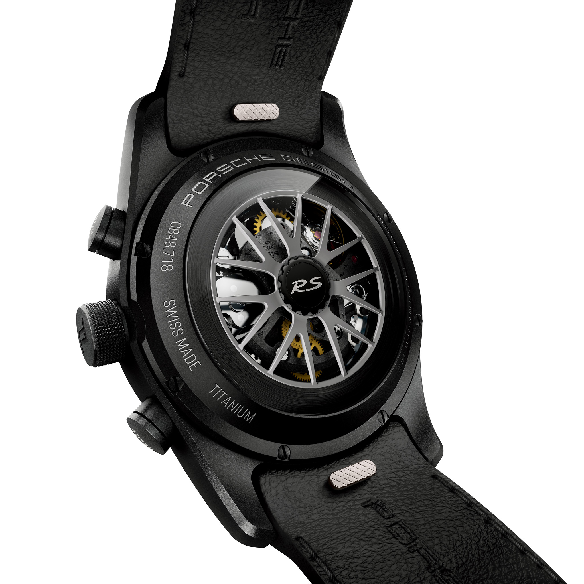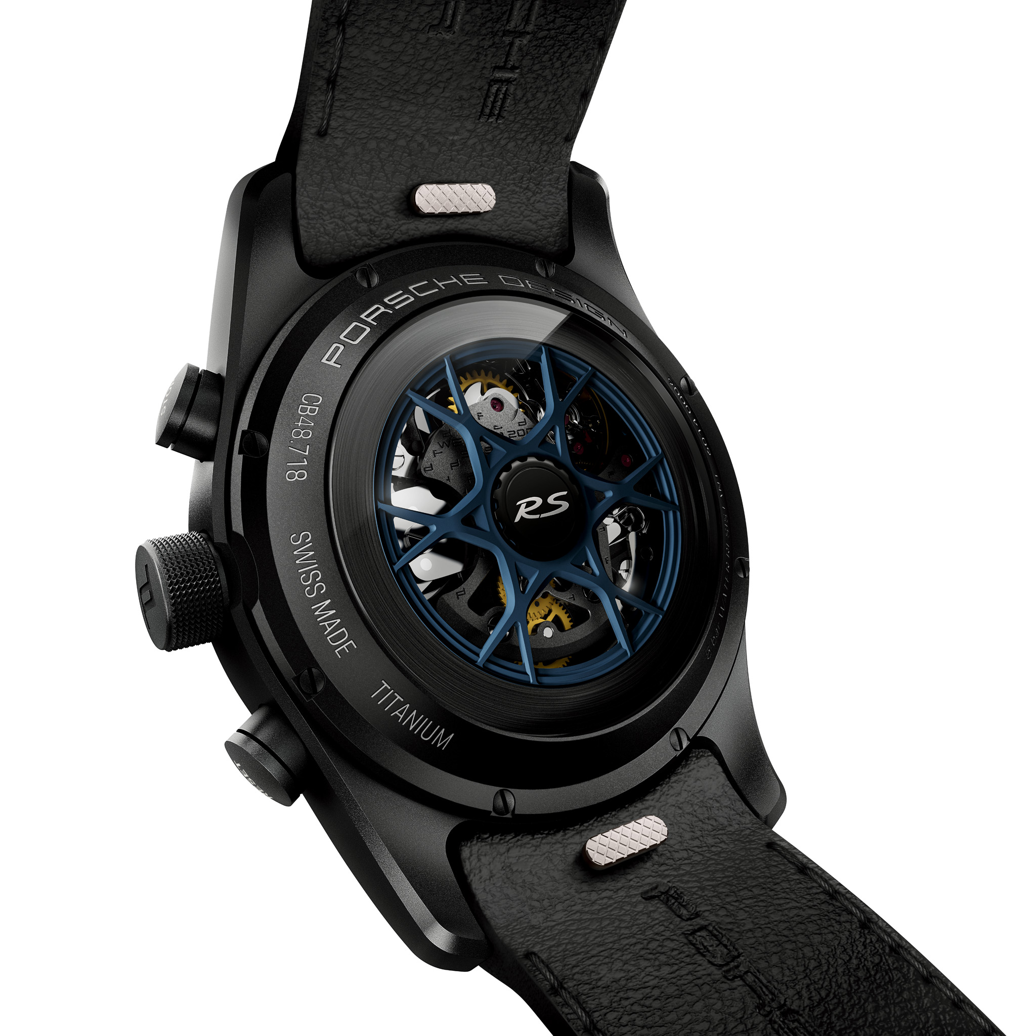 On the back, the Chronograph 718 Spyder RS features a rotor in the look of the Spyder RS wheel. The rear of the counterpart with Weissach package is crowned by a rotor in the look of the lightweight magnesium alloy wheel. In the center of both rotors – available in the colors Brilliant Silver, Aluminum (satin finish), Dark Silver, Neodyme, Indigo Blue, and Black respectively – is the end cap adorned with an “RS” logo in Brilliant Silver. For even more individuality, additional model-specific rotor colors can be selected in the timepiece configurator. The back of the chronograph can also be customized by engraving a text of up to 12 characters – for example, the vehicle identification number (VIN) of the matching roadster.