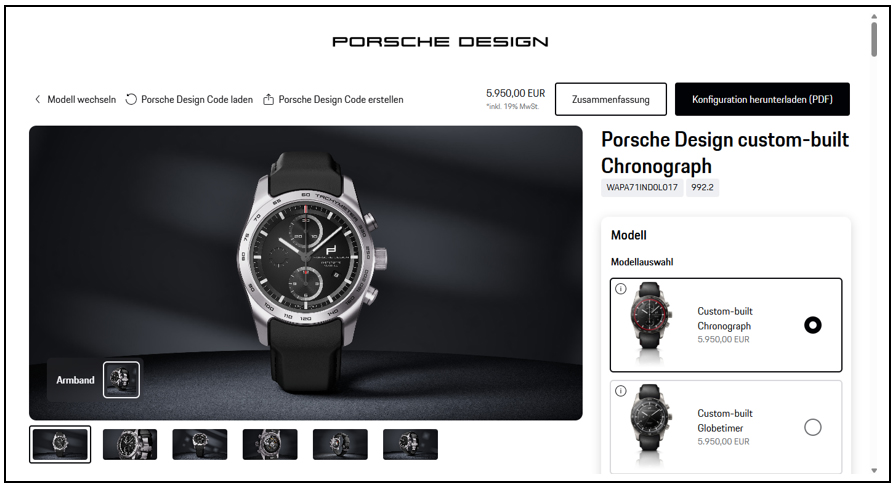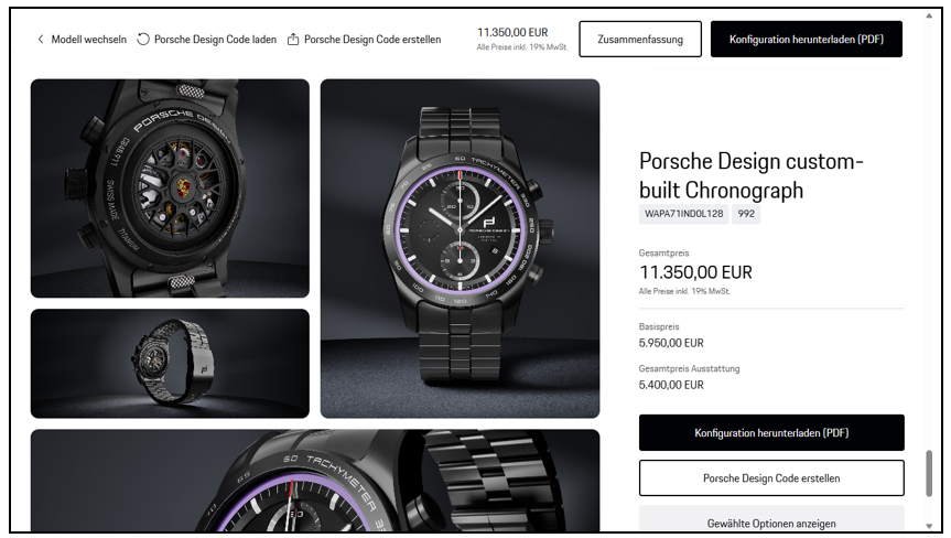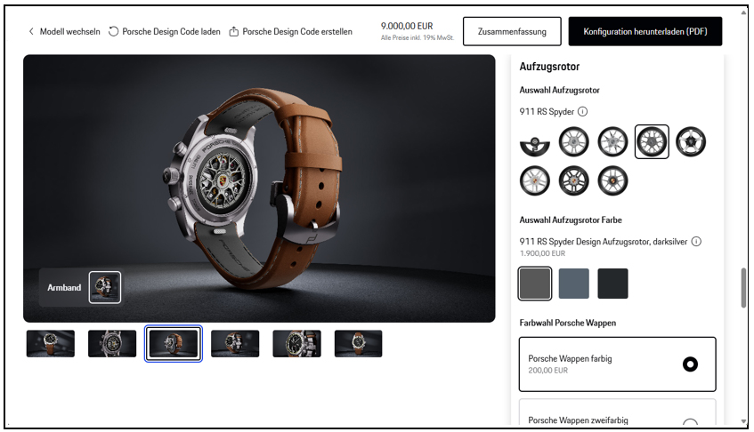 expand and further develop our leading position in the field of exclusive watch personalization. Through the integration of innovative visualization technologies and an optimized user interface, our configurator offers customers a fundamentally improved interaction when creating their dream watch. Following the same principle by which a Porsche 911 can be individualized down to the last detail, our timepieces can be precisely matched to the customer’s vehicle. With the revised configurator, we are opening up a new dimension of tailor-made brand experiences in the luxury segment for Porsche fans and watch aficionados,“ says Stefan Buescher, CEO of the Porsche Lifestyle Group.