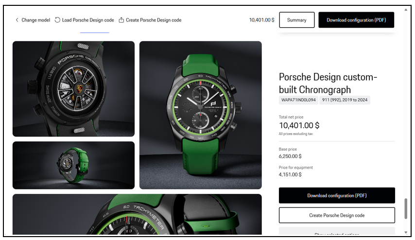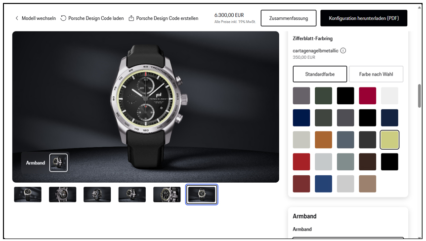 The new web-based Porsche Design Timepieces Configurator (www.porsche-design.com/custom-built-timepieces) is now available. In addition to configuration via the timepieces configurator, interested customers can also design and order their individual timepiece at participating Porsche Centers worldwide.