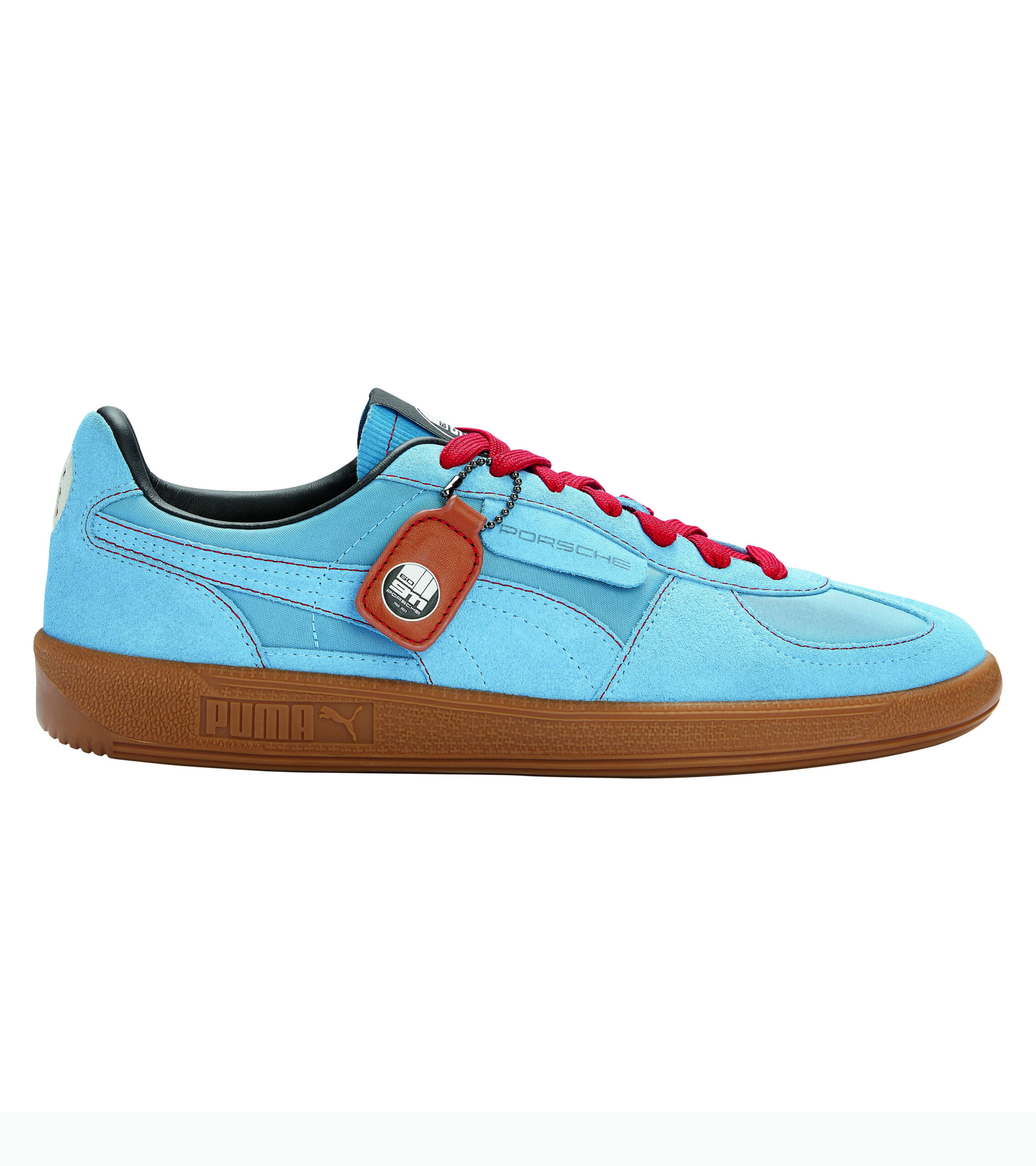 The sneaker models specially designed for the anniversary reflect the impressive history of the iconic sports car: the Retro Sneaker symbolizes the past and the Heritage Sneaker the present of the Porsche 911. Both models are not only limited, but individually numbered, making each pair unique. The stylish Retro Sneaker is characterized by the classic narrow and flat silhouette of the Porsche 911 S 2.5 from 1972. This was one of the first 911s with S and T components, even if it did not yet officially bear the suffix “S/T”. The color scheme of the sneaker in Light Blue is derived from the exterior color of the historic vehicle. The same applies to the starting number 56 on the heel. In addition to the impeccably finished suede overlays in combination with the underlays and the tongue made of smooth leather, the red contrast stitching rounds off the retro look. The sneaker is limited to 1,972 copies in reference to the birth year of the vehicle. The limitation number can be found on the bottom of a leather tab attached to the side of the shoe, with eye-catching Porsche lettering on the top. On the front of the tongue, the so-called grill badge of the Porsche 911 S/T – a round badge on the radiator grille of the vehicle – is applied as a woven label. The grill badge bears the 60 Years of Porsche 911 logo in black and white and also adorns the brown leather tag (hang tag).