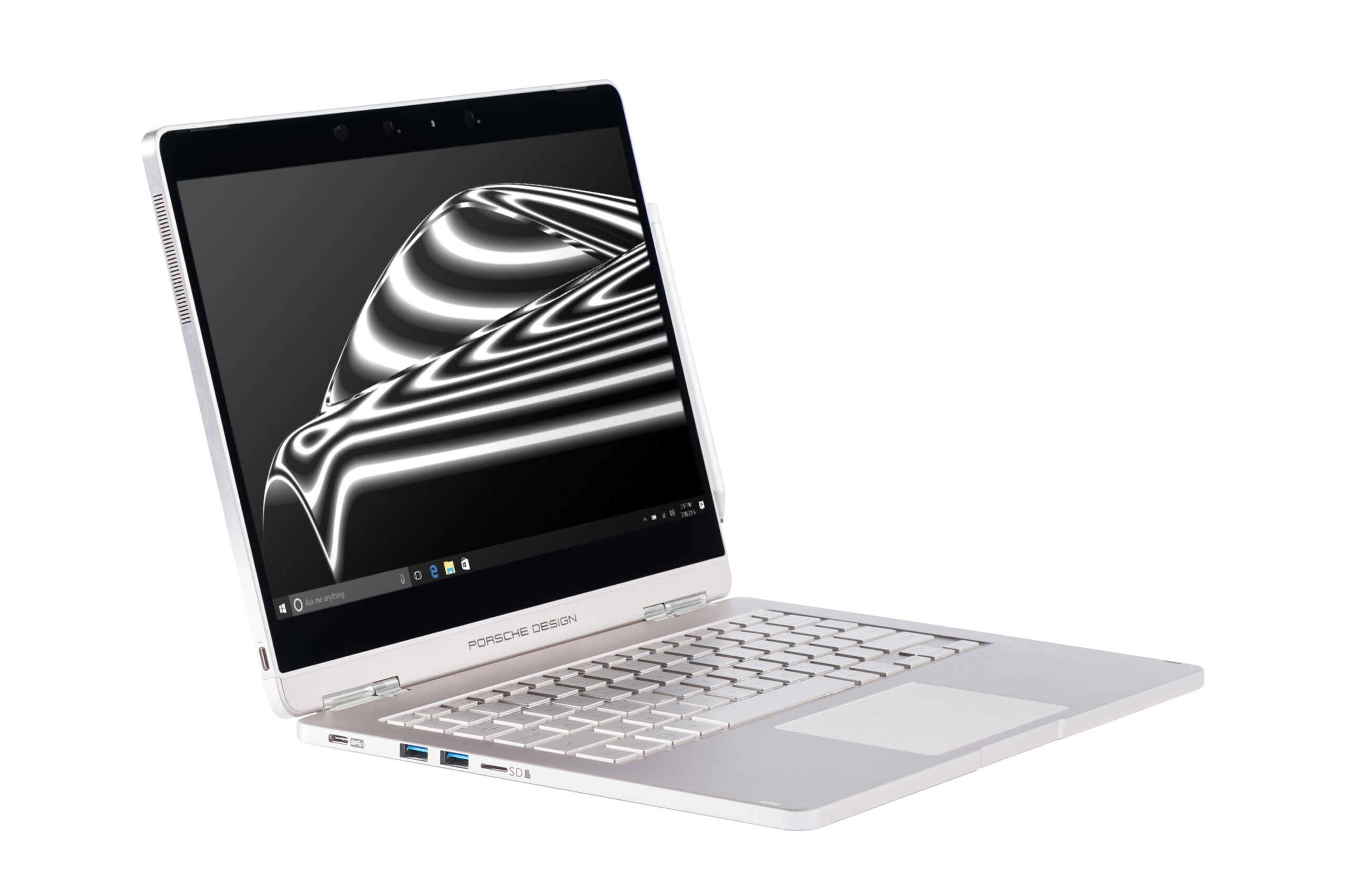 The themes of versatility and ease are further emphasized by the laptop’s cutting-edge input capabilities. Both the touch display and the Precision Touchpad for Windows 10 use high-precision, multi-gesture control interfaces. The keyboard, complete with dimming backlit keys, enables endless use in a variety of settings. And the digital stylus, developed by Studio F. A. Porsche to ensure ideal handling, is optimized for use with Windows Ink, providing a natural writing experience with all the benefits of digital connectivity. In or-der to prevent loss of the stylus, a magnetic holder is int-grated into the right side of the tablet.