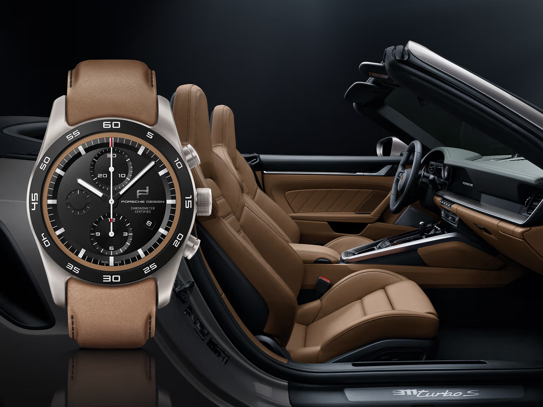 Every custom-built Timepiece can be tailored down to the finest detail—either to match a customer’s Porsche 911 or to reflect their unique creative vision. One of the program’s standout features is its seamless customer journey: clients can transition directly from the car configurator to the timepieces configurator, with selected vehicle specifications automatically carried over and translated into the design of their timepiece. From the case and bezel to the colored dial ring, strap, rotor, and engraving—almost every component offers virtually endless options for personalization. The lightweight titanium case is available in two finishes: glass bead-blasted or black-coated, ensuring both durability and exceptional wearing comfort. In true Porsche Design style, the dial remains matte black, while the color ring around the dial can be configured in 148 original Porsche colors—including all standard 911 finishes as well as custom “Paint to Sample” shades like historic and iconic Gulfblue and Rubystar. Leather straps made from original Porsche interior leather—stitched with the same yarn used in the vehicle—emphasize the direct connection to the sports car. All interior color options available for the 911 can also be selected for the strap. Additionally, titanium bracelets matching the case finish are available. A further highlight: the custom rotor, designed as a faithful miniature replica of the 911’s lightweight alloy wheel—complete with color options and authentic details such as the center-lock or wheel hub cap featuring the Porsche crest. Alongside the chronograph caliber WERK 01.100, the program has also offered the WERK 04.110 with Globetimer function since last year. This innovative world time complication enables the display of a second time zone and offers the intuitive usability Porsche Design is known for. All Porsche Design movements are COSC-certified, guaranteeing outstanding precision. A customized laser engraving on the case back—such as the Vehicle Identification Number (VIN)—adds a final, personal touch. Every timepiece is handcrafted exclusively to order at Porsche’s watch manufactory in Solothurn, Switzerland.