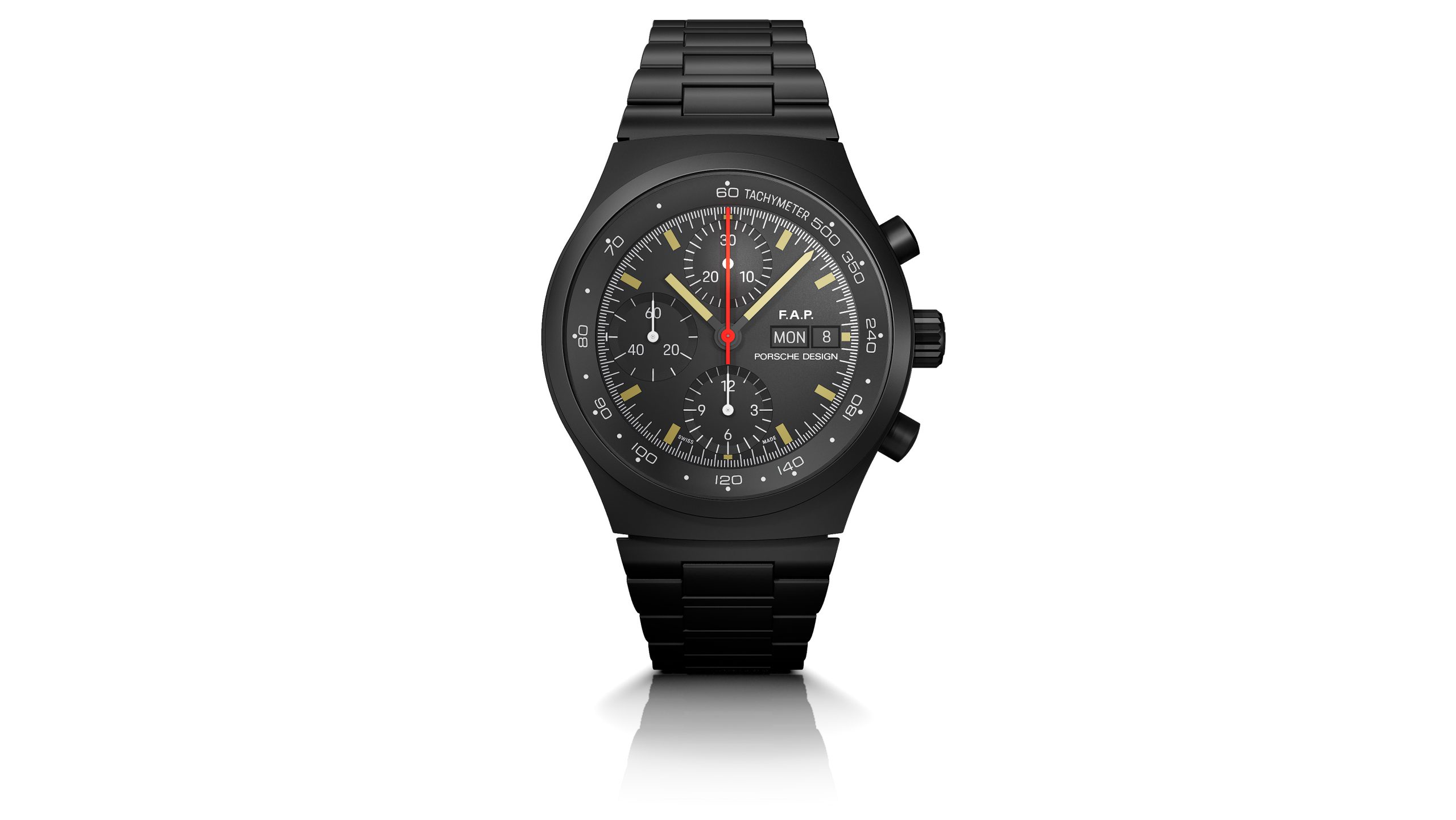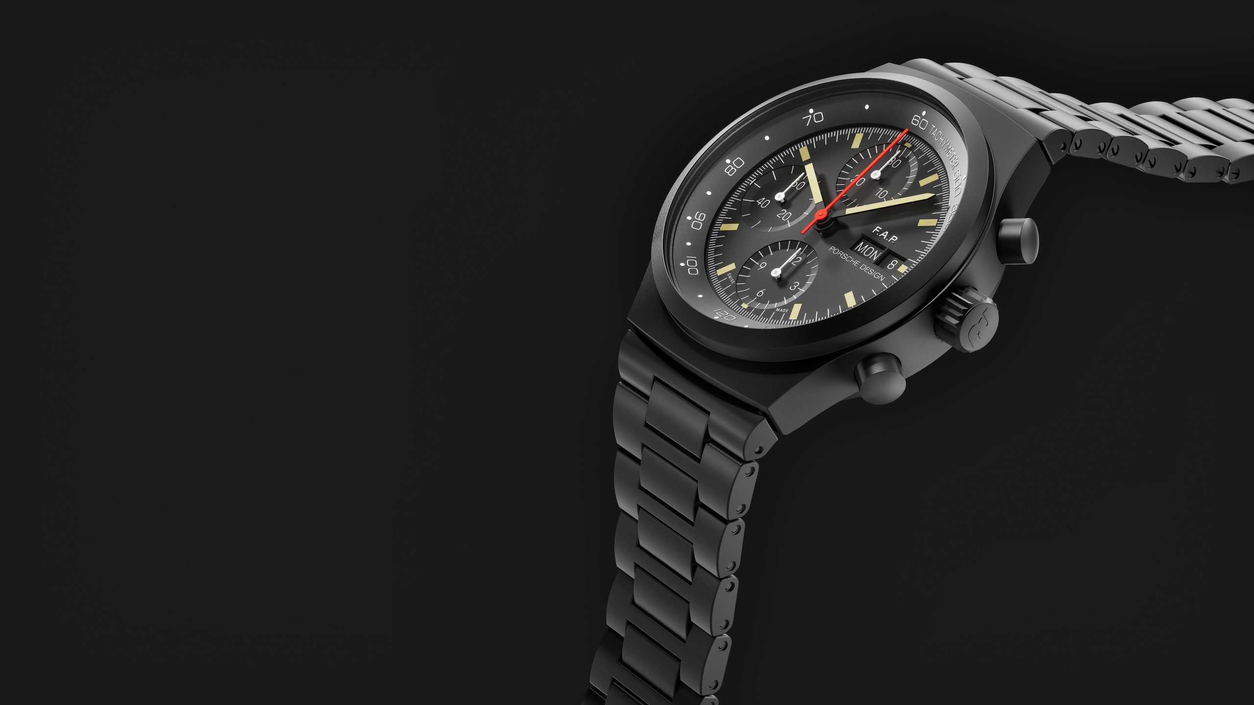 The exceptional timepiece is based on the Chronograph 1 – 1972 Limited Edition, which Porsche Design reissued in 2022 to mark its 50th anniversary. It faithfully replicates the original in every visual detail while featuring state-of-the-art technology. The design was inspired by the dashboard of the Porsche 911. F. A. translated its functional aesthetics into the Chronograph I – featuring a black-coated case and metal watchstraps, a matte Black dial, fluorescent white hands and indices, and a striking red stop-seconds hand – thereby creating the world’s first entirely Black timepiece.