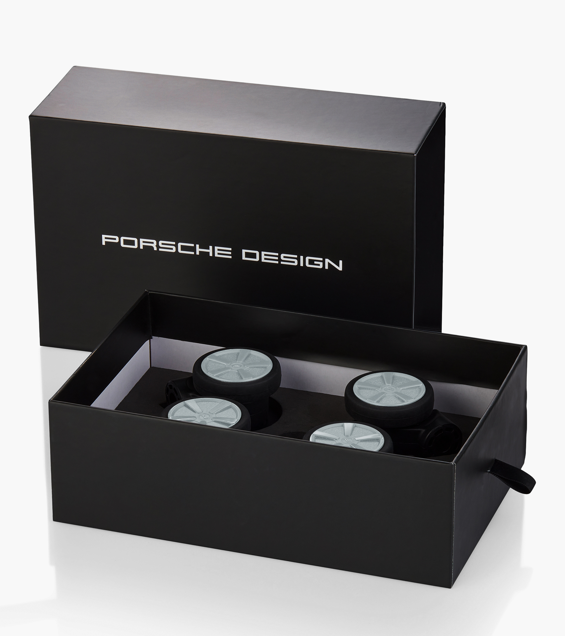 The handles, crafted from premium genuine leather, are available as a set for both the top and side carry positions, combining exceptional tactile comfort with artisanal precision. Visible stitching and subtle padding ensure a refined handling experience while underscoring the product’s elevated aesthetic. Personalization is further enhanced by a detachable name tag made from genuine leather. The leather tag can be attached to one of the handles and features an address field in case of loss. Optional personalization through embossed initials is available in Porsche Design stores. The wheels, too, follow a functional design ethos while offering various configuration options. The set of four high-quality double wheels, equipped with precisely engineered ball bearings, is designed for maximum smoothness and performance, with a design inspired by the Porsche Carrera Classic wheel. All personalization elements are available separately and can be freely combined.