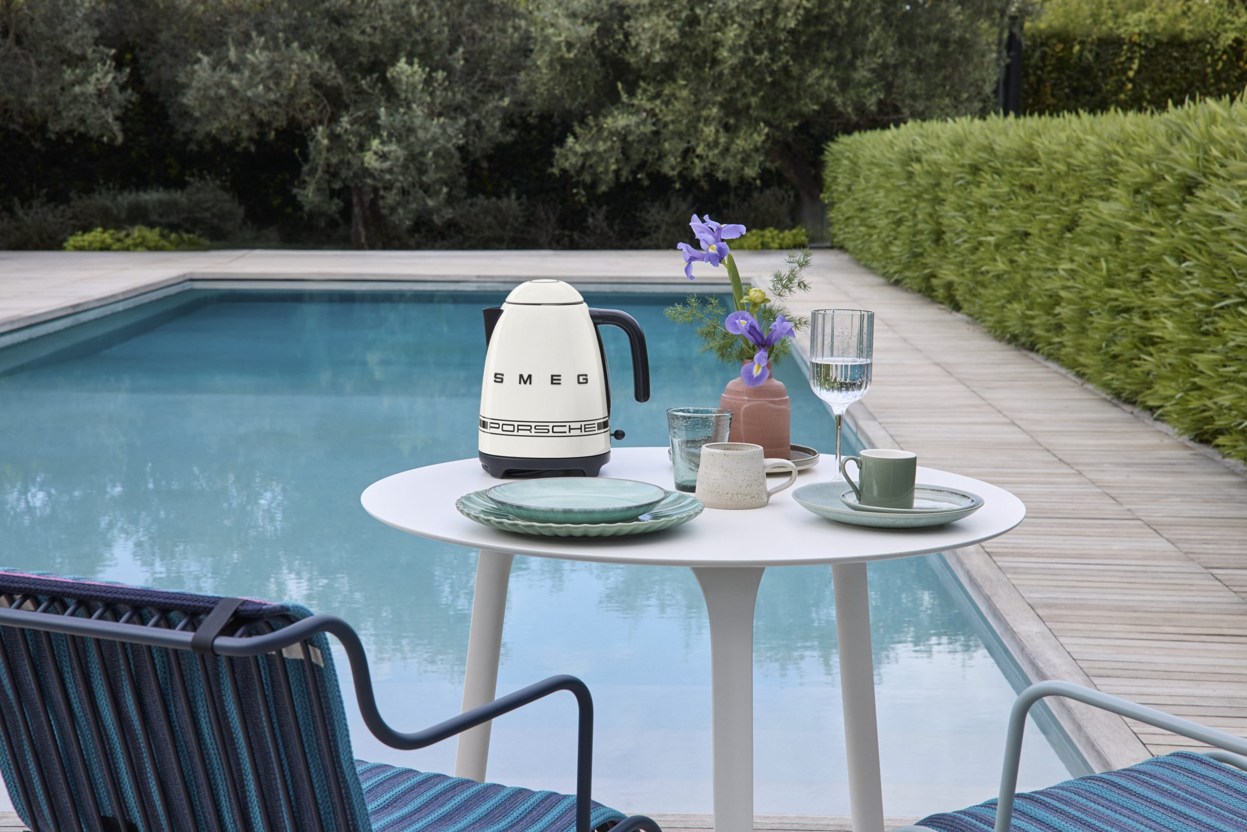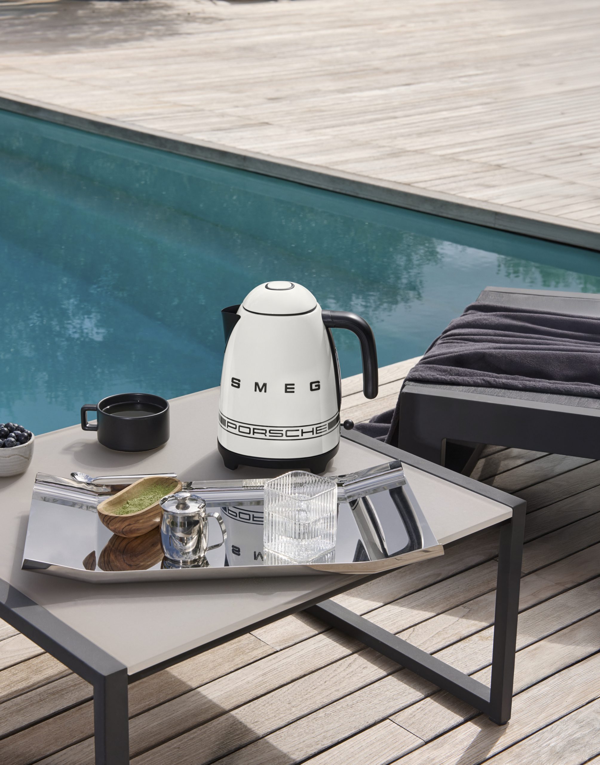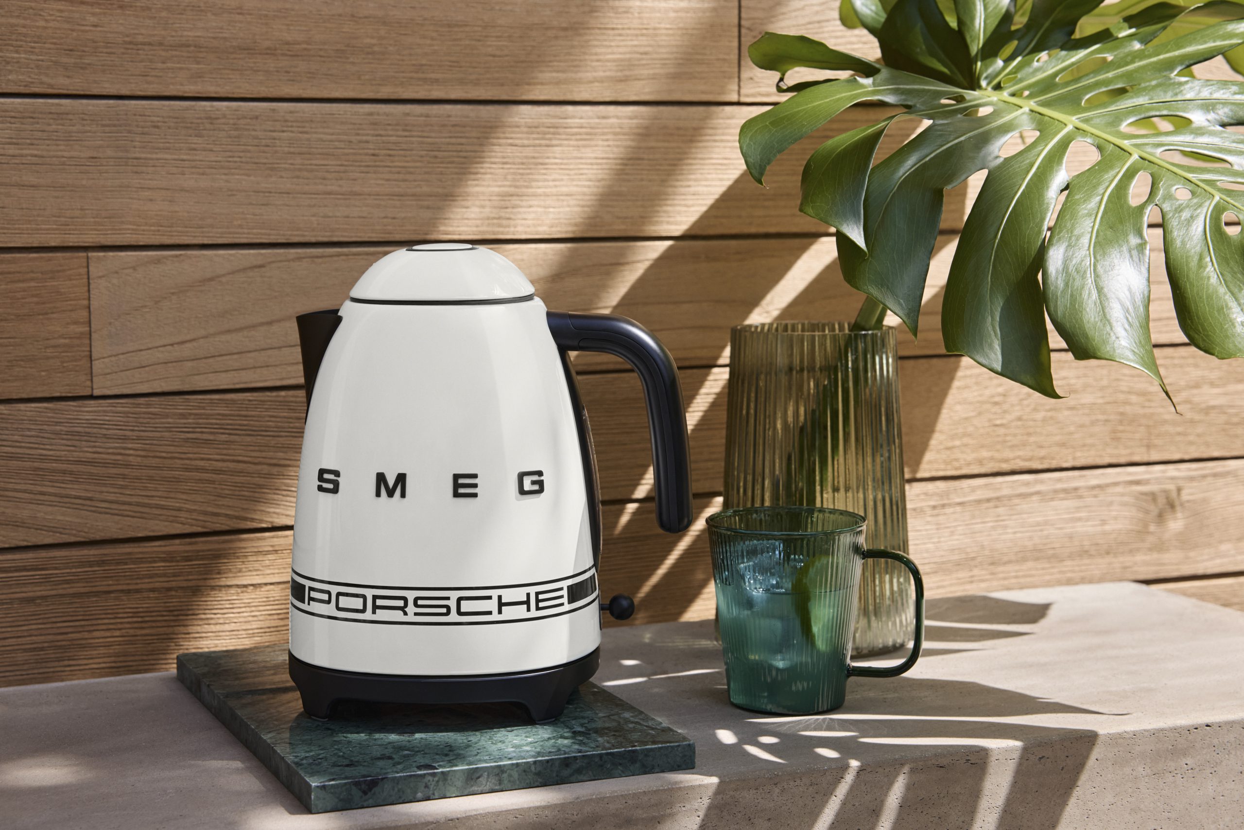 Kettle – Porsche x SmegThe Kettle – Porsche x Smeg, blending functionality with design. Ideal for preparing any hot drink, it combines Smeg’s 50s style with Porsche’s iconic design. It features the signature Porsche stripe across the Carrara White Metallic and Shade Green Metallic body, with matte black accents on the handle, base, and spout. Custom numbering on the temperature gauge and Porsche-inspired icons add distinctive touches. With a 1.7L capacity — enough for 7 cups — it suits both solo moments and gatherings. The „Soft Opening“ lid ensures smooth use, and the removable stainless steel limescale filter keeps water clean. The 360° swivel base allows flexible positioning, and the kettle automatically switches off at 100°C for safety.