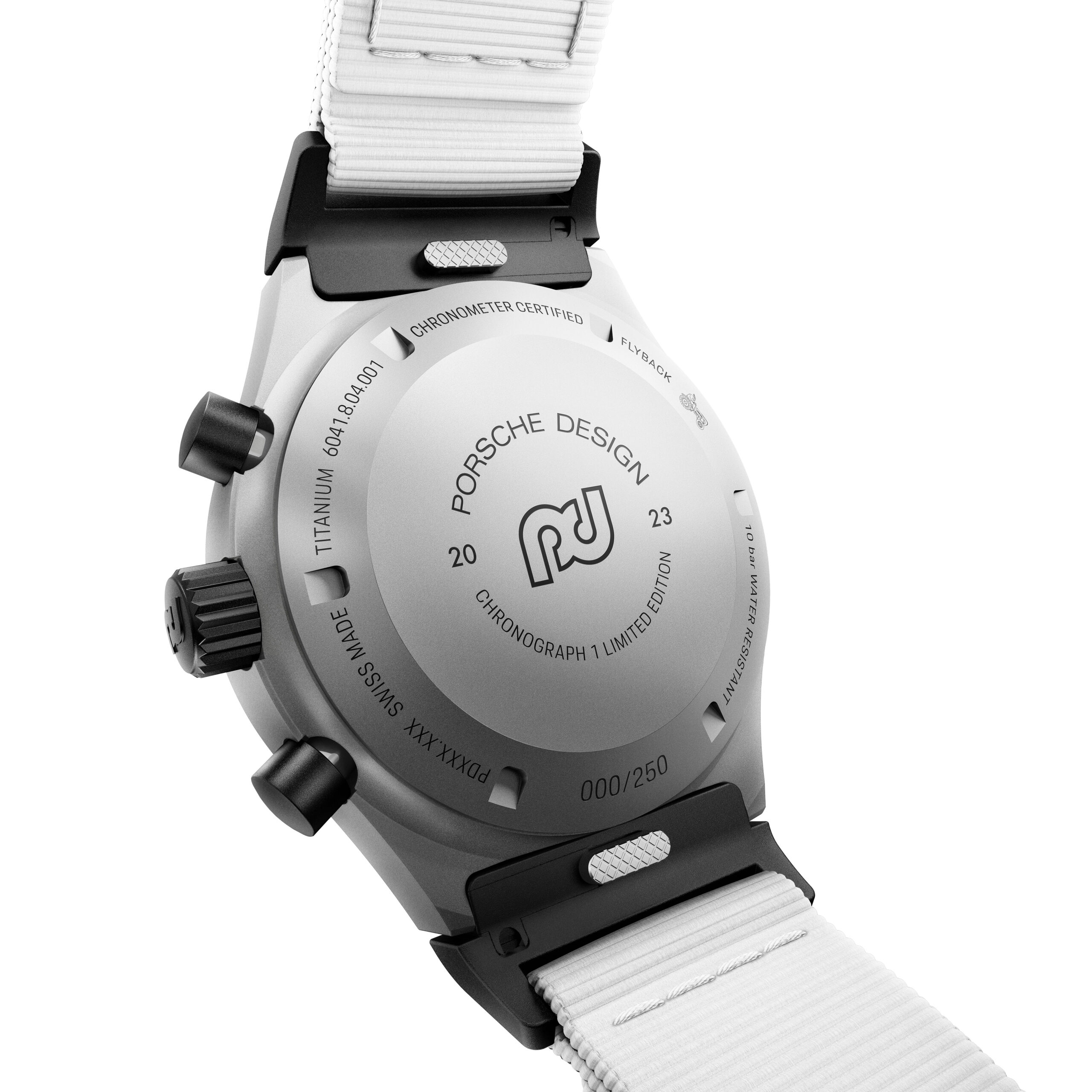 The focus in the development process of the new Chronograph 1 – GP 2023 Edition was on optimizing its function as a timekeeping instrument and on the racetrack. The design of the GP timepiece is faithfully based on its iconic model from 1972, which was derived from the aesthetics of the dashboard of the Porsche 911. Fluorescent hour indices and exceptionally bright Super-LumiNova® luminous material create a maximum contrast on the matte-black dial. Together with the seven-fold antireflective, scratch-resistant sapphire crystal with hard coating, this ensures optimal readability. But it would not be a “genuine” timepiece in the sense of the Porsche Design founder if its functionality and refined design details had not been further developed in crucial places: the pointed minute hand (rectangular in the original), the red stop hands (white in the original), and the uncoated silver titanium case. The latter is more than an innovative design statement of the young generation that makes this limited edition of the Chronograph 1 unique. Rather, the goal here is to reduce weight. A highly precise drive is produced by the WERK 01.240 caliber with flyback function and COSC certification, innovative quick-switch date display, and bilingual day display. The case is dynamically water-resistant to 10 bar and has a diameter of 40.8 mm. As a reminder of the original, the historic Porsche Design logo can be found on the dial, crown, and clasp as well as on the back of the case. In addition to the edition number, another highlight is a laser engraving of the GP logo: a Yeti sitting on a tractor. The bezel has a 60-minute scale, and the controls are in contrasting black.