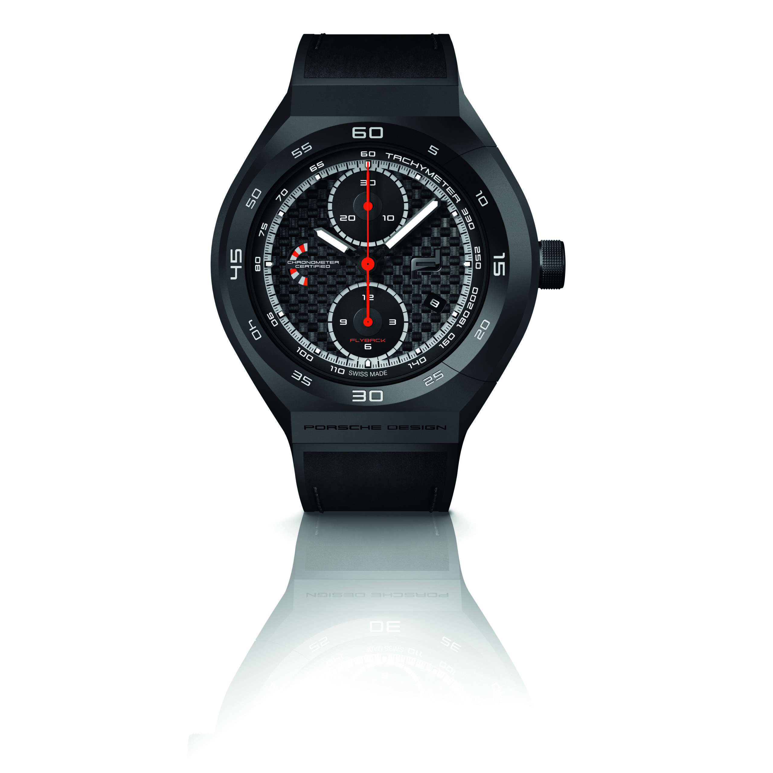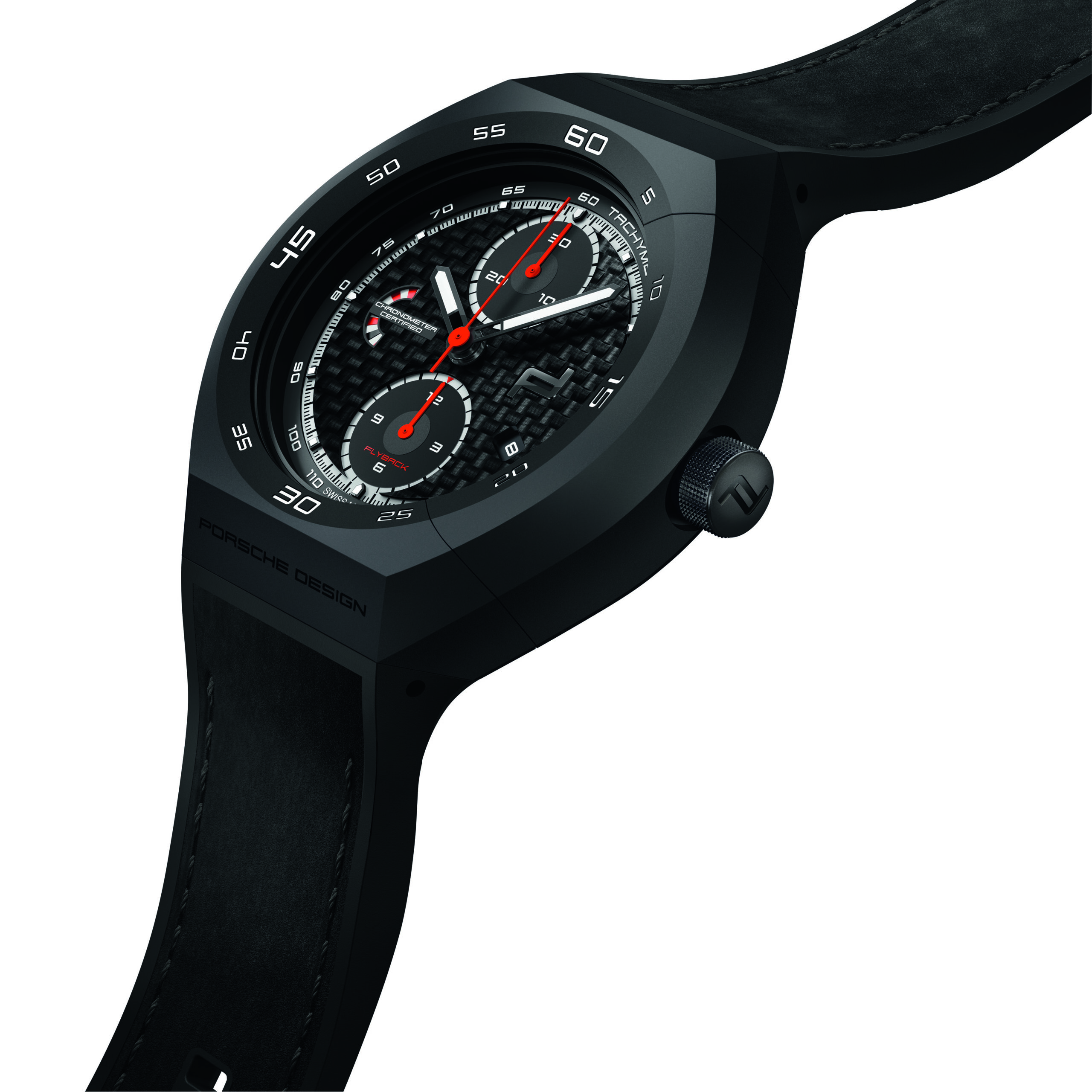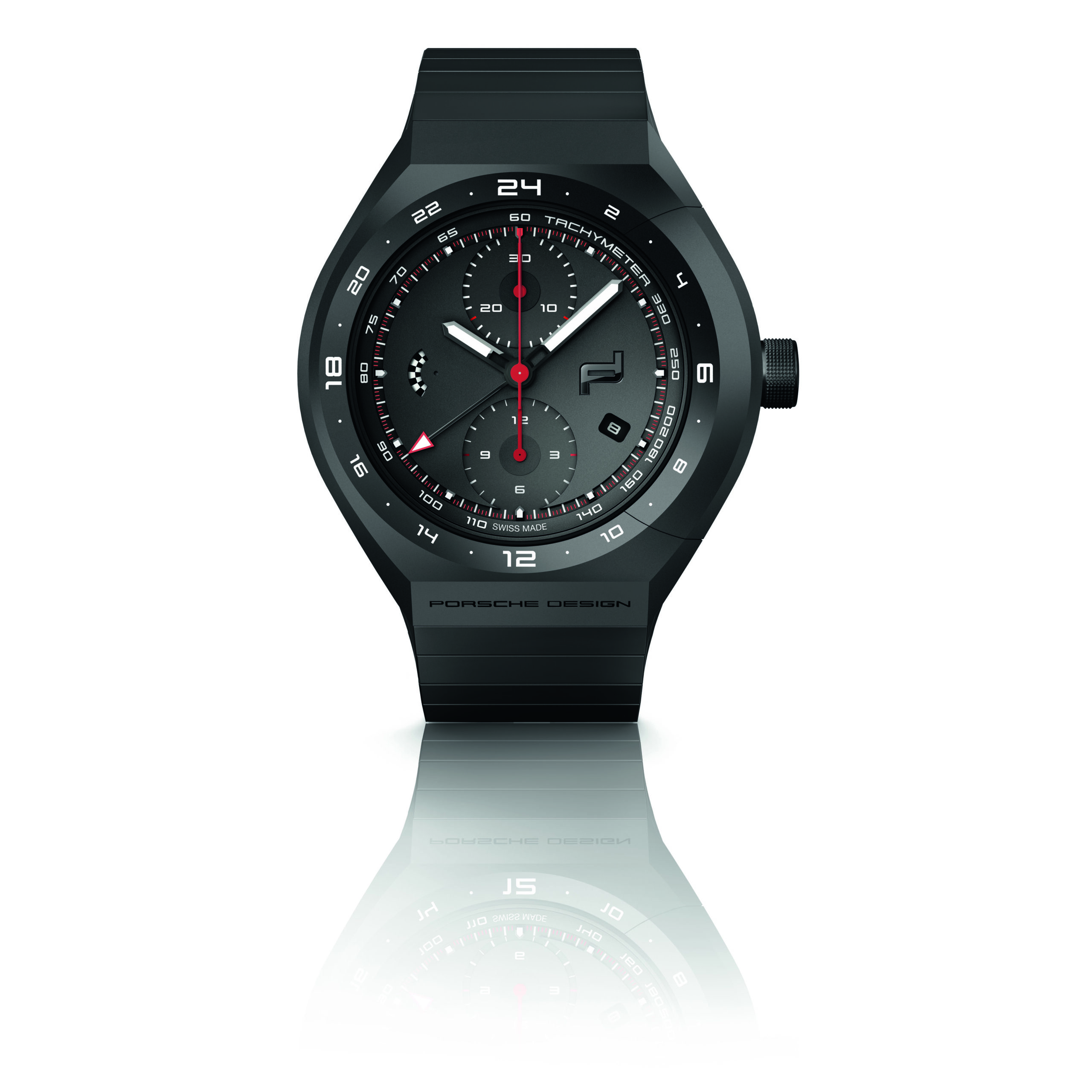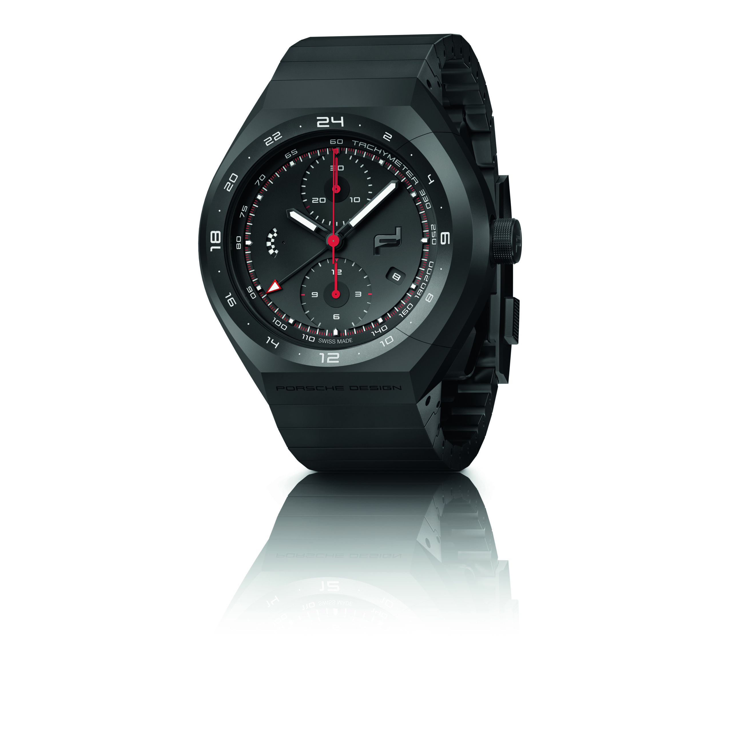 Porsche Design has been innovating and utilizing titanium since 1980, and the new Monobloc Actuator 24H–Chronotimer is no exception. Debuting in an inventive 45.5 millimetre titanium case, pressure-resistant to 10 bar, its black titanium-carbide coat-ing lends a sporty, enduring quality to the watch. The case surrounds a matte-black dial with a mechanical function display at “9 o’clock”, central chronograph second, thirty-minute counter at “12 o’clock as well as twelve-hour counter at “6 o’clock”. A date window is integrated at “4 o’clock”. The tachymetric scale on the outer rim of the dial enables the wearer to calculate average speed. The 24-hour display is applied onto the bezel. As the watch’s engine, the Swiss ETA Valjoux 7754 automatic chronograph calibre beats at 4 Hz, amassing a 48-hour power reserve. Its personalized rotor puts the Porsche Design icon in the spotlight, as both can be admired trough a panel of sapphire crystal in the case back.
