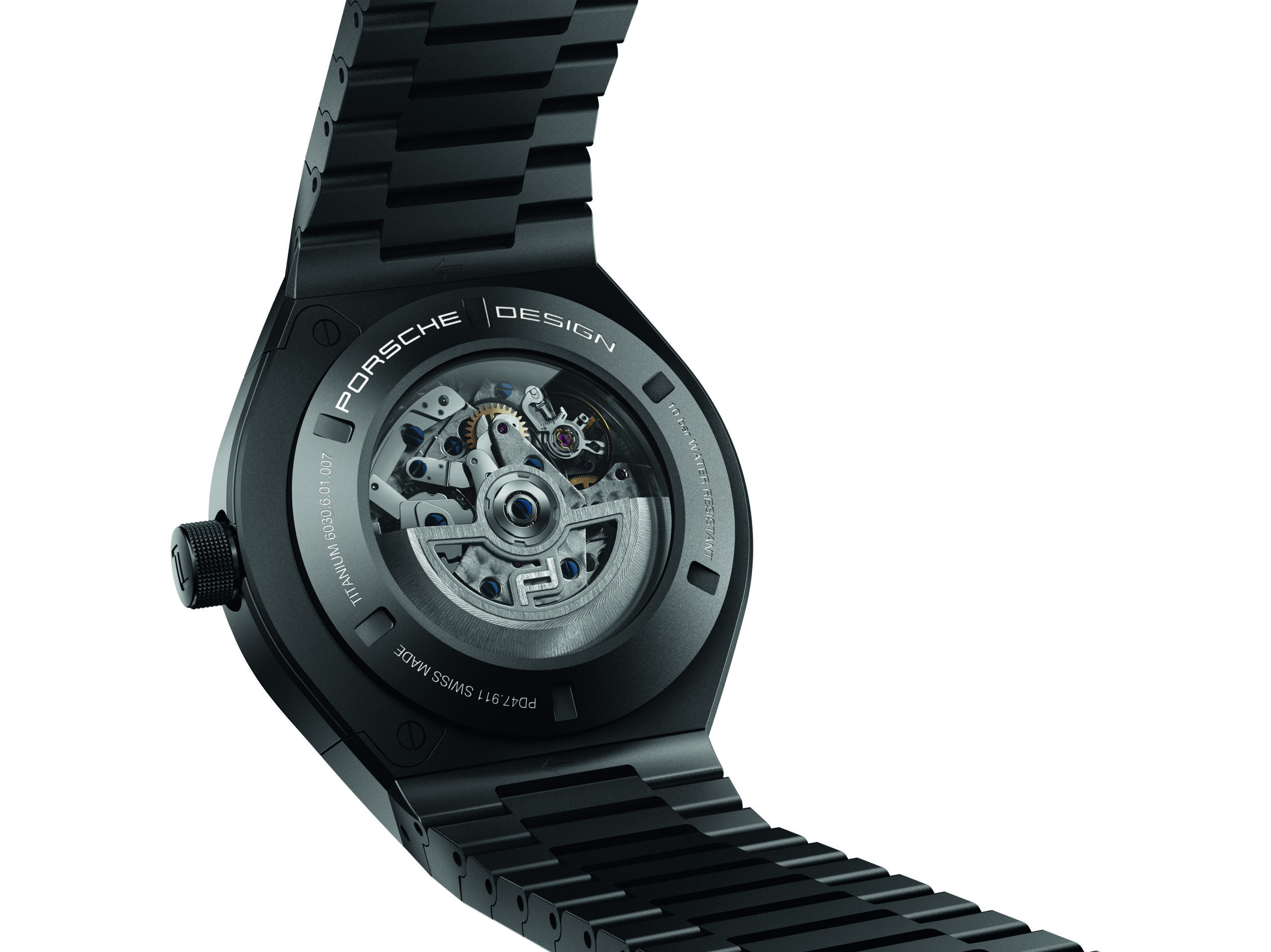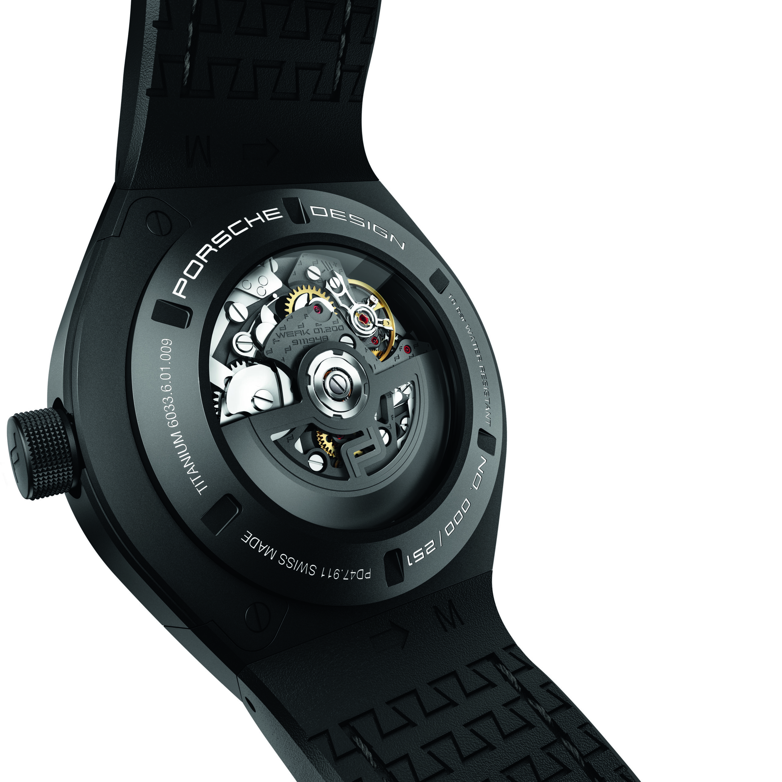 Werk 01.200, introduced by Porsche Design in 2017, serves as a „high-tech engine“ in the 45.5-millimeter titanium case. The chronograph calibre, whose excellent precision rate is certified by a COSC certificate, features a flyback mechanism. In racing, this complex additional function is crucial, since it allows the measurement of successive intervals, for example, with lap times or pit stops. Ticking at 4 Hz, the automatic movement is the result of the brand’s engineering and horological competence and the transfer of intelligent technologies from racecar development. Manufactured using state-of-the-art production methods, it guarantees reliability and precision with every second. The movement’s open-worked barrel bridge implements Porsche’s light-weight construction philosophy, while also offering a clear view of the flyback function and gear train. The energy-optimised rotor, visible through the case back’s sapphire crystal, is PVD-coated and equipped with a weight crafted from tungsten. Though difficult to process, tungsten provides the necessary weight required to guarantee powerful winding.