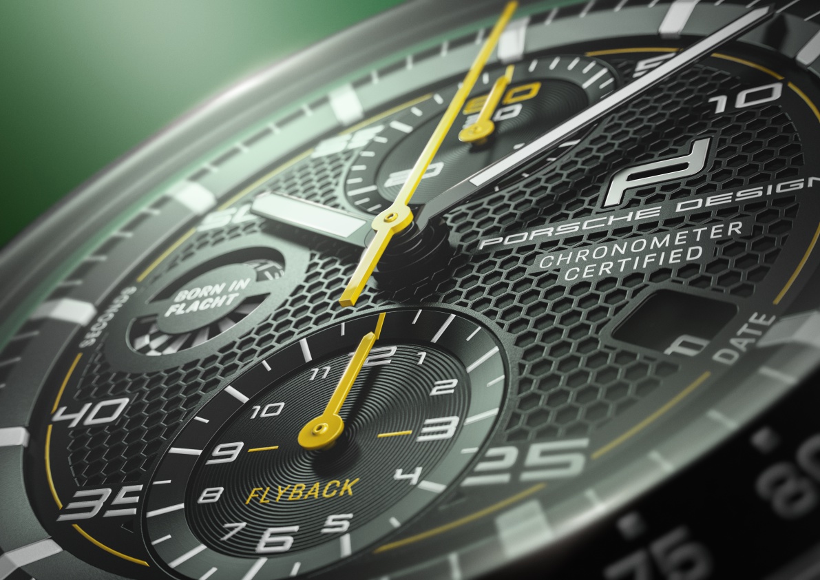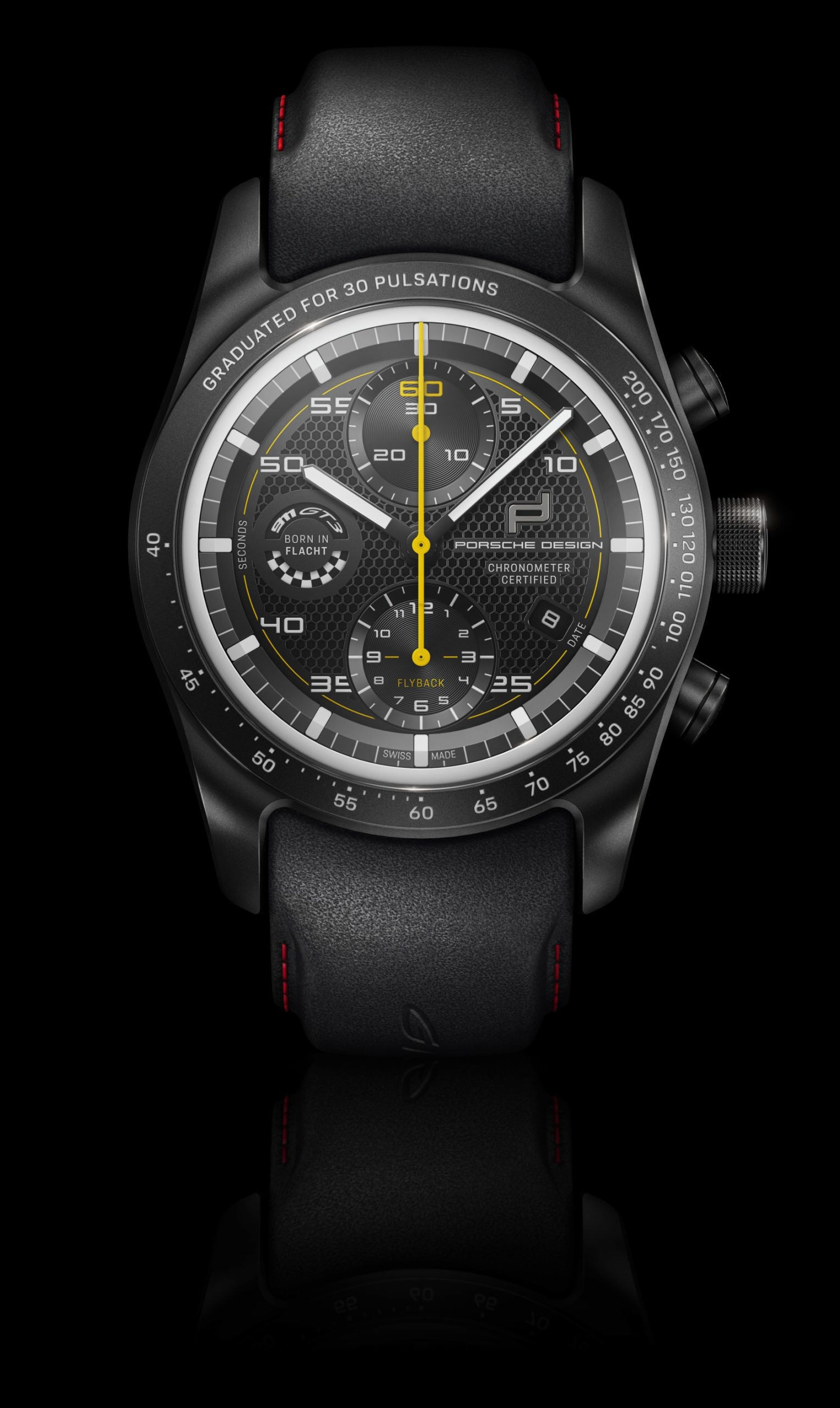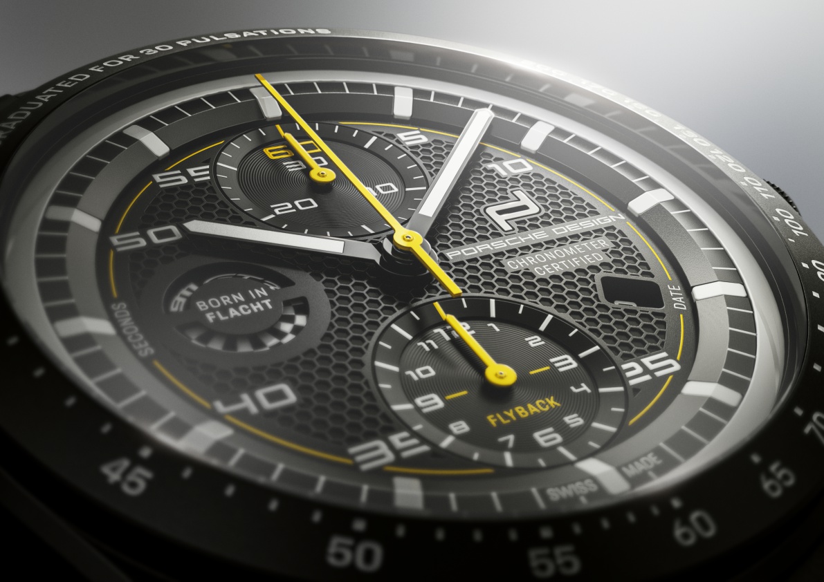 The case of the “sports car on the wrist” is made of ultra-light titanium and is available in a glass-bead blasted version or with an optional matte black titanium carbide coating. The functionality of the timepiece rivals the precision of a sports car: The Porsche Design caliber WERK 01.200 with COSC certification has a flyback function that can be used to stop, reset and restart a running time measurement at the touch of a button. The bezel can be fitted with either a pulsometer, tachymeter or minute scale. The pulsometer version makes it possible to measure the pulse mechanically – without a battery or disturbing magnetic fields.