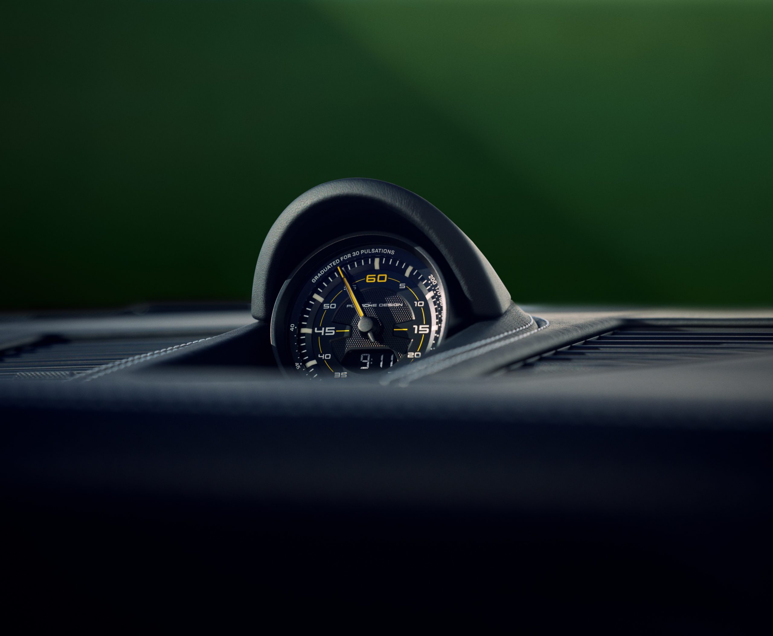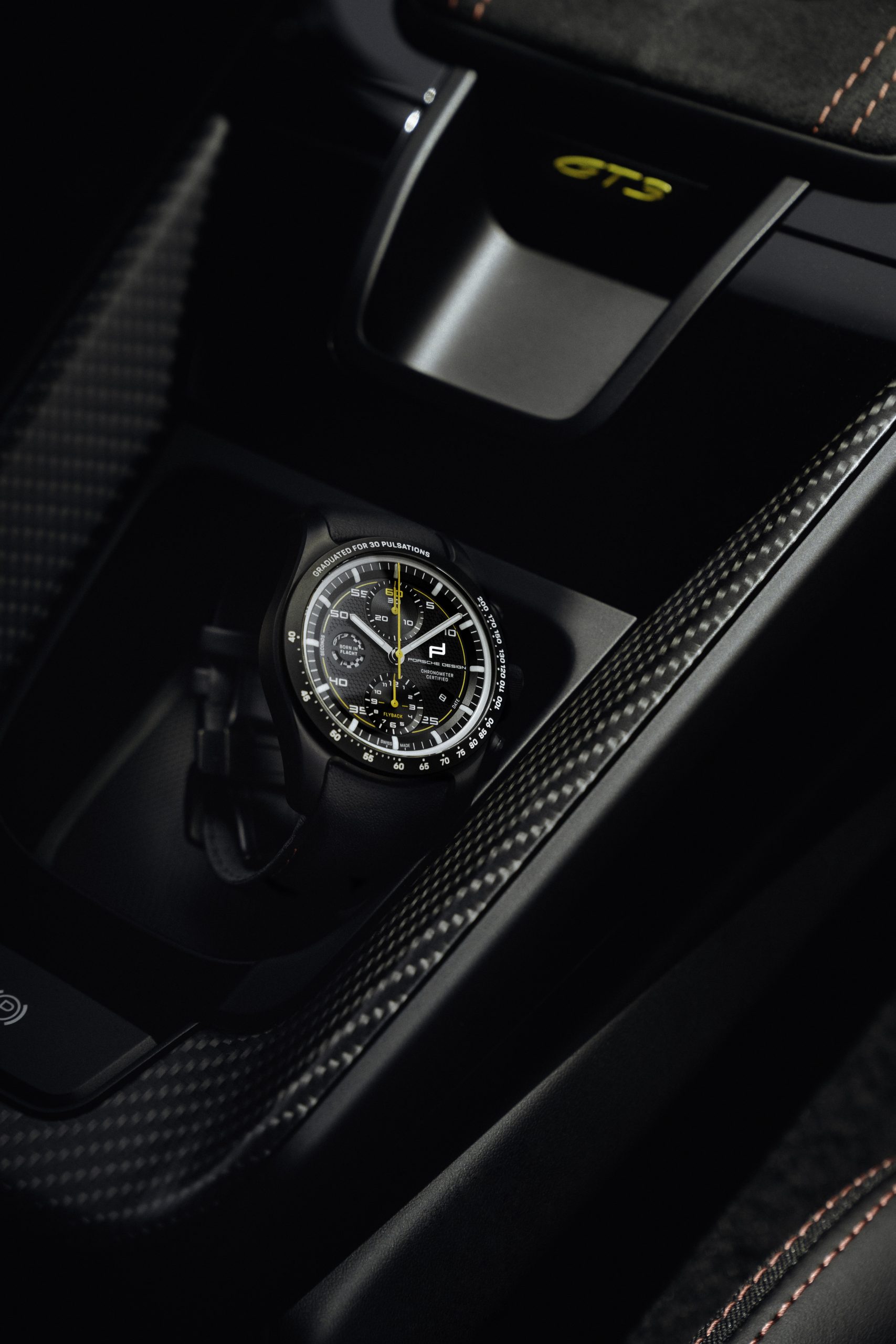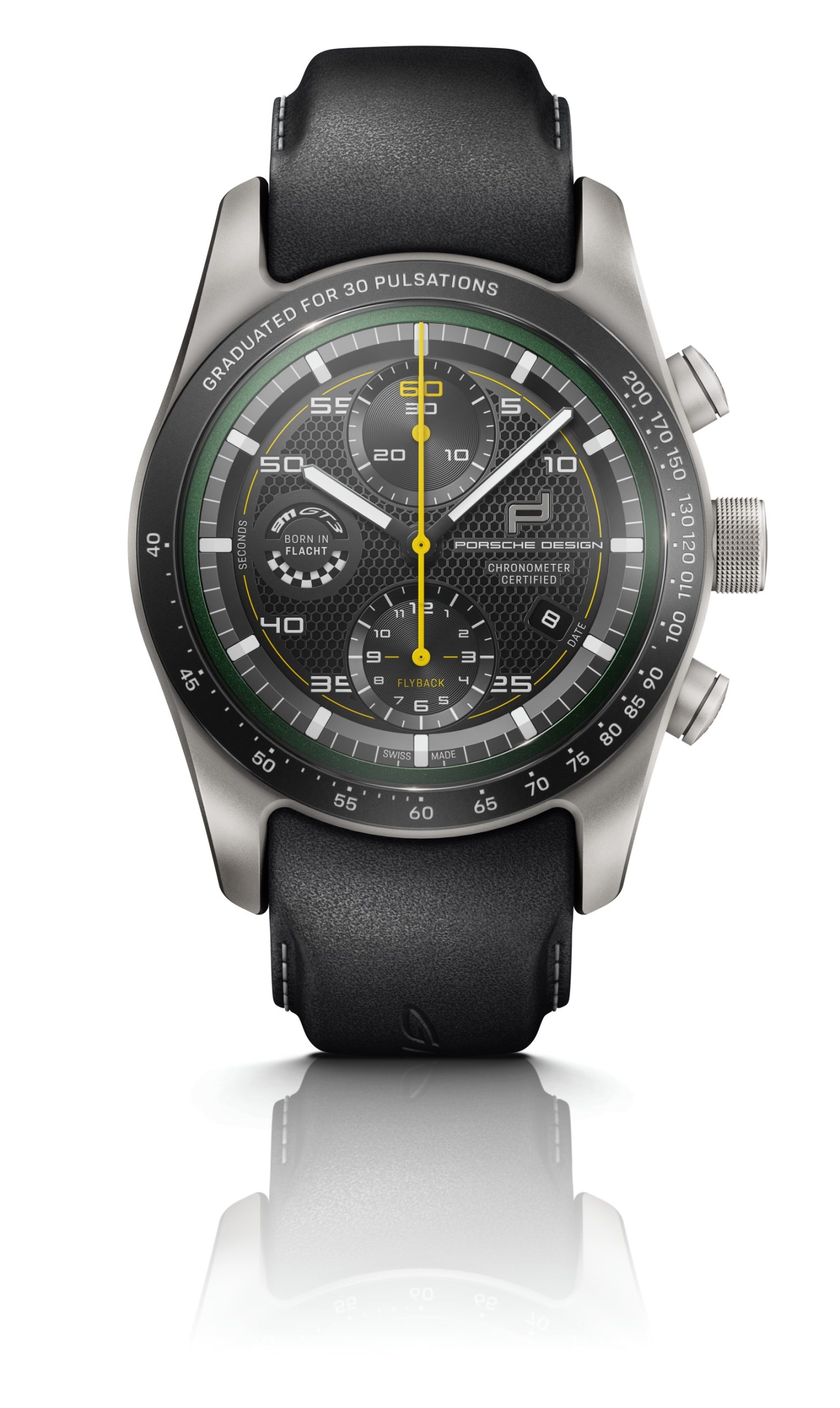 The case of the “sports car on the wrist” is made of ultra-light titanium and is available in a glass-bead blasted version or with an optional matte black titanium carbide coating. The functionality of the timepiece rivals the precision of a sports car: The Porsche Design caliber WERK 01.200 with COSC certification has a flyback function that can be used to stop, reset and restart a running time measurement at the touch of a button. The bezel can be fitted with either a pulsometer, tachymeter or minute scale. The pulsometer version makes it possible to measure the pulse mechanically – without a battery or disturbing magnetic fields.