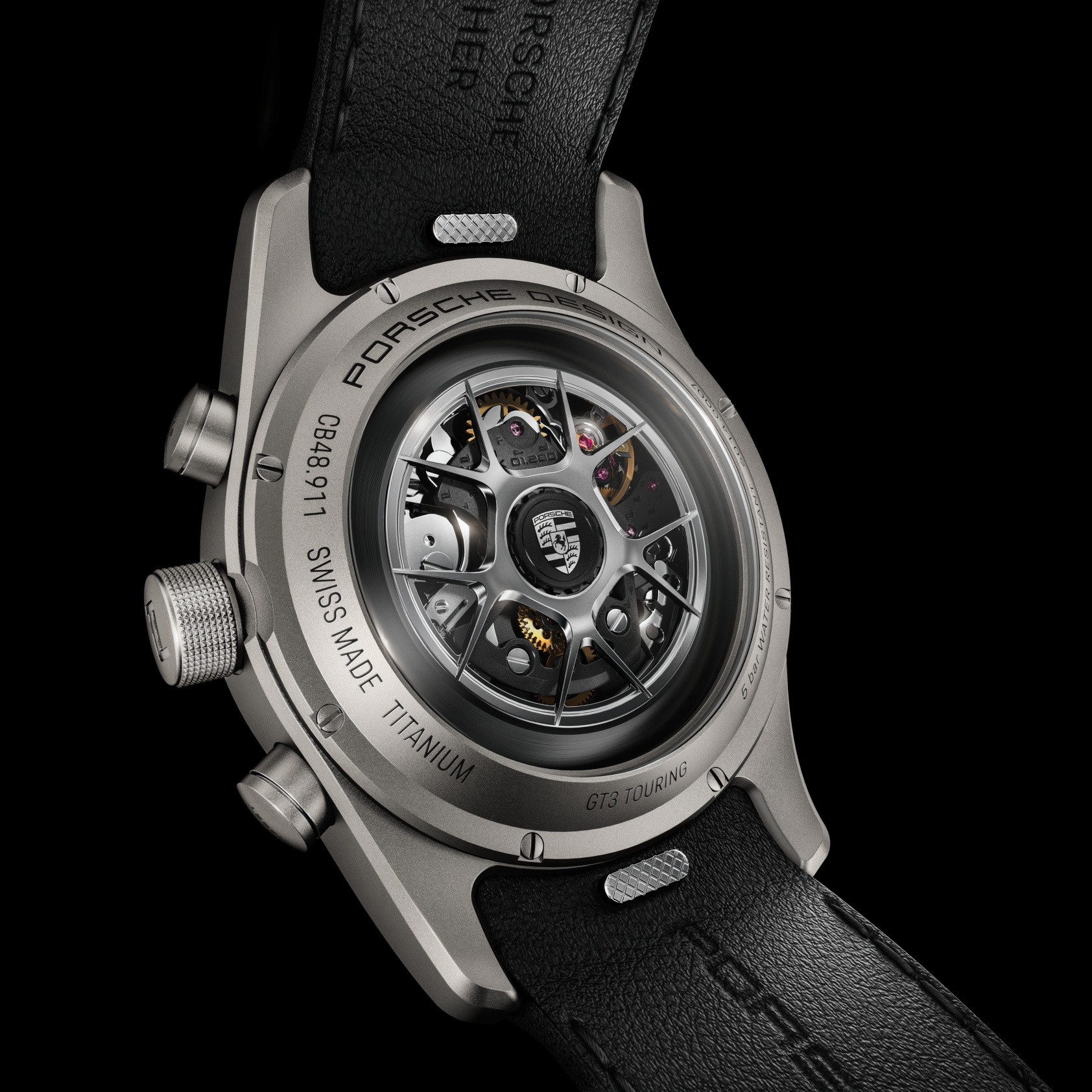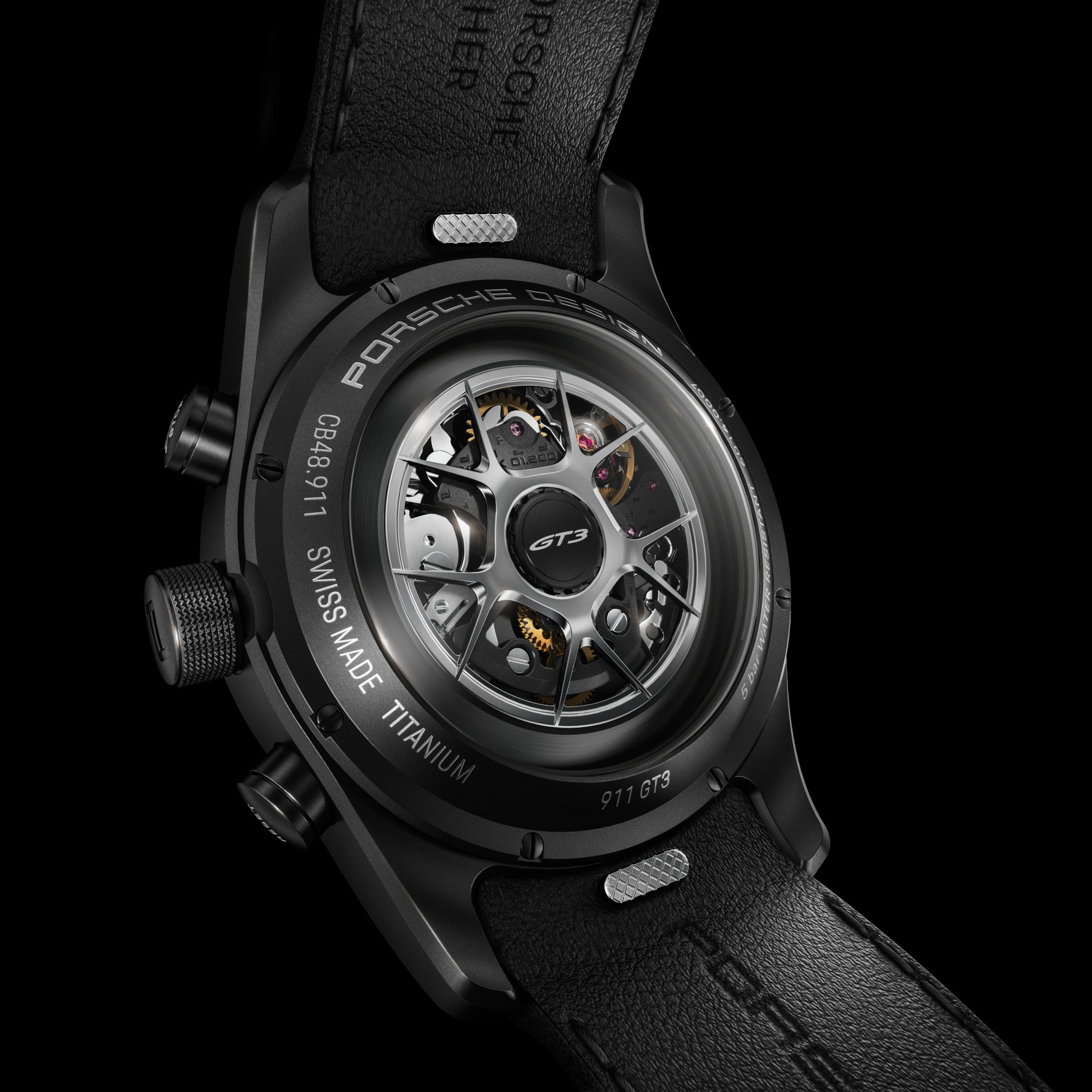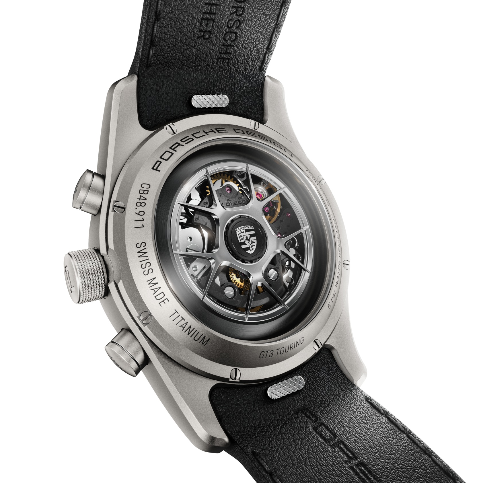 The strap of the Chronograph 911 GT3 or 911 GT3 Touring is made of original Porsche vehicle leather and yarn and can be designed to match the individual configuration of the vehicle interior. An optional “GT3” engraving at 6 o’clock emphasizes the connection between vehicle and watch. The calfskin straps with titanium double folding clasp (in case finish) are available in various sizes and can be easily exchanged thanks to a quick-change mechanism. Alternatively, there is a titanium bracelet with a titanium folding clasp with fine adjustment in case finish (glass bead blasted or with black titanium carbide coating).
