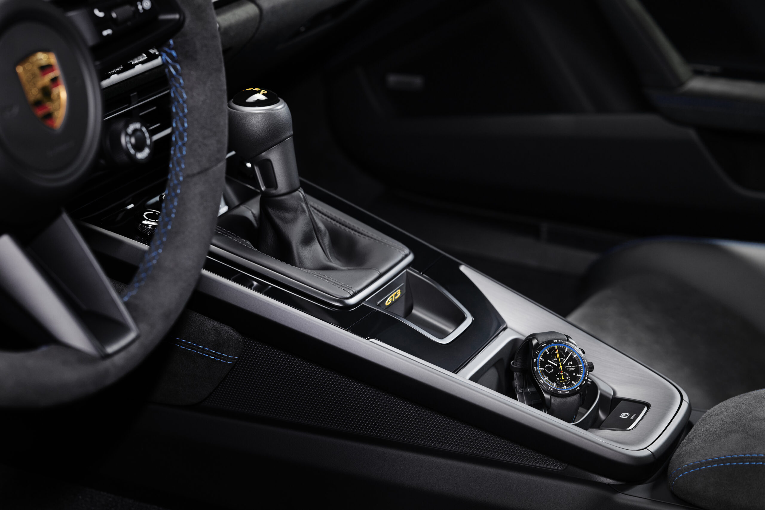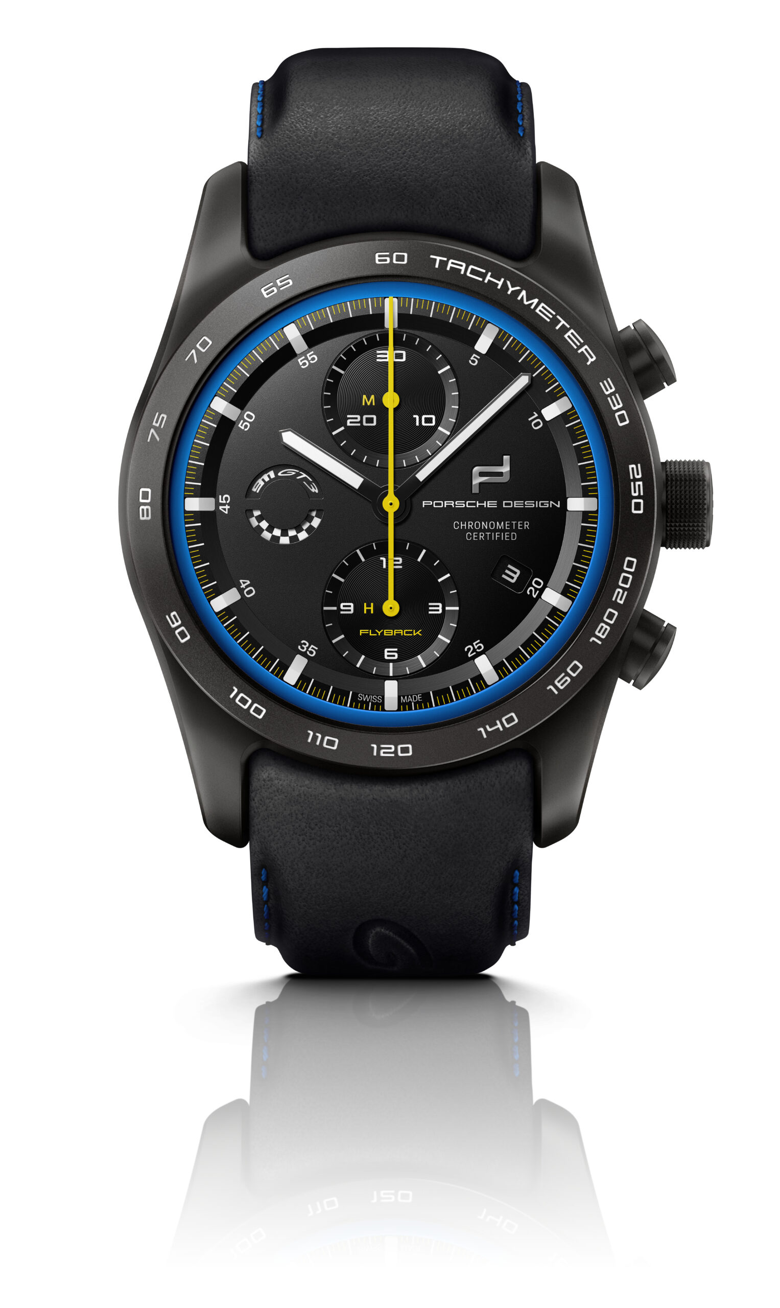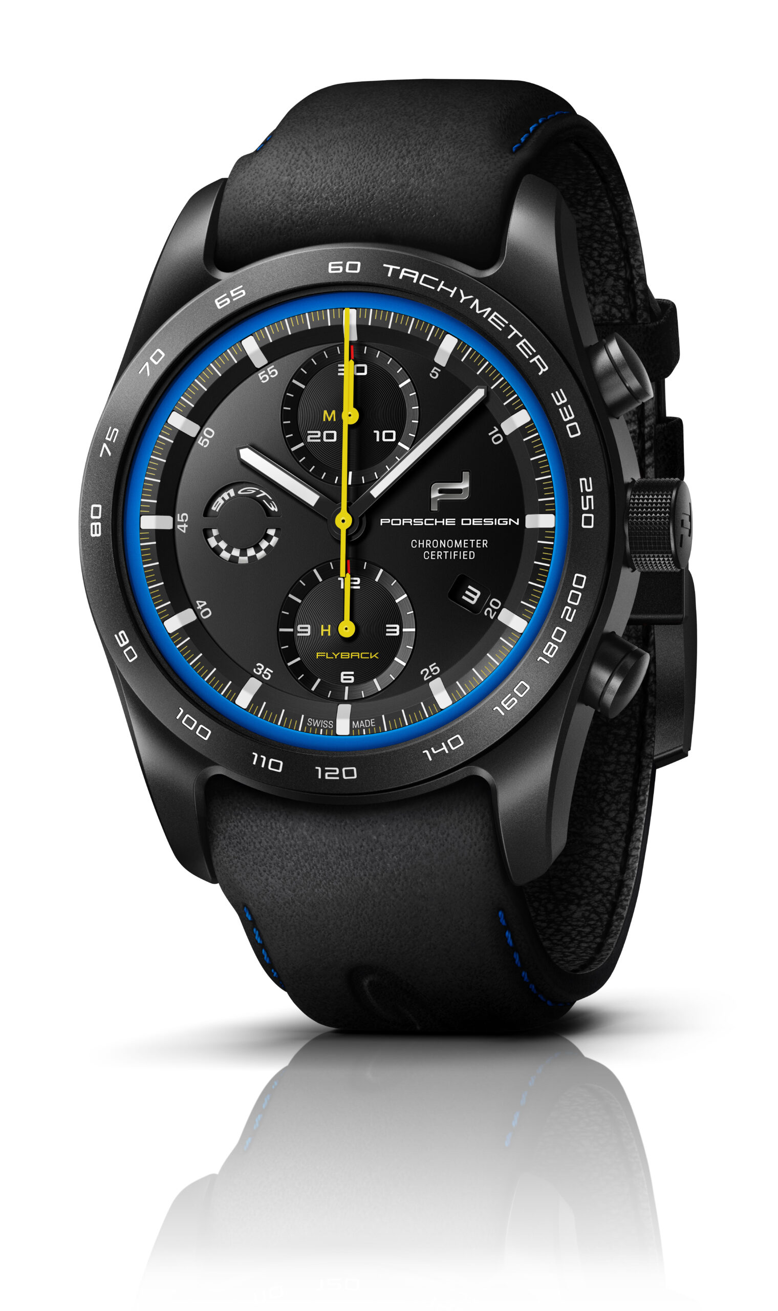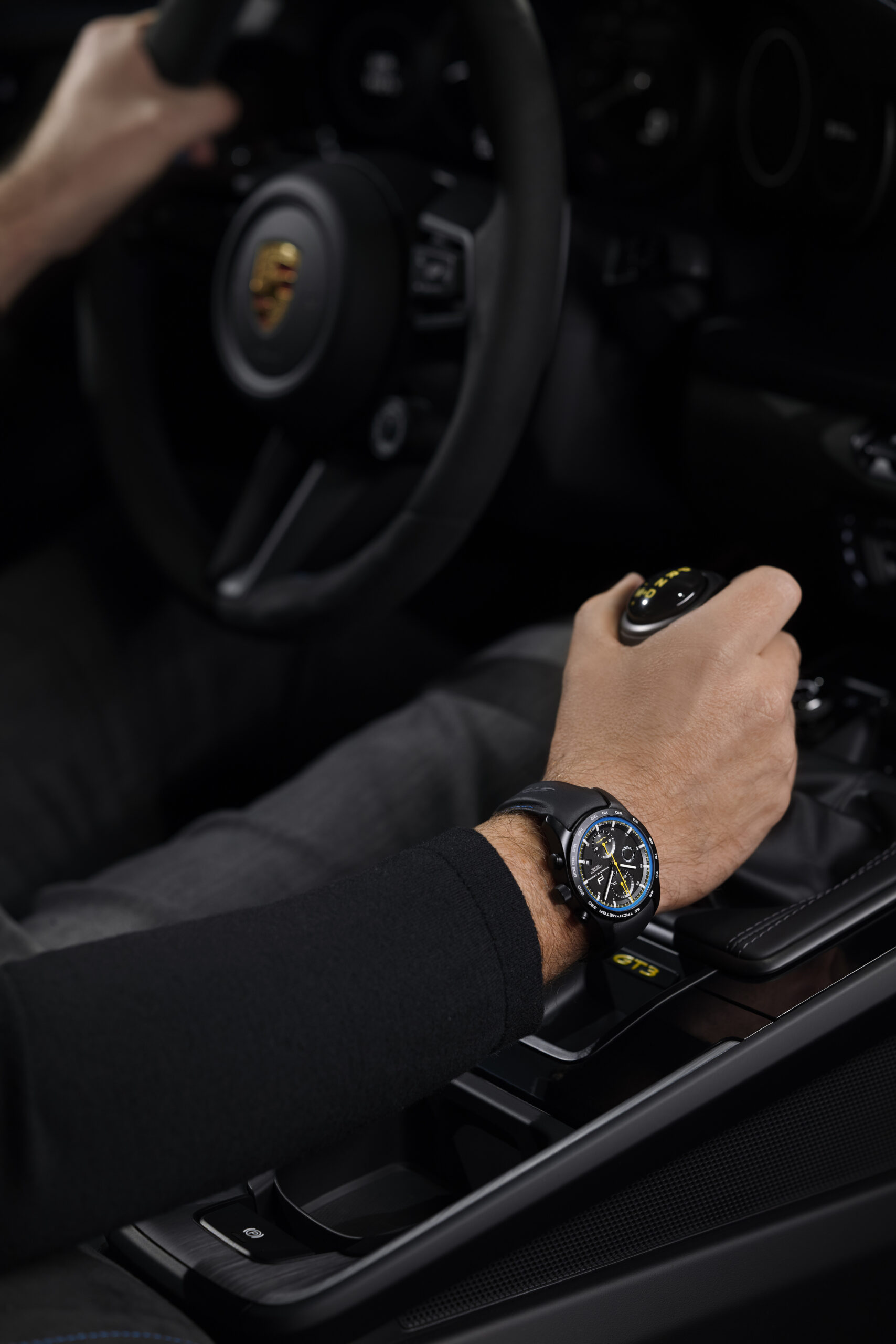 Der Porsche Design Chronograph 911 GT3 wird in zwei Ausführungen angeboten: als sportliche Variante mit appliziertem Zifferblatt-Farbring in auffälligem Sharkblue und als puristische Version mit Farbring in klassischem Schwarz. Beide Modelle zeichnen sich, wie für Porsche Design Zeitmesser üblich, durch ihre optimale Ablesbarkeit aus: Wie im Cockpit stechen auf schwarzem Hintergrund die Zeiger und Indizes in Weiß und Gelb sofort ins Auge. Getragen wird der Chronograph an einem Band aus echtem Porsche Fahrzeugleder mit „GT3 Prägung“ und Nähten in Kontrastfarben – je nach Ausführung in Sharkblue oder GT-silber. Durch das innovative Bandschnellwechselsystem lässt sich das Armband, mitgeliefert in Größe M und L, einfach und komfortabel austauschen, ohne dass zusätzliches Werkzeug benötigt wird.