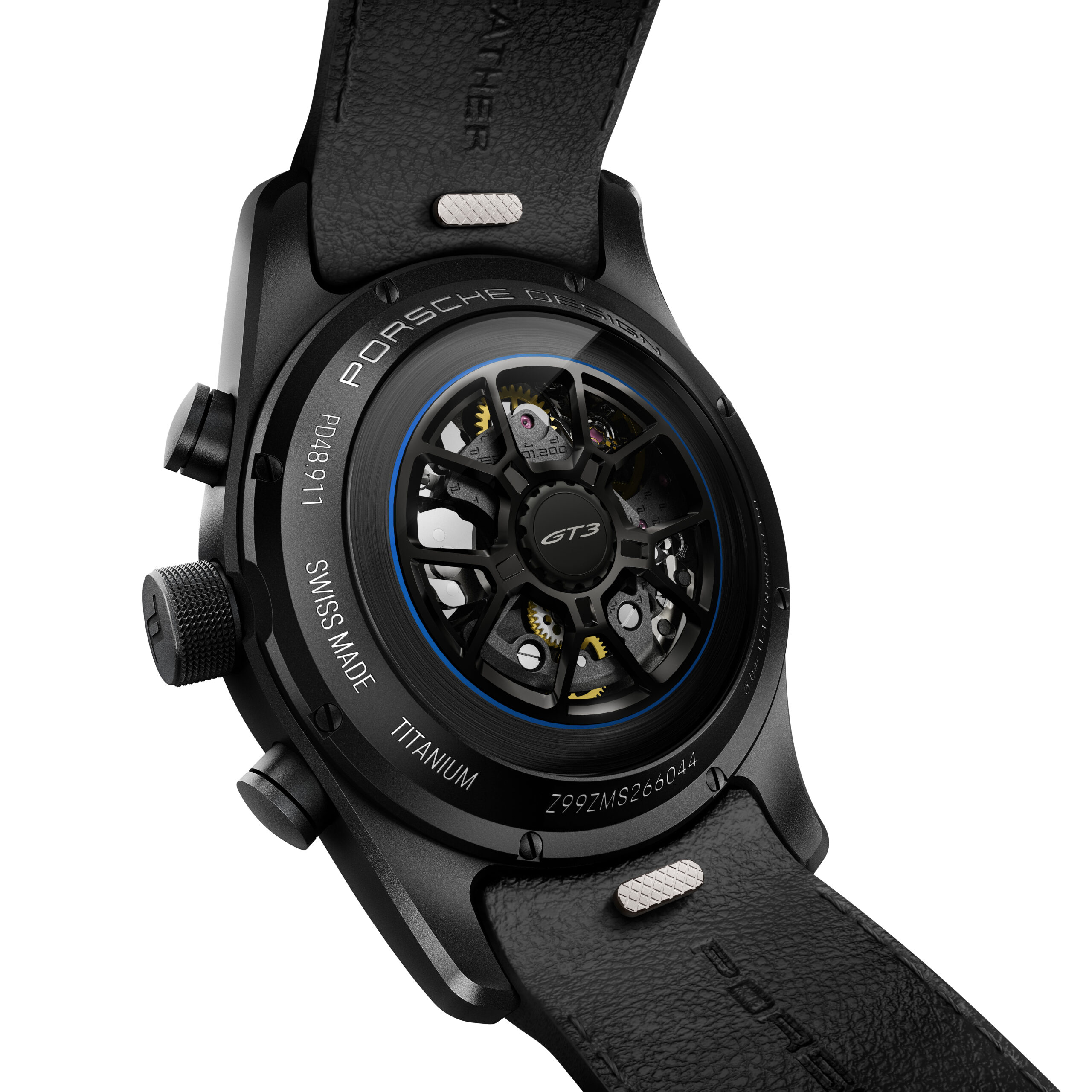 Nicht sofort ersichtlich, aber unverkennbar aus dem Motorsport abgeleitet ist auch das Uhrwerk. Das Porsche Design Kaliber WERK 01.200 mit Flyback-Funktion fasst Starten, Stoppen und Nullstellen in einem Vorgang zusammen und macht den Chronograph 911 GT3 damit zum perfekten Begleiter für die Rennstrecke. Es ist COSC-zertifiziert – ein Prädikat, mit dem nur die genauestens laufenden Uhren ausgezeichnet werden. Das Werk wird durch einen individuellen Aufzugsrotor angetrieben, der dem Design der Porsche 911 GT3 Räder nachempfunden ist. Der GT3 Felgenrotor ist in sechs Farbausführungen analog der Fahrzeugkonfiguration exklusiv für diesen Chronographen und damit nur für 911 GT3 Besitzer verfügbar. Vollendet wird jeder Rotor mit einem sportlichen, miniaturisierten Zentralverschluss mit silbernem GT3 Logo. Auch das Gehäuse spiegelt die Nähe zum Hochleistungsmotorsport. Es ist aus widerstandsfähigem, leichtem und hypoallergenem Titan gefertigt – genau wie die Pleuel im Motor des Porsche 911 GT3. Hightech-Bauteile wie diese Titan-Pleuel finden üblicherweise nur in den teuersten Rennmotoren Verwendung.