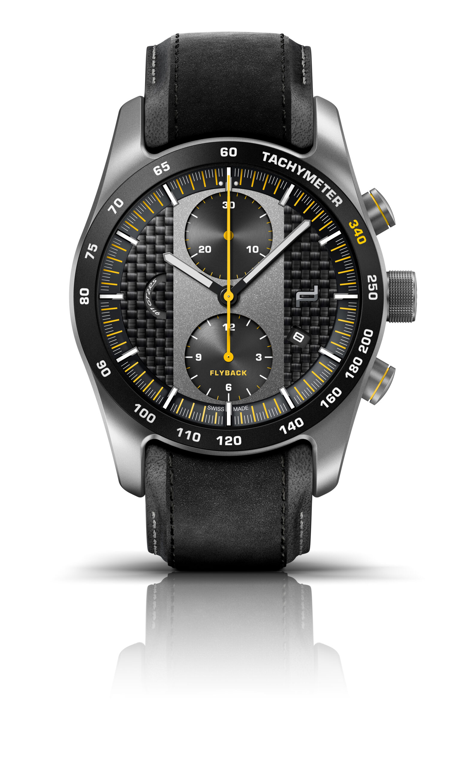 Das Gehäuse mit einem Durchmesser von 42 Millimetern zieht mit seinem sportlichen Design, das vom Porsche 911 GT2 RS mit Weissach-Paket inspiriert ist, unweigerlich die Blicke auf sich. Der Sportwagen ist in GT-silbermetallic lackiert mit schwarzen Anbauteilen. Die schwarze Titancarbid-Beschichtung auf Lünette und Gehäuseboden des Chronographen verleihen dem Zeitmesser genau diese Zweifarbigkeit.