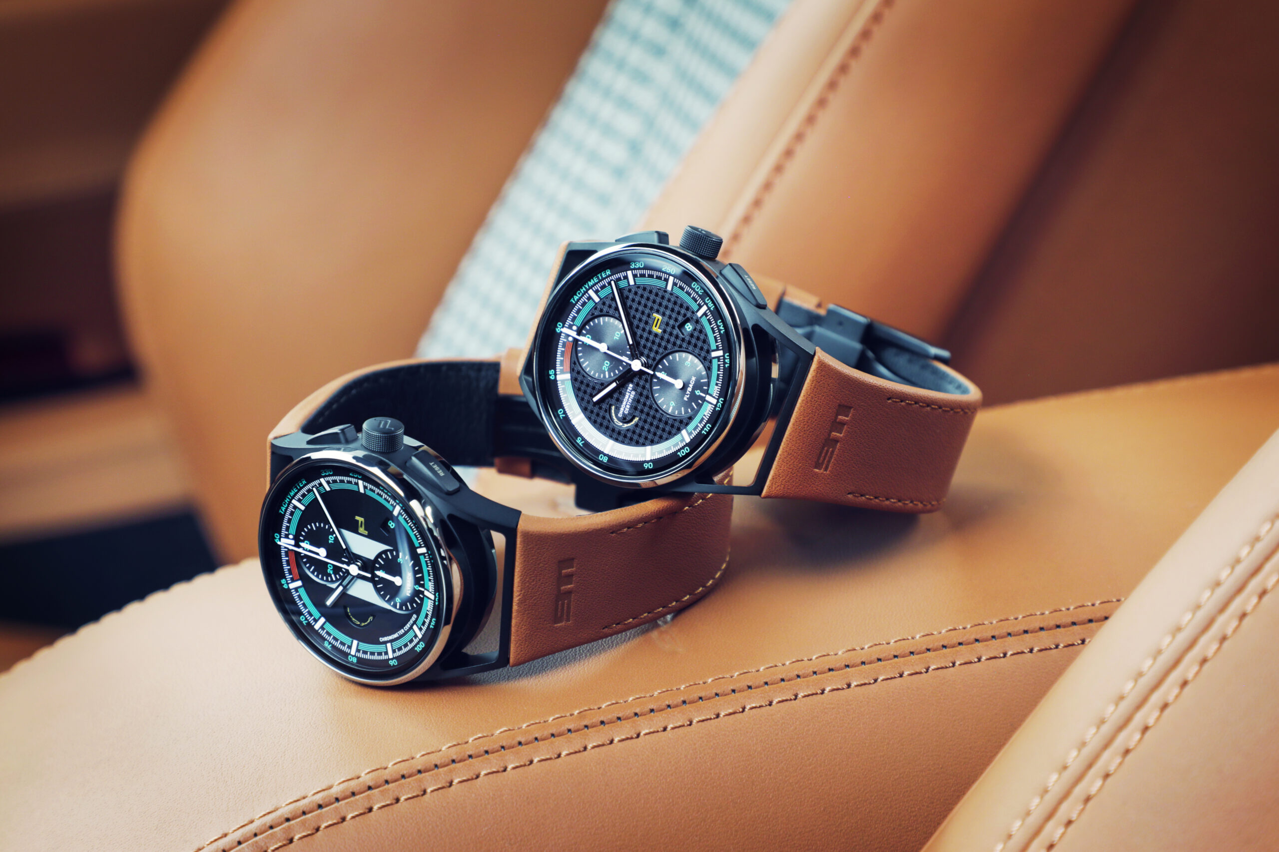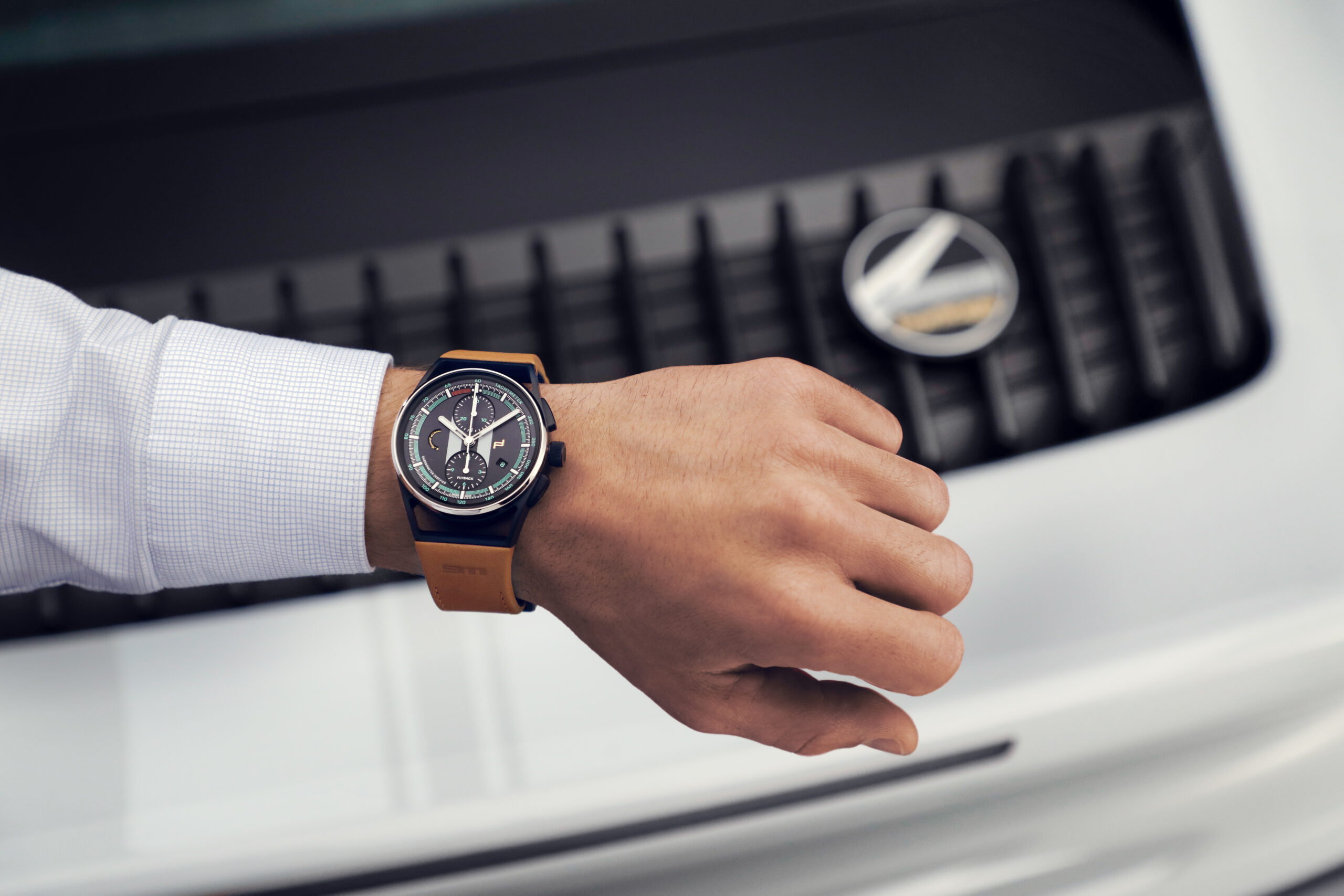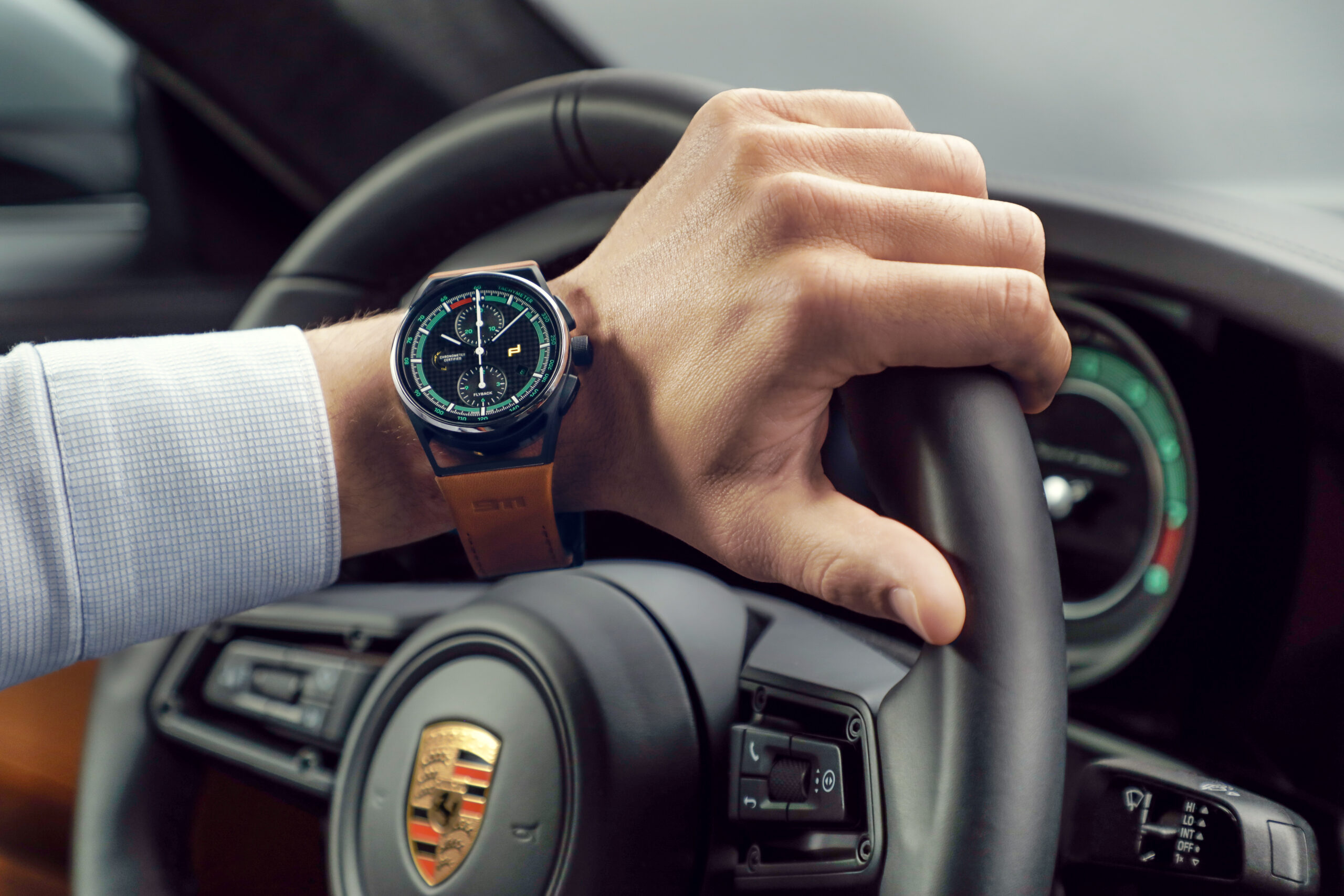 Im Inneren arbeitet das COSC-zertifizierte mechanische Porsche Design Chronographenkaliber WERK 01.200. Die Flyback-Funktion fasst Starten, Stoppen und Nullstellen in einem Vorgang zusammen. Die mit „Start/Stop“ und „Reset“ lasergravierten Drücker unterstreichen die Funktionalität des Chronographen. Während beim Sportwagen die Räder die Antriebsleistung des Motors auf die Straße übertragen, wird beim Chronographen dem Aufzugsrotor diese zentrale Aufgabe zuteil. Mit jeder Bewegung des Handgelenks zieht er – rein mechanisch – das Uhrwerk auf. Das Design der 360-Grad-Aufzugsrotoren ist von den Räderoptionen des 911 Sport Classic abgeleitet und wird durch eine Abdeckkappe im Design des Zentralverschlusses mit historischem Porsche Wappen vervollständigt. Die beiden im Lieferumfang enthaltenen Armbänder – eines in klassischem Schwarz, eines in elegantem Classic Cognac – leiten sich vom Interieur des Sportwagens ab: Sie sind aus demselben Leder gefertigt, das auch im Interieur der Kleinserie Verwendung findet, und mit einer „911“ Prägung veredelt. Durch ein Schnellwechselsystem lassen sich die Lederbänder einfach und ohne die Verwendung von Werkzeug austauschen.