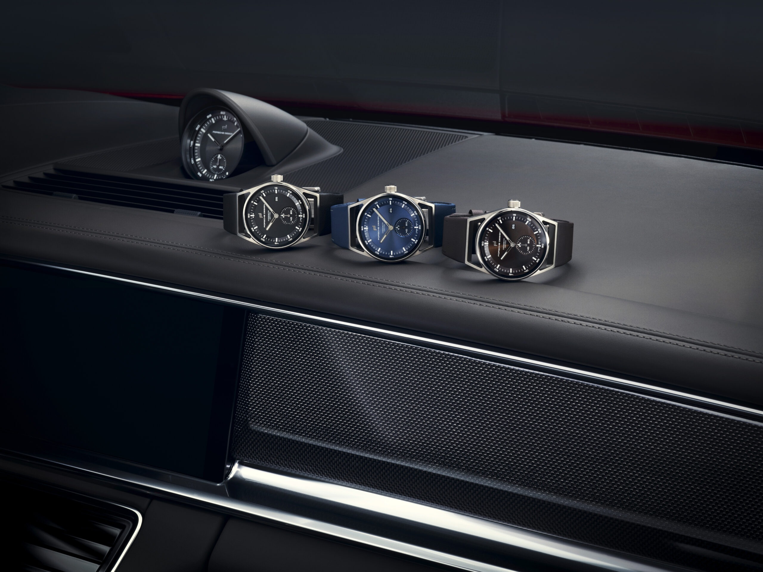 Der Launch des erweiterten Sport Chrono-Pakets wird von der Präsentation der neuen Sport Chrono Armbanduhren-Kollektion, bestehend aus einem Chronographen sowie drei „Drei-Zeiger Modellen“ mit kleiner Sekunde bei sechs Uhr begleitet. Die Sport Chrono Sub Second-Modelle werden vom neu entwickelten in-house Porsche Design Kaliber WERK 03.200 mit COSC-Zertifizierung angetrieben. In den Farbkombinationen Titanium & Black, Titanium & Blue oder Titanium & Brown überzeugen sie nicht nur mit ihrem stilvollen, reduzierten Design, sondern auch mit dem für Porsche Design typischen, bis 100 Meter wasserdichten Titangehäuse, das mit hohem Tragekomfort und extremer Robustheit sowie besonders leichtem Gewicht aufwartet. Gleiches gilt für den automatischen Chronographen mit dem Porsche Design Kaliber WERK 01.100. Im Gegensatz zu den Sub Second Chronometer Modellen, die mit einem geschlossenen Gehäuseboden ausgestattet sind, besitzt dieser einen Saphirglasboden. So kommen auf der Rückseite die hochwertige Ausführung und der Aufzugsrotor mit dem P-Icon zum Vorschein. Weitere klassische Porsche Design Merkmale sind das siebenfach entspiegelte Saphirglas mit Hartbeschichtung, das hochwertige Lederband aus echtem Porsche Interior Leder und die Titan-Faltschließe mit Sicherheitsdrückern.