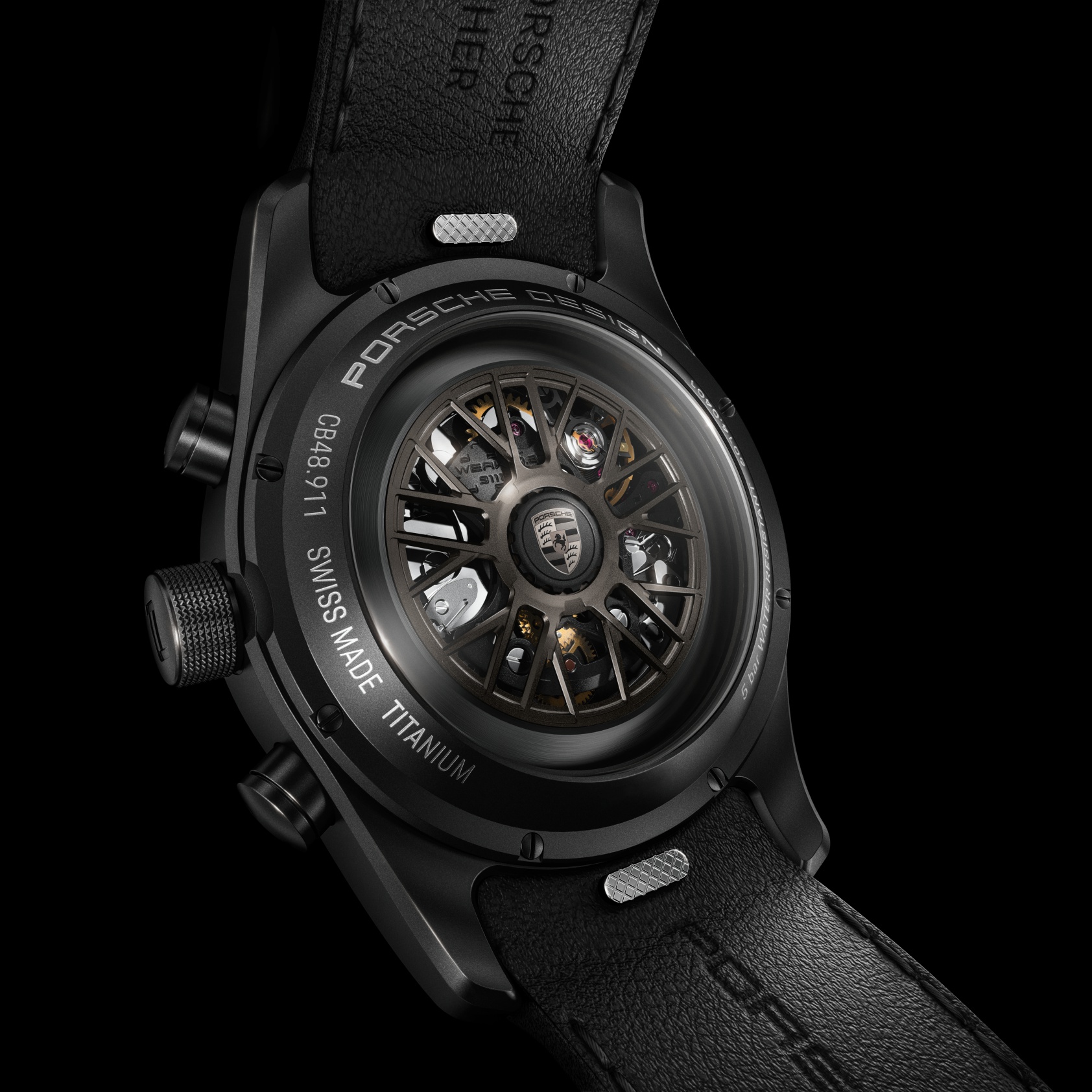 In diesem vom Träger selbst konfigurierten Unikat schlägt das Porsche Design Kaliber WERK 01.200. Das von Porsche Design entwickelte Chronographenkaliber mit COSC-Zertifizierung und Flyback-Funktion vereint herausragende Ingenieurskunst und feinste Präzisionsuhrmacherei. Der individuell wählbare Rotor greift die verschiedenen Designs der 911 Turbo S Räder auf und wird stilecht mit dem Porsche Wappen in Turbonit ausgeführt. Die technische und ästhetische Raffinesse des feinmechanischen Meisterwerks kommt durch den Saphirglasboden zur Geltung. Ein weiteres Kennzeichen echter Individualität kommt ebenfalls auf der Rückseite zum Vorschein: Der Gehäuseboden lässt sich mit einer persönlichen Gravur individualisieren, zum Beispiel einem Namen, dem Kennzeichen oder der Fahrzeugidentifikationsnummer des dazugehörigen 911 Turbo S.