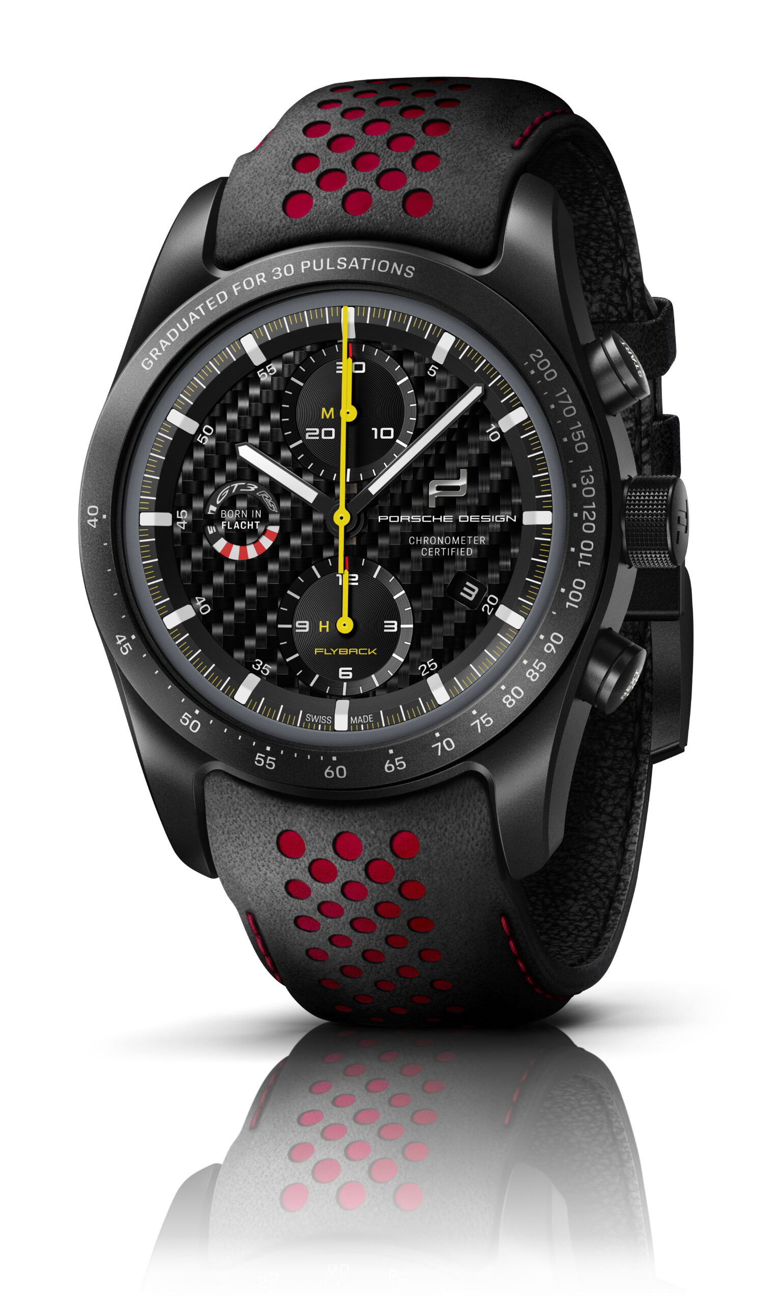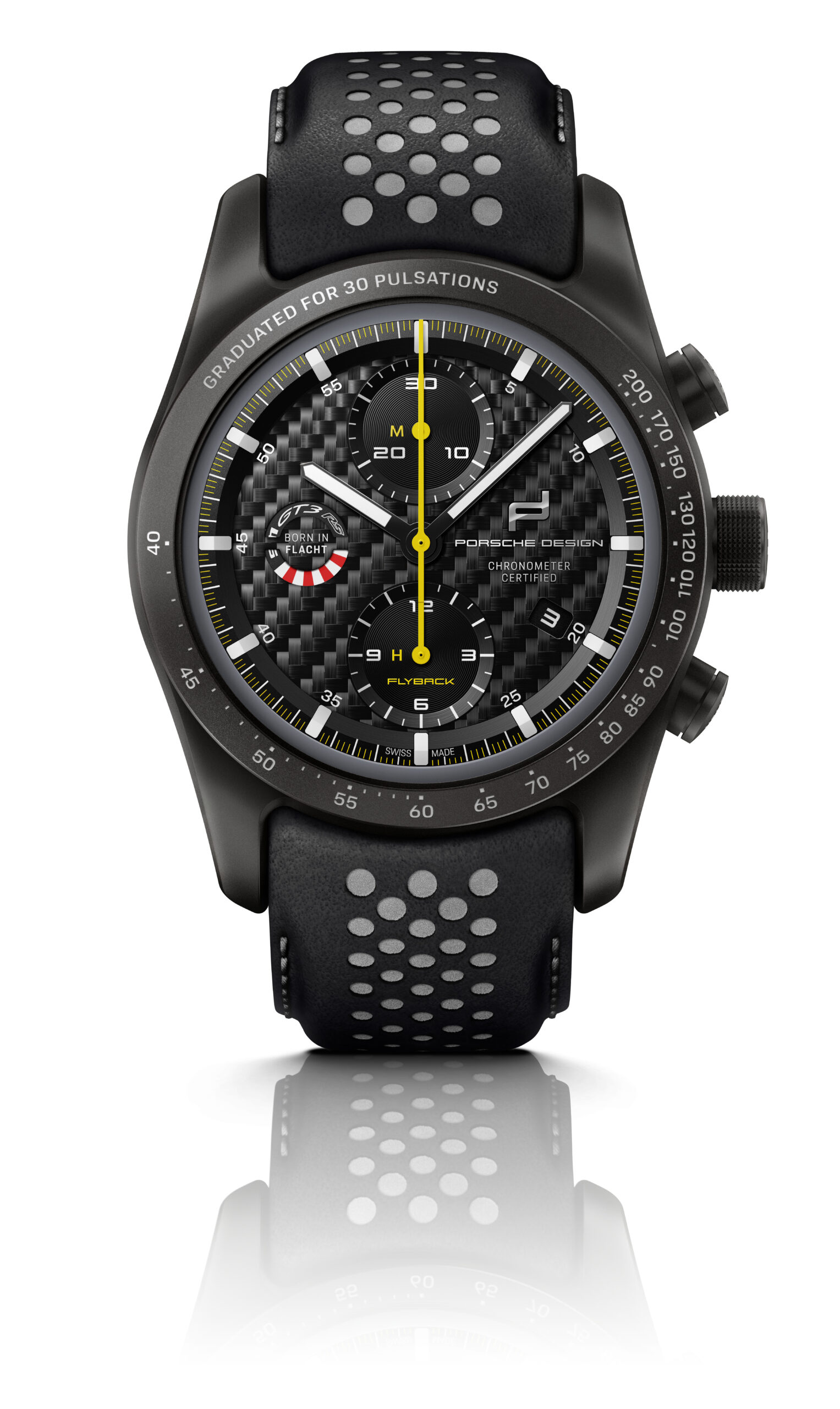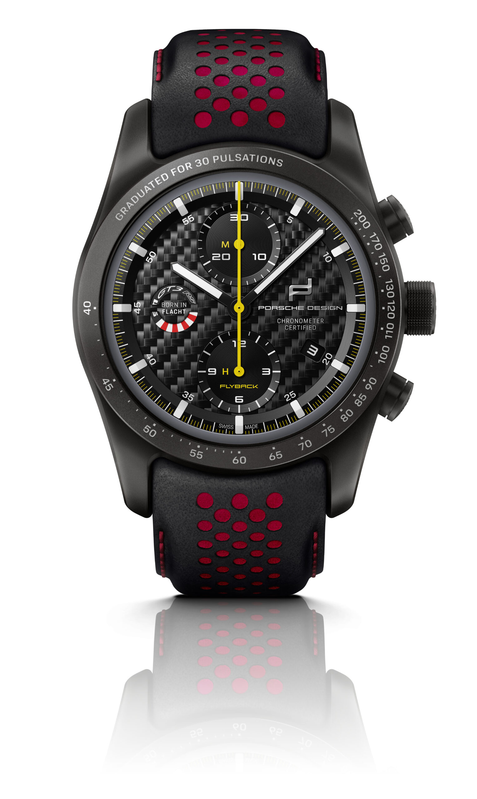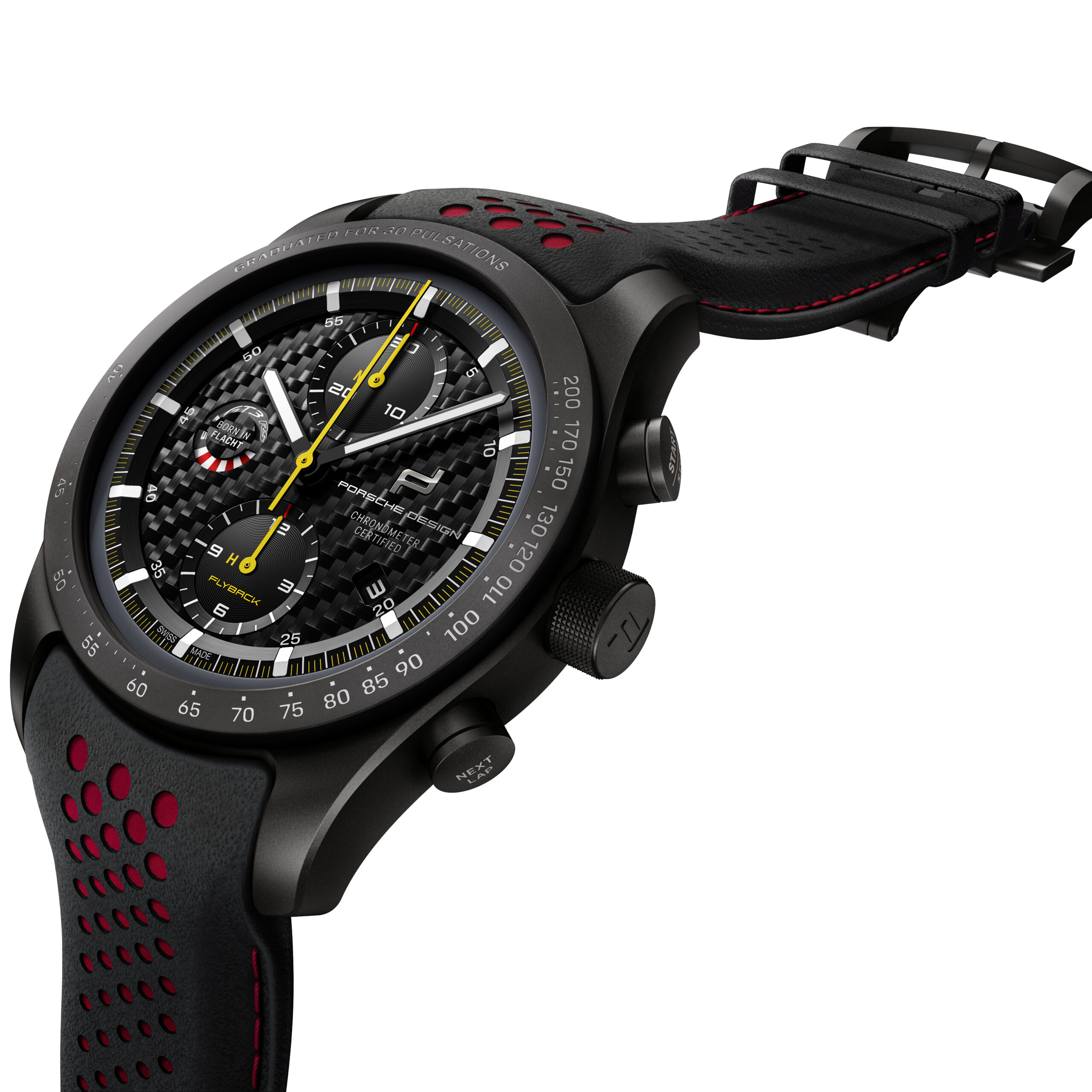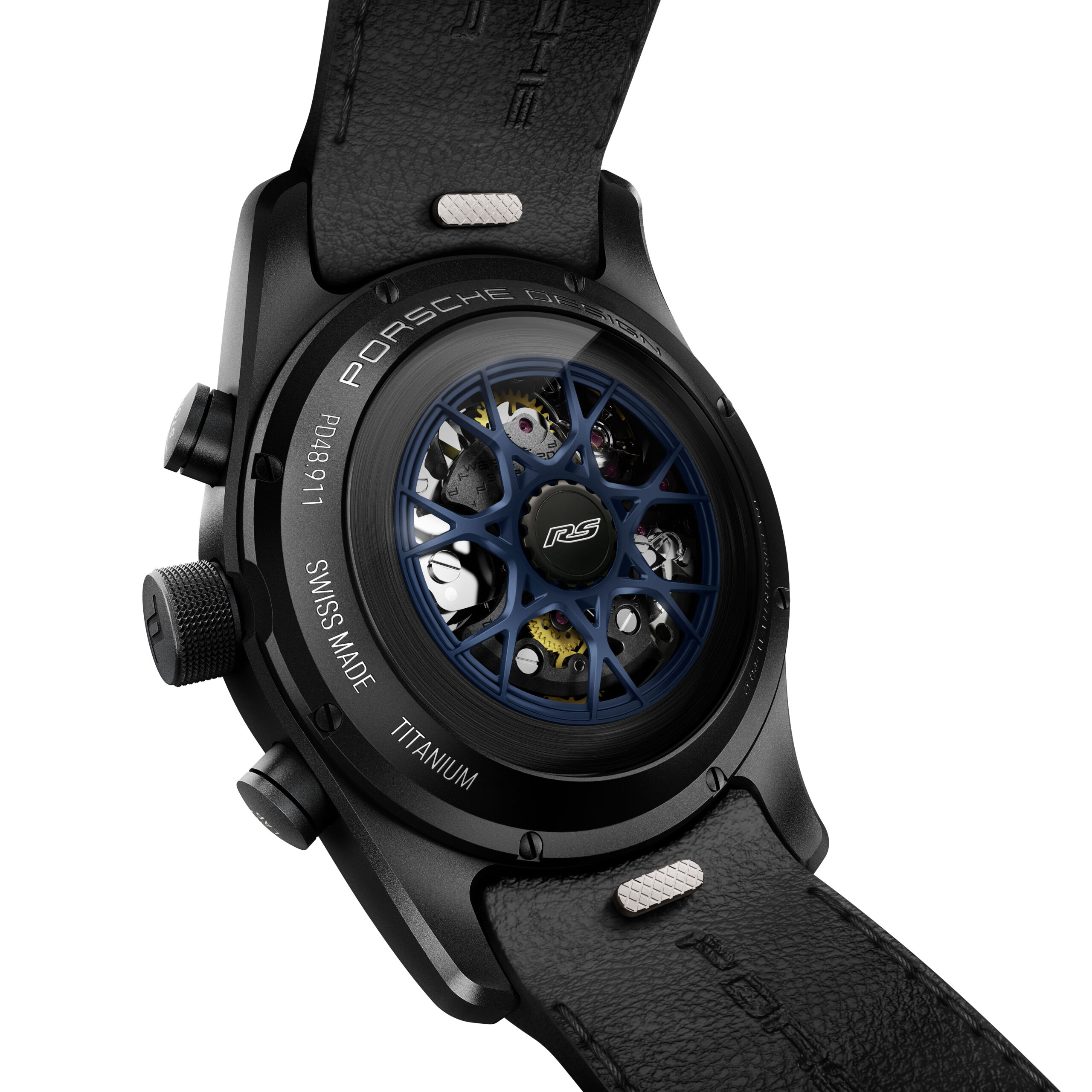 Der Chronograph ist mit einer Vielzahl von sportlichen Design-Merkmalen und technischen Details optimal auf die motorisierten Vorbilder abgestimmt. So betonen die Chronographendrücker mit den Lasergravuren „Start/Stop“ und „Next Lap“ die Herkunft aus dem Rennsport. Das Uhrengehäuse aus leichtem, widerstandsfähigem Titan ist in Schwarz oder naturbelassen erhältlich. Es ist glasperlgestrahlt, bis 5 bar dynamisch wasserdicht und ebenso für ein Regenrennen wie für einen Tauchgang geeignet. Das kratzfeste, beidseitig siebenfach entspiegelte Saphirglas garantiert die im Rennsport so wichtige optimale Ablesbarkeit und das sofortige Erfassen aller wichtigen Informationen. Das Zifferblatt in Sichtcarbon bietet einen sportlichen Kontrast zu den weißen Stunden- und Minutenindizes aus keramischer Super-LumiNova®-Leuchtmasse. Die Zeiger in PERFORMANCE (weiß), ESSENCE (schwarz) oder GT (gelb) steigern mit jeder Sekunde zusätzlich die Faszination Rennsport. Die Sekundenscheibe bei 9 Uhr in Schwarz matt ziert der weiße Modellschriftzug „911 GT3 RS“ und das rot-weiße Curbs Design begeistert in wenigen Hundertsteln. Der High-Performance-Charakter dieses einzigartigen Zeitmessers wird durch den Aufdruck „BORN IN FLACHT“ im Zentrum der Sekundenscheibe unterstrichen. Denn im Mittelpunkt dieses Chronographen steht die Jagd auf neue Rundenrekorde. Die Chronographensekunde und der 30-Minuten-Zähler zeigen beim Überfahren der Ziellinie exakt an, ob die Bestzeit unterboten werden konnte. Der Porsche Design Uhrenkonfigurator bietet für den Individualfarbring rund um das Ziffernblatt eine Auswahl von neun verschiedenen Farben. Die Rückseite bekommen im Gegensatz zum Heck des GT3 RS wohl nur wenige zu sehen. Der Titanboden in der gewählten Gehäusefarbe lässt sich mit einem bis zu zwölf Zeichen langen Text – beispielsweise der Fahrzeugidentifikationsnummer – individualisieren. Das Saphirglas-Sichtfenster gibt den Blick frei auf den Rotor und das filigrane Uhrwerk.