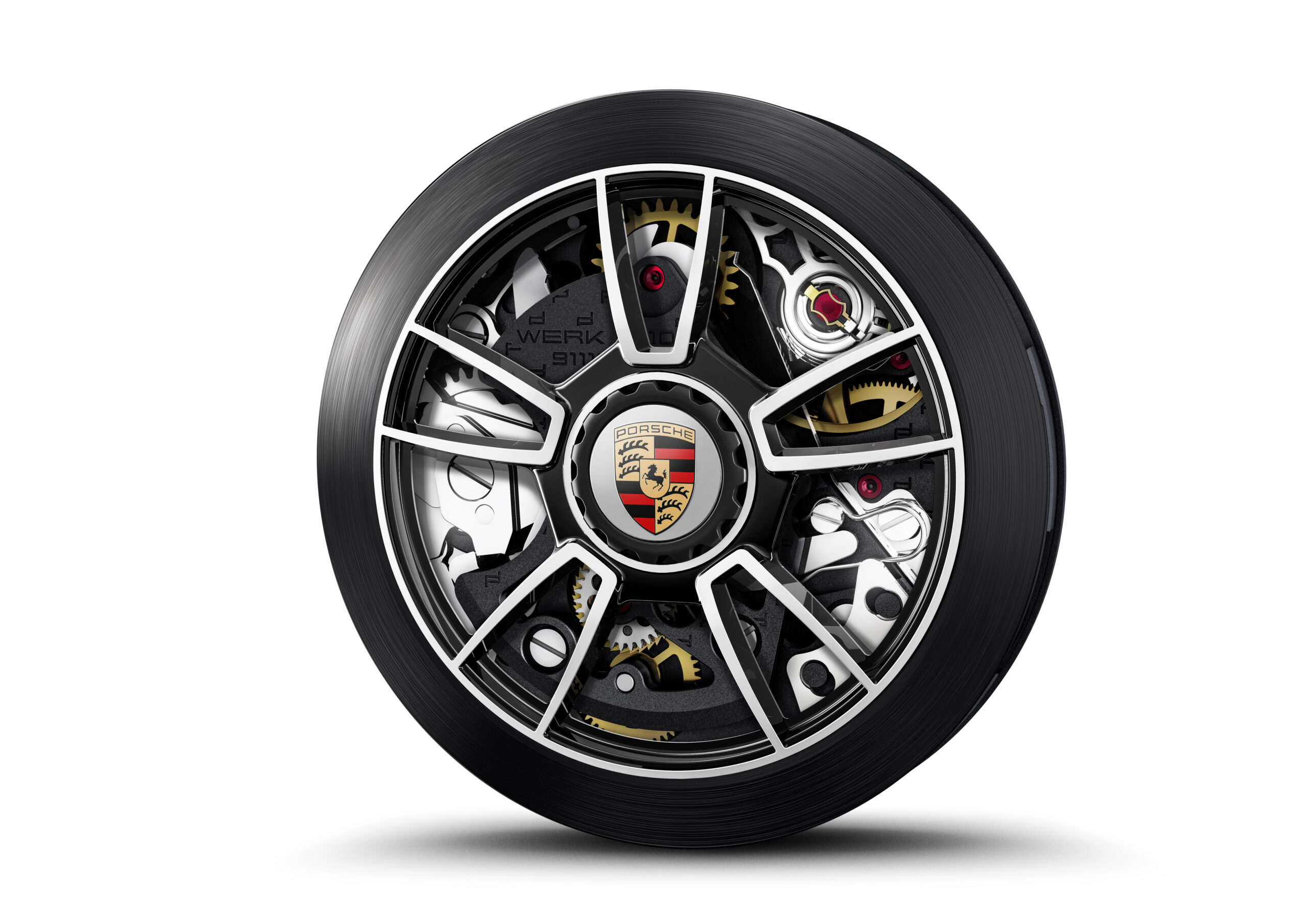 Mit den Porsche Design custom-built Timepieces geht das neue Porsche Design Inhouse-Kaliber WERK 01.100 mit 48 Stunden Gangreserve erstmals in Serie. Highlight des COSC-zertifizierten Werkes ist der individualisierbare Aufzugsrotor im Look der aktuell verfügbaren Felgen des Porsche 911. Zum ersten Mal überhaupt bietet Porsche Design einen Zeitmesser mit einem frei wählbaren Bauteil im Uhrwerk an. „Der Aufwand, alle Varianten im Vorfeld zu prüfen, ist enorm. Doch genau diese Liebe zum Detail erwarten unsere Kunden von uns“, sagt Rolf Bergmann, Leiter Porsche Design Timepieces AG. Von der klassischen 911 Carrera Felge inklusive Rotorabdeckung und zweifarbigem Porsche Wappen bis hin zum 911 Carrera Exclusive Design Rad mit einem goldfarbenen Wappen stehen sechs verschiedene Rotortypen zur Auswahl. Auch die Rotorflanke kann dabei analog zur Felgenflanke beim Fahrzeug in Wunsch-Wagenfarben lackiert werden. Dabei verwendet Porsche Design die original Porsche Farbpalette. Der Rotor der Uhren entspricht einer im Maßstab 1: 22 verkleinerten Version der Originalfelge, angepasst an die Geometrie des Zeitmessers. Die Fertigung der Rotoren erfolgt auf bis zu fünf Tausendstel Millimeter genau. Das Porsche Wappen, an der Fahrzeugfelge rund 50 Millimeter groß, misst auf dem Aufzugsrotordeckel lediglich 3,3 Millimeter in der Breite und 4,4 Millimeter in der Höhe. Dennoch bleibt das Porsche Wappen mit bloßem Auge gut erkennbar.