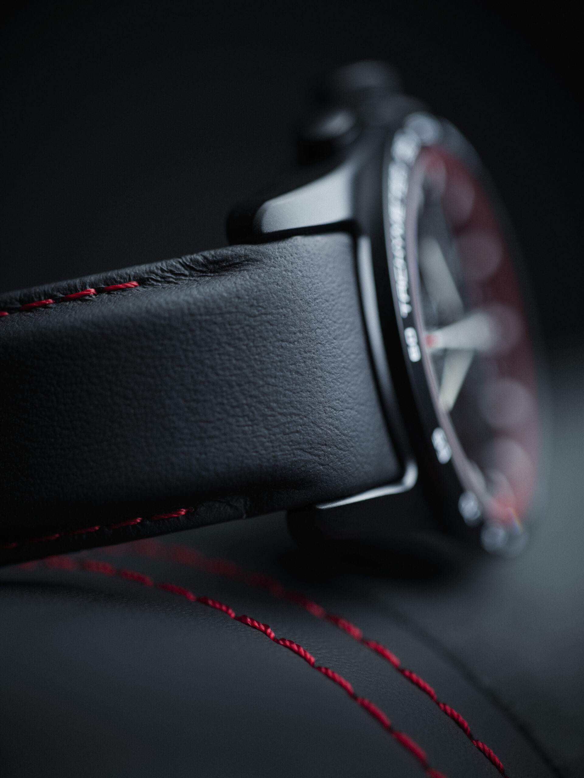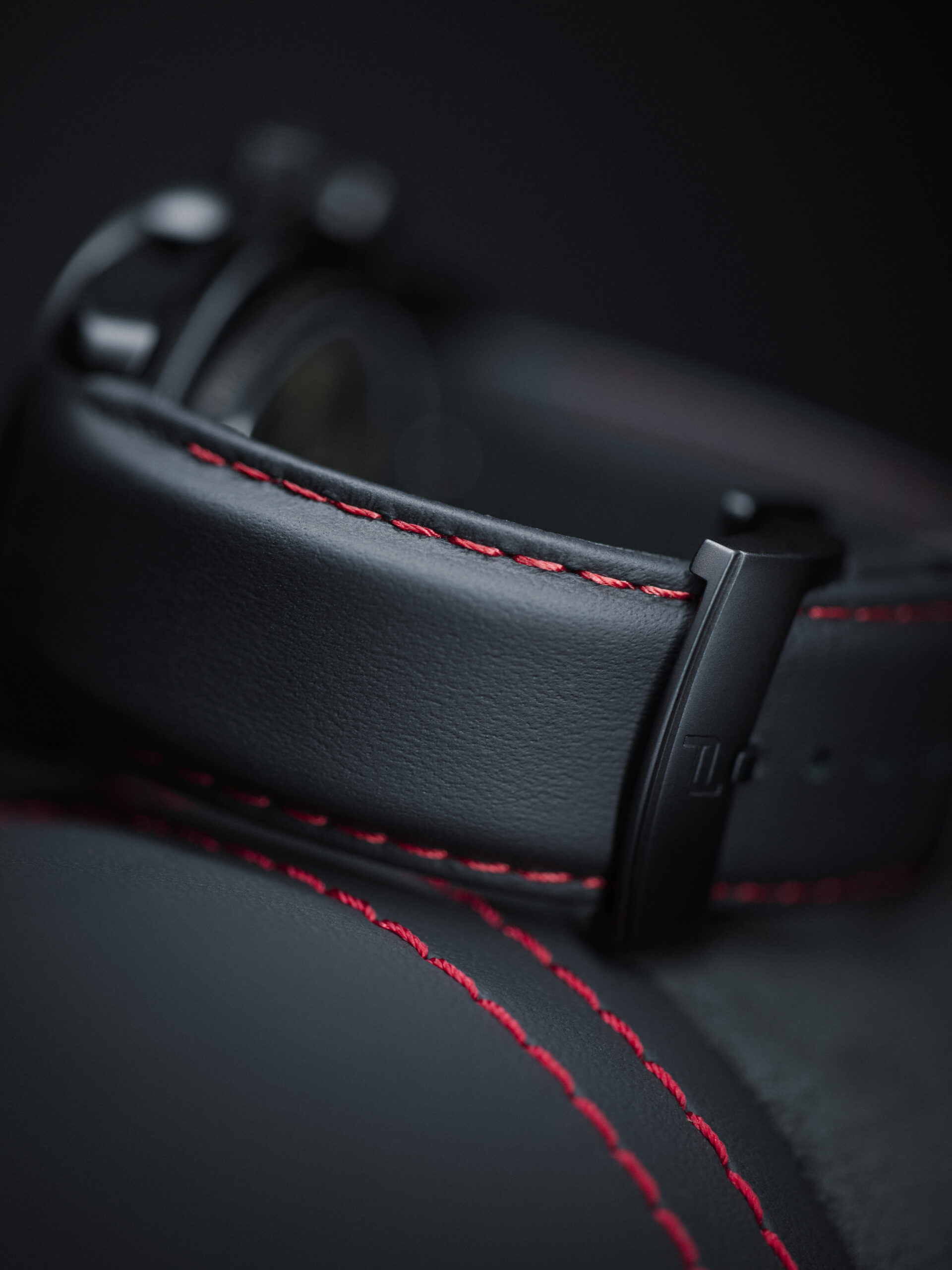 Der enorme Aufwand, der bei diesem Programm betrieben wurde, ist nirgendwo so gut zu erkennen wie bei den verfügbaren Metall- oder Lederarmbändern, die zudem in drei Größen angeboten werden. Pop-up-Infomenüs im Konfigurator erleichtern dabei die Auswahl. Bei den Metallarmbändern wird ausschließlich hautfreundliches Titan verwendet. Alle Versionen verfügen über einzeln verschraubte Glieder. Es gibt sie analog zu den Gehäusevarianten in glasperlengestrahltem Naturtitan oder schwarz beschichtet mit Titancarbid. Zusätzlich stehen zwei verschiedene Schließen zur Auswahl, wahlweise eine Butterfly-Schließe mit seitlichen Drückern oder mit siebenfacher Feinverstellung.