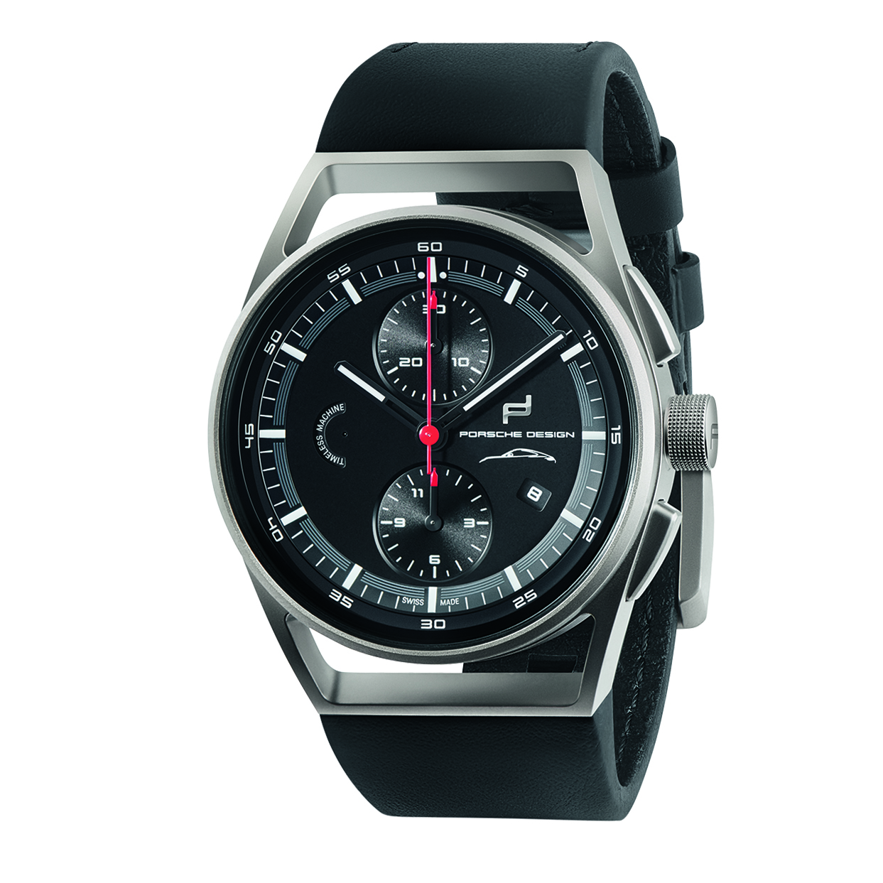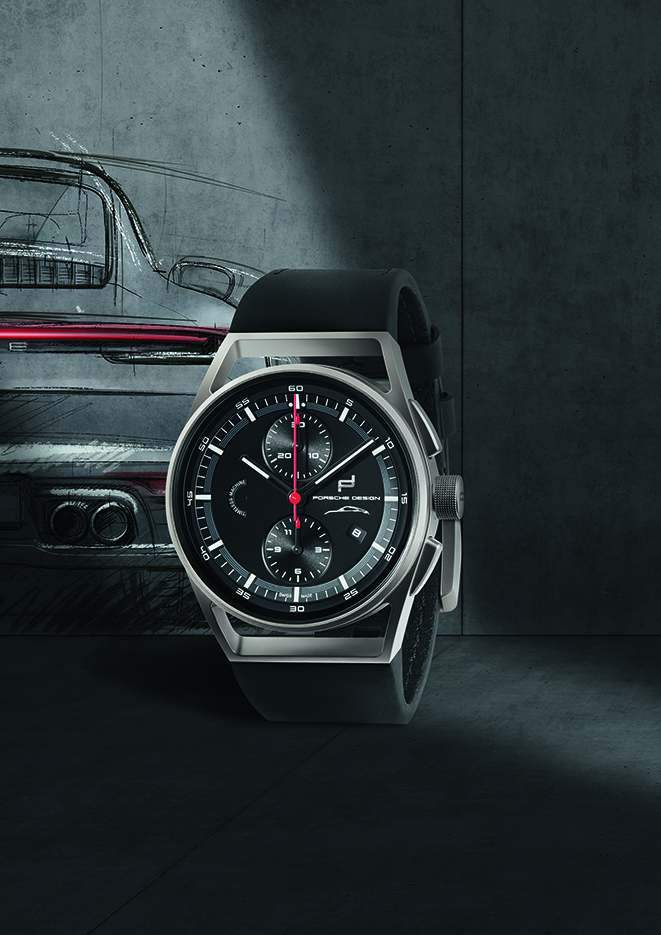 Wie bei allen Porsche Design Uhren, wird das aus dem Motorenbau entlehnte Leichtbauprinzip durch die Verwendung eines ebenso leichten wie robusten und hautfreundlichen Titangehäuses umgesetzt. Die charakteristischen Durchbrüche am Bandanstoß und der formschlüssige Übergang zum Lederarmband verleihen der puristischen Ästhetik auch visuell eine besondere Leichtigkeit. Um die Porsche Historie auch haptisch erlebbar zu machen, ist das Armband aus demselben Leder und Garn gefertigt, das auch im Sportwagen-Interieur zum Einsatz kommt.