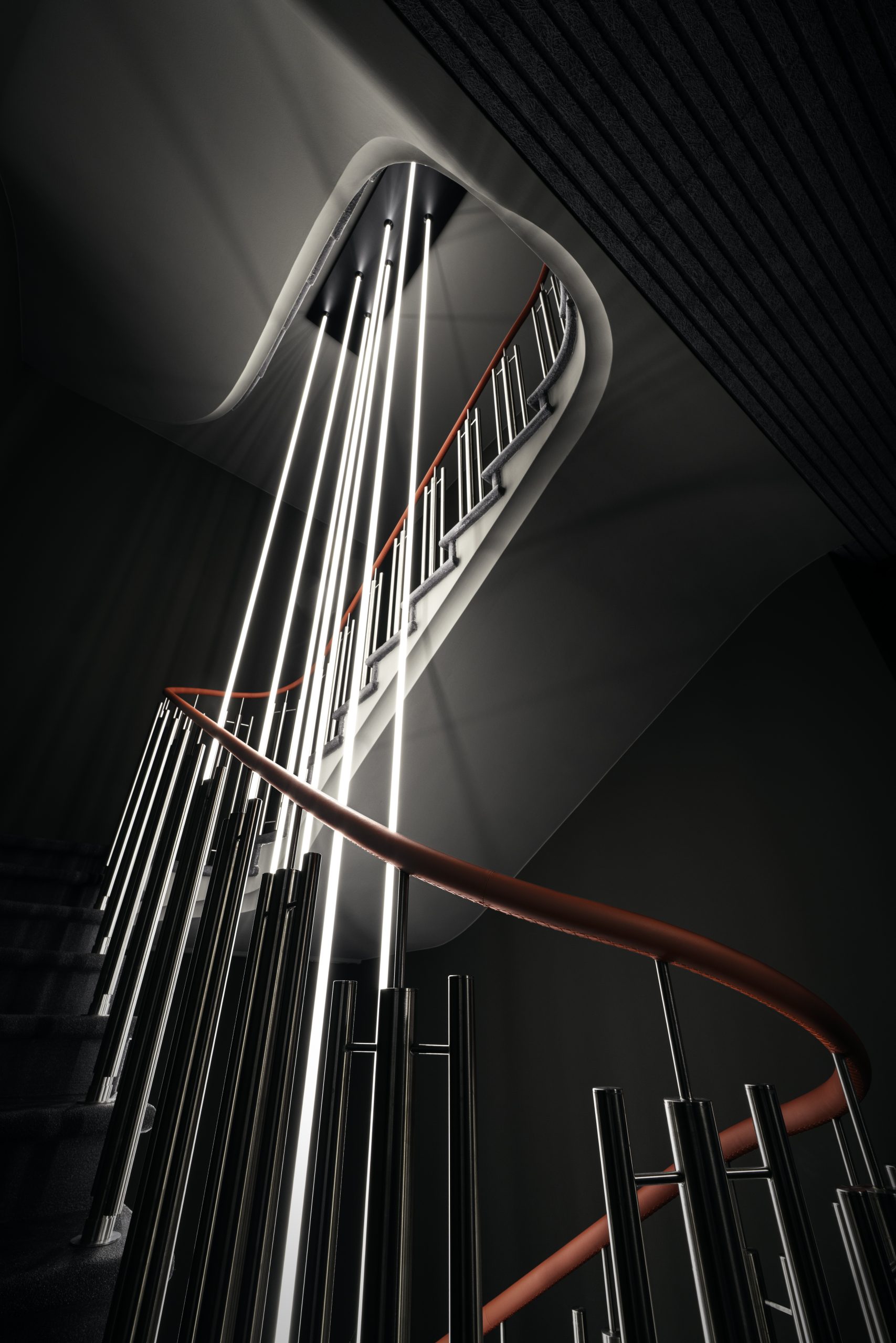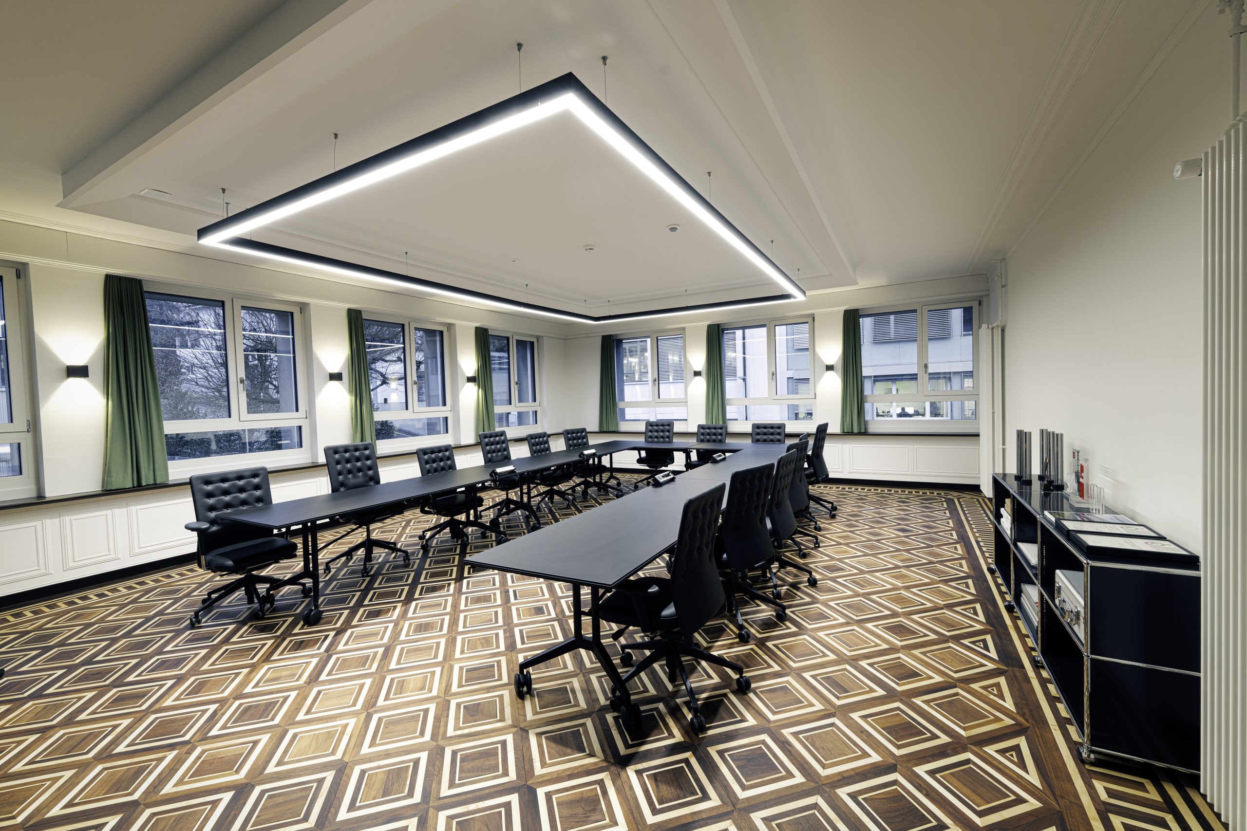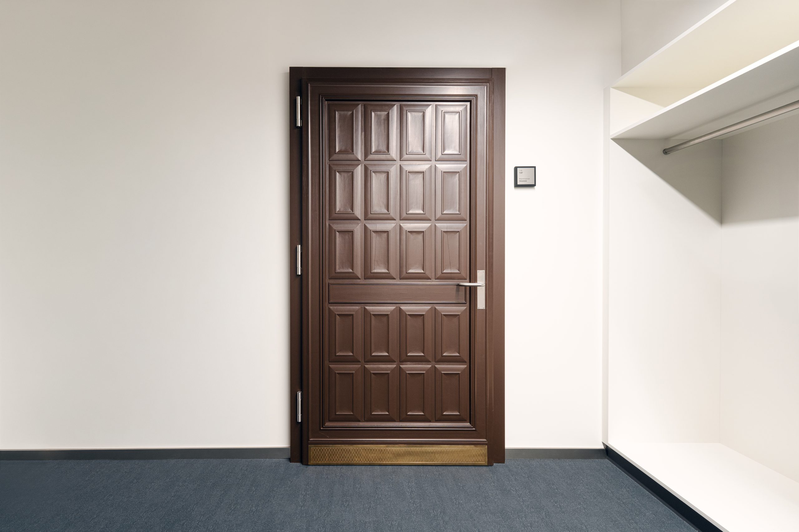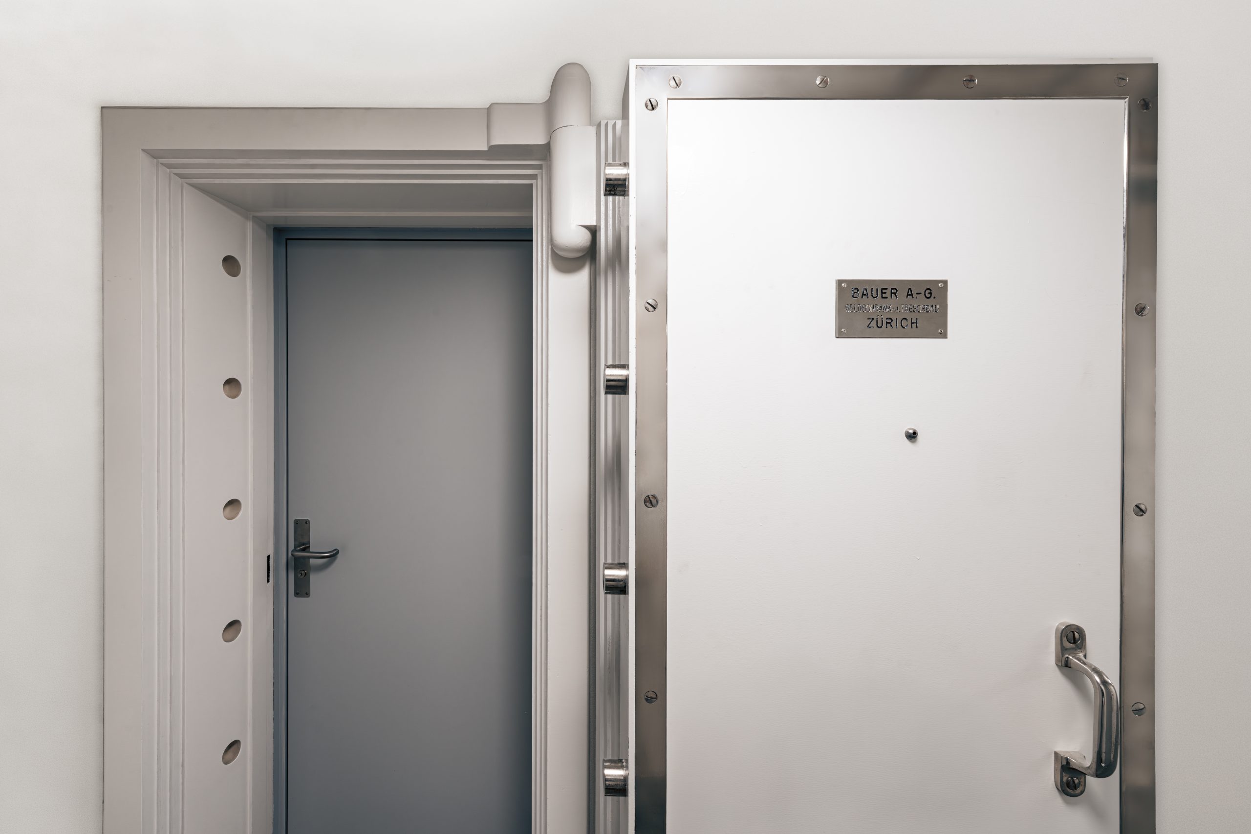 Die Manufaktur vereint historische Substanz mit moderner Architektur und Technik. Besondere Sorgfalt galt dem Erhalt und der behutsamen Restaurierung ausgewählter historischer Elemente. Im denkmalgeschützten Besprechungsraum wurden Oberflächenbeschichtungen und Stuckelemente mit handwerklichem Feingefühl instandgesetzt, um den ursprünglichen Charakter zu bewahren. Auch die originalen Tresortüren aus dem Jahr 1956 wurden technisch überarbeitet und optisch erhalten – ein Detail, das den Respekt vor der Geschichte des Gebäudes unterstreicht. Klare Linien, helle Räume und funktionale Strukturen schaffen ein modernes Produktionsumfeld und spiegeln zudem die Designprinzipien von Porsche Design wider. Akzente wie ein mit original Porsche-Fahrzeugleder in Karminrot bezogener Treppenhandlauf setzen subtile Verweise auf die Herkunft aus dem Automobildesign.