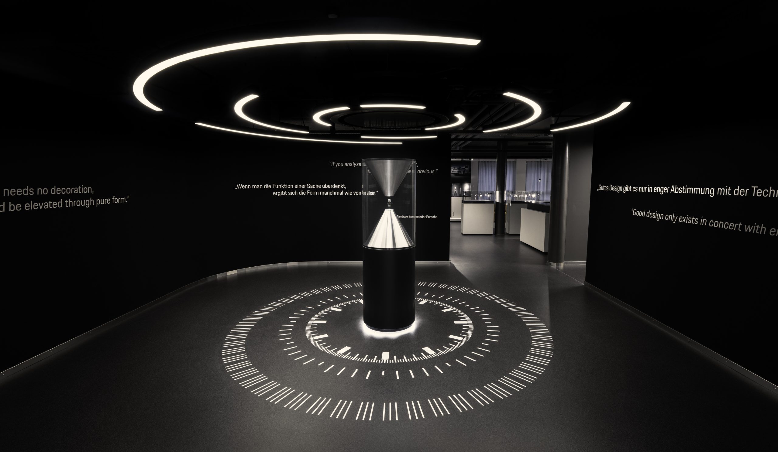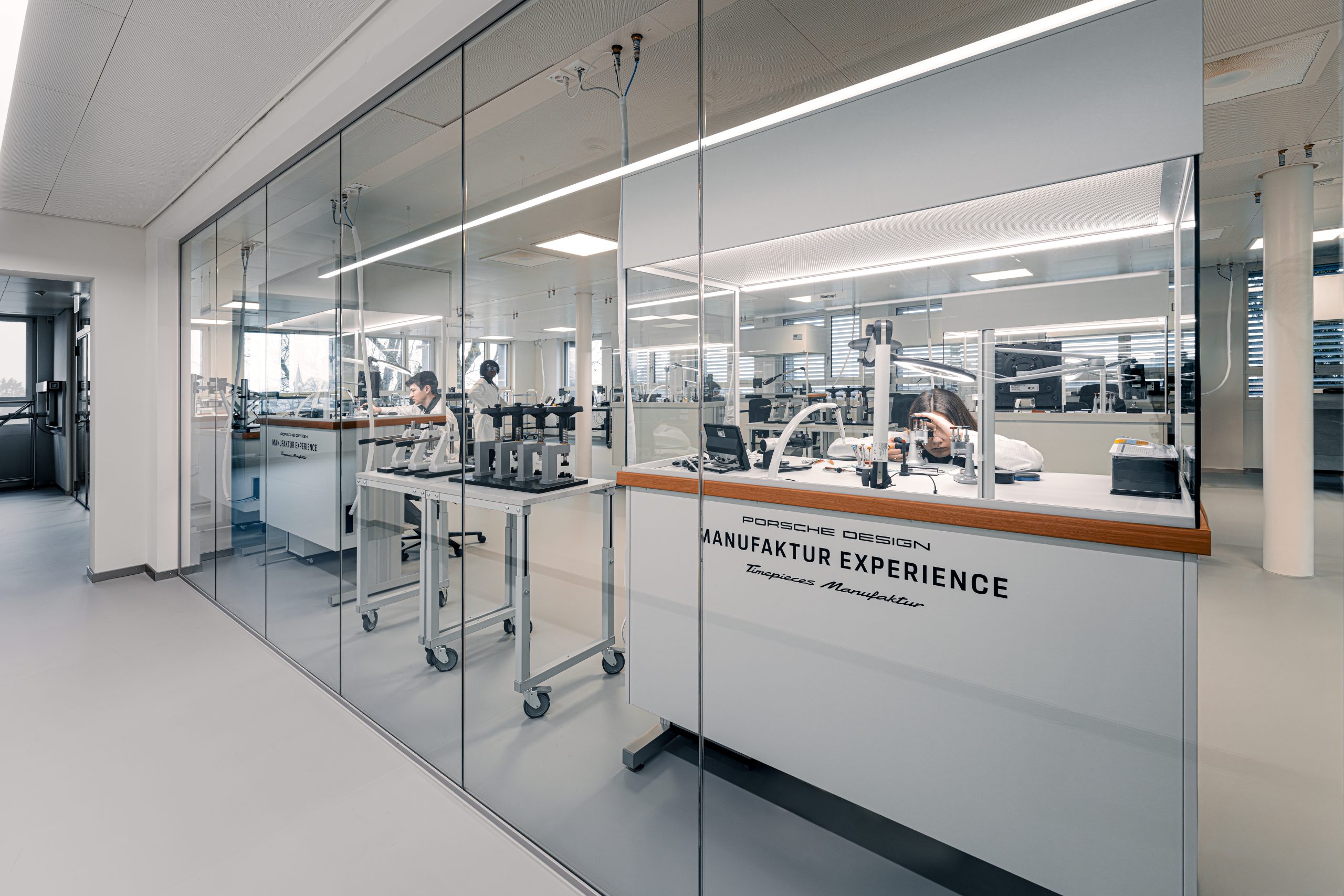 Die neue Manufaktur ist Produktionsstätte und zugleich Markenerlebnisraum. Im Erdgeschoss befindet sich eine Ausstellungs- und Eventfläche, die die Entwicklung der Porsche Design Timepieces seit 1972 nachzeichnet. Historische Exponate und kuratierte Zeitdokumente machen die Verbindung von Automobildesign und Uhrmacherkunst erlebbar. Der Konfigurationsbereich, die sogenannte Fitting Lounge, bietet Kundinnen und Kunden die Möglichkeit, ein custom-built Timepiece direkt vor Ort zu gestalten und nach der individuellen Fertigung dort abzuholen. Konfiguration, Produktion und Übergabe finden damit erstmals unter einem Dach statt. Ergänzt wird das Konzept durch den Loungebereiche und flexibel nutzbare Veranstaltungsflächen, die Raum für Begegnung und Präsentationen bieten. Ein besonderes Highlight ist die Möglichkeit für Kundinnen und Kunden, ihren Porsche in die Manufaktur zu fahren und so die Verbindung zwischen Automobil und Zeitmesser auf einzigartige Weise zu erleben. Das von Beginn der Planung an verfolgte Konzept einer „gläsernen Manufaktur“ macht zudem Werksführungen möglich – eine Tradition, die seit Langem fest zur Marke Porsche gehört und nun auch Porsche Design-Kundinnen und Kunden einen exklusiven Blick in die hochprofessionelle Fertigung gewährt.