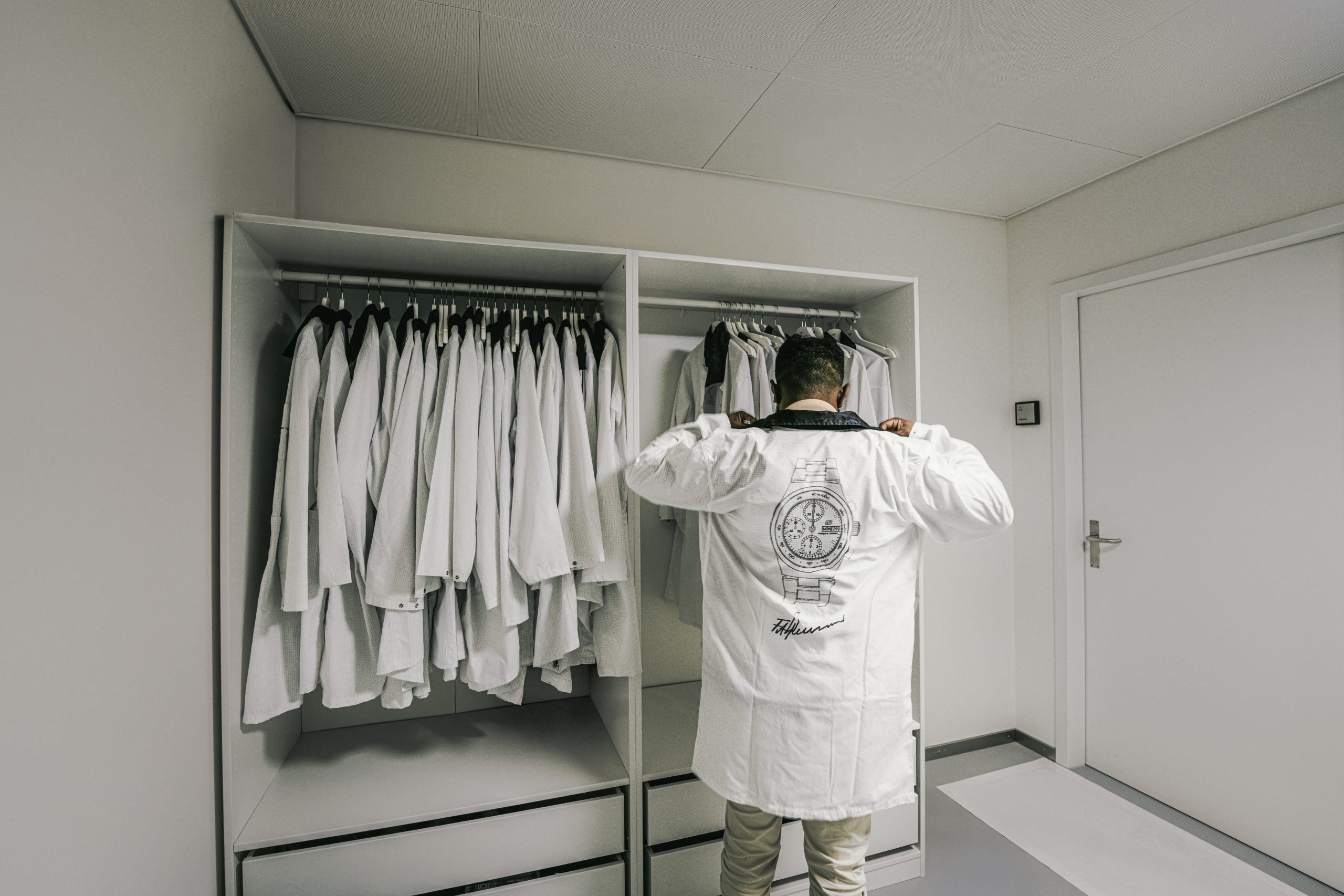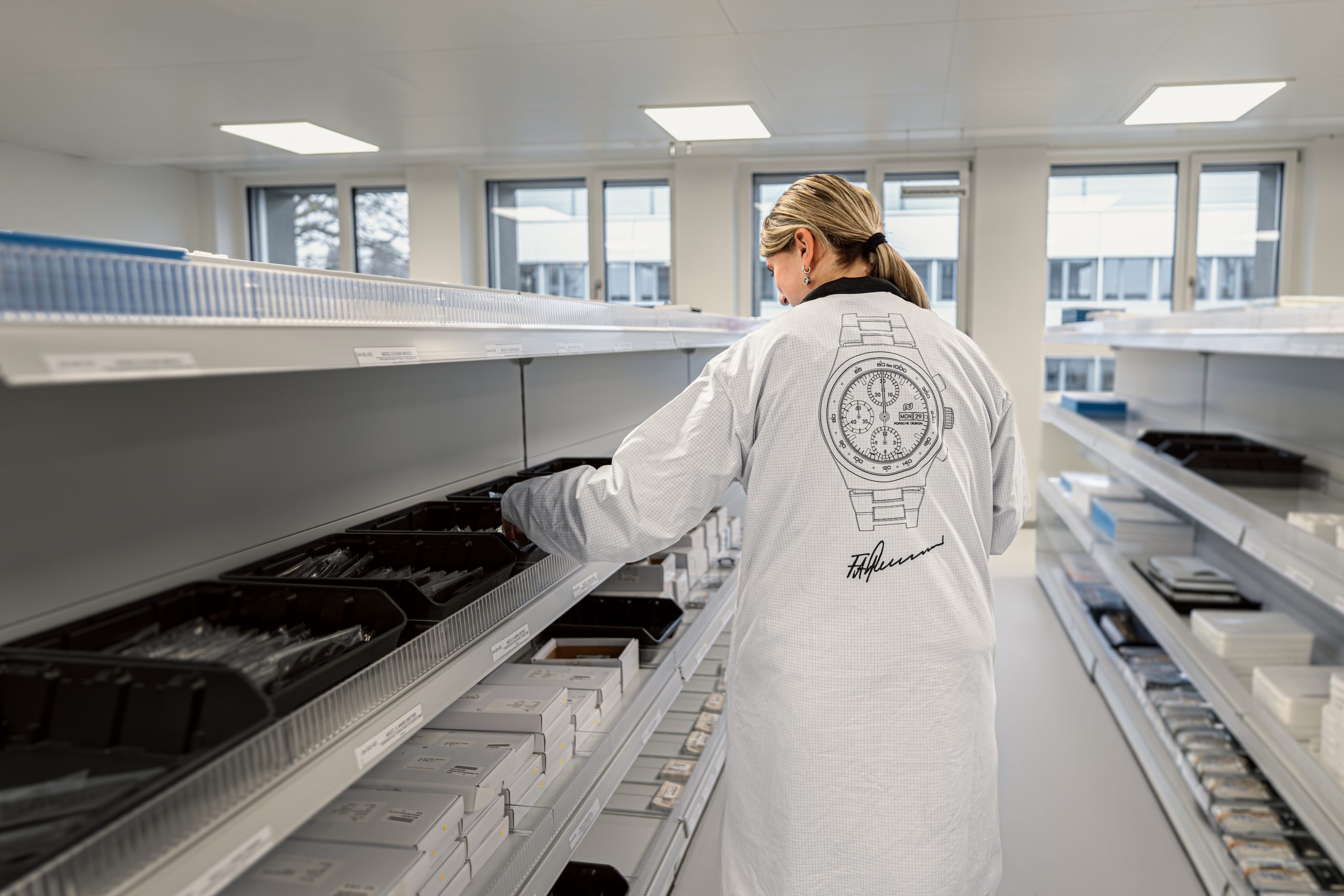 Für die Fertigung mechanischer Zeitmesser sind konstante klimatische Bedingungen essenziell. Die Manufaktur verfügt daher über einen Reinraum der Klasse ISO 7 mit Uhrmacherwerkbänken auf ISO 5-Niveau. Ein ausgeklügeltes Lüftungssystem mit fünffachem Luftwechsel pro Stunde, kontrollierter Luftfeuchtigkeit zwischen 40 und 50 Prozent sowie Überdrucktechnik gewährleistet maximale Sauberkeit und Stabilität. Der Zugang erfolgt ausschließlich über eine spezielle Schleuse und in Schutzkleidung, um dauerhaft optimale Bedingungen zu gewährleisten. Der Produktionsbereich ist nach klar strukturierten Prozessabläufen organisiert und folgt dem Porsche-Produktionsprinzip der sequenziellen Fertigung mit kurzen Wegen und effizienter „Just-In-Time“-Logistik. Eine integrierte Rollbahn mit Schwerkraftmechanismus verbindet den Logistikbereich direkt mit dem Reinraum, ohne zusätzliche Zugänge zu schaffen – eine technische Lösung, die Effizienz und höchste Sicherheitsanforderungen miteinander vereint. Neben der Fertigung sind auch Entwicklung, Qualitätsmanagement, After-Sales-Services sowie zentrale Verwaltungsfunktionen im Gebäude gebündelt. Für die Mitarbeitenden in administrativen Funktionen wurden großflächige, helle und klimatisierte Büroflächen mit modernen Arbeitsplätzen und Konferenzräumen geschaffen. Auch die Sozialräume wie Pausenräume und Büroküche entsprechen den modernsten Standards und schaffen Raum für persönliche Begegnungen und fachlichen Austausch. „Bei der neuen Manufaktur folgen wir dem Prinzip „Nicht mehr, sondern besser“, betont Bergmann. „Präzision beginnt bei der Architektur und der Gestaltung der Räumlichkeiten. Nur wer modernste Arbeitsbedingungen sowohl in Produktion und Logistik als auch in der Verwaltung vorfindet, kann Höchstleistungen erbringen. Der Weg von der ersten Idee bis zum fertigen Produkt, das die Manufaktur verlässt, und darüber hinaus, ist lang. Es war wichtig, dass wir für die verschiedenen Gewerke die jeweils für sie idealen Bedingungen schaffen. Nur dann greift -wie bei einem Schweizer Uhrwerk – jedes Rädchen ins andere.“