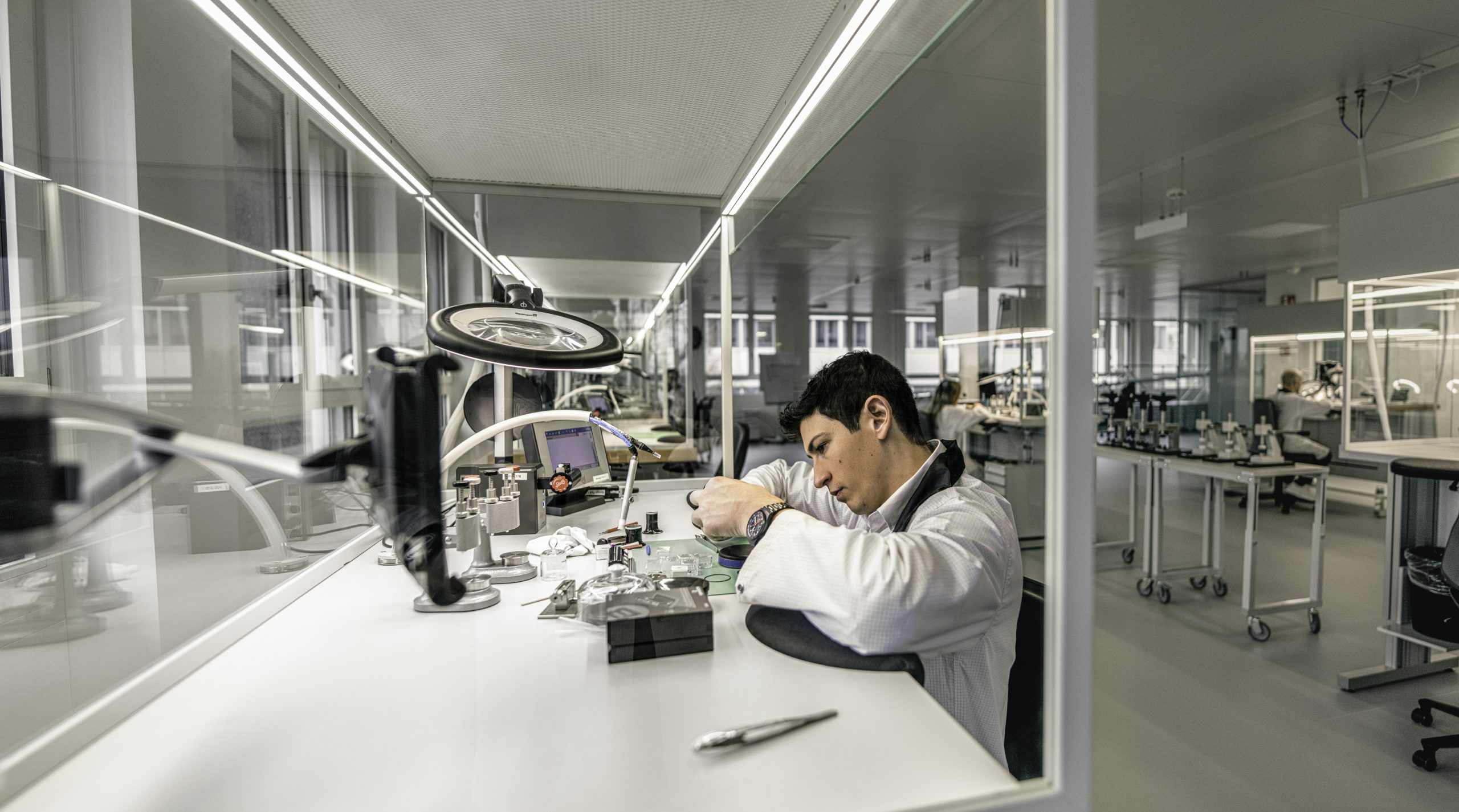 Das historische Gebäude wurde umfassend modernisiert und funktional neu strukturiert. Auf einer Gesamtfläche von rund 3.600 Quadratmetern stehen derzeit zehn hochmoderne Uhrmacherplätze zur Verfügung. Die klare, symmetrische Architektur und eine helle, offene Innenraumgestaltung schaffen ein Arbeitsumfeld, das konsequent auf die Anforderungen feinmechanischer Fertigung abgestimmt ist. Ein speziell entwickeltes Beleuchtungskonzept simuliert konstantes Tageslicht im gesamten Raum. Ergänzt wird die Grundbeleuchtung durch individuell ausgerichtete LED-Leuchten an jedem Arbeitsplatz. So können selbst feinste Staubpartikel oder minimale Oberflächenabweichungen zuverlässig erkannt werden – zu jeder Tages- und Jahreszeit.