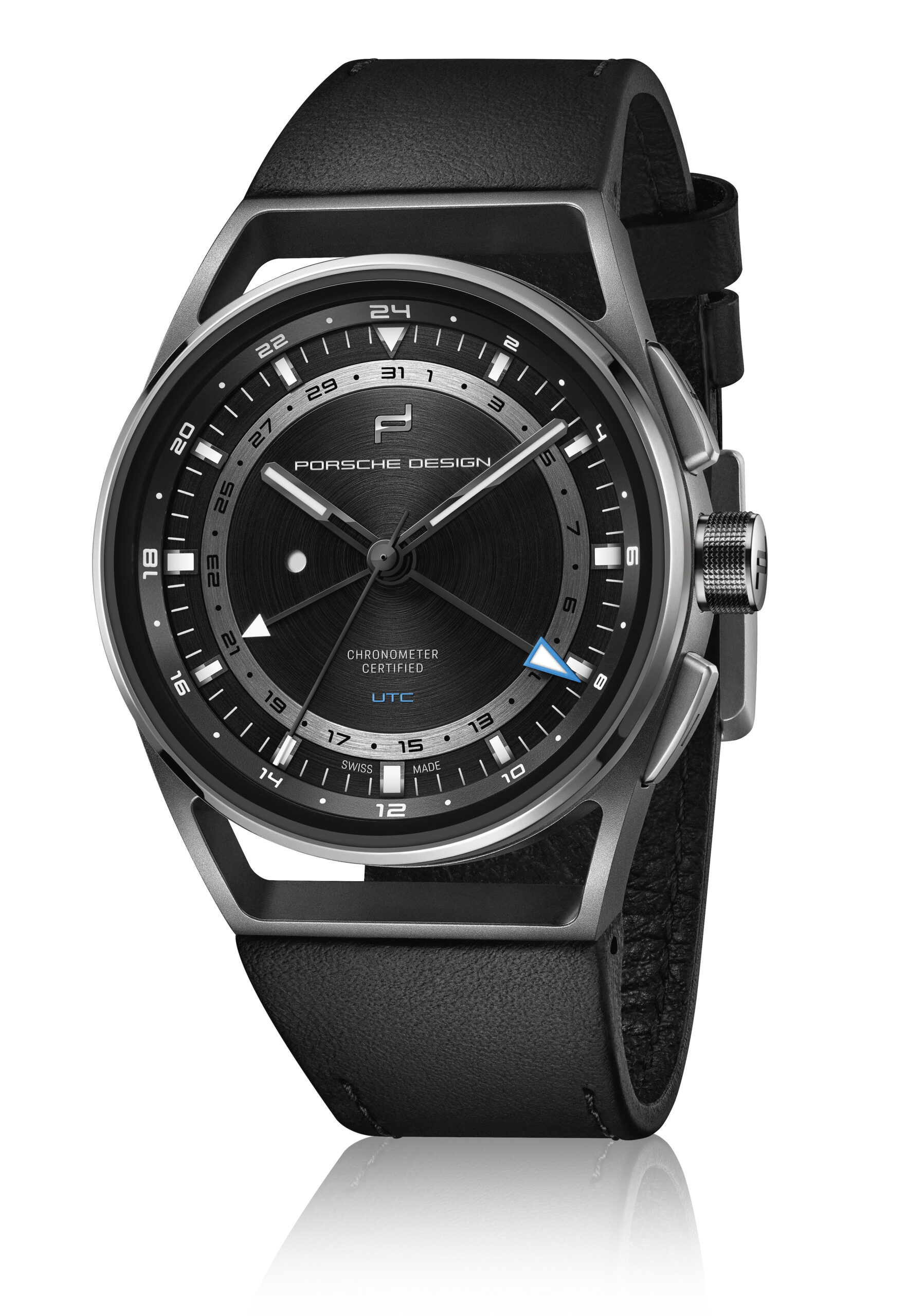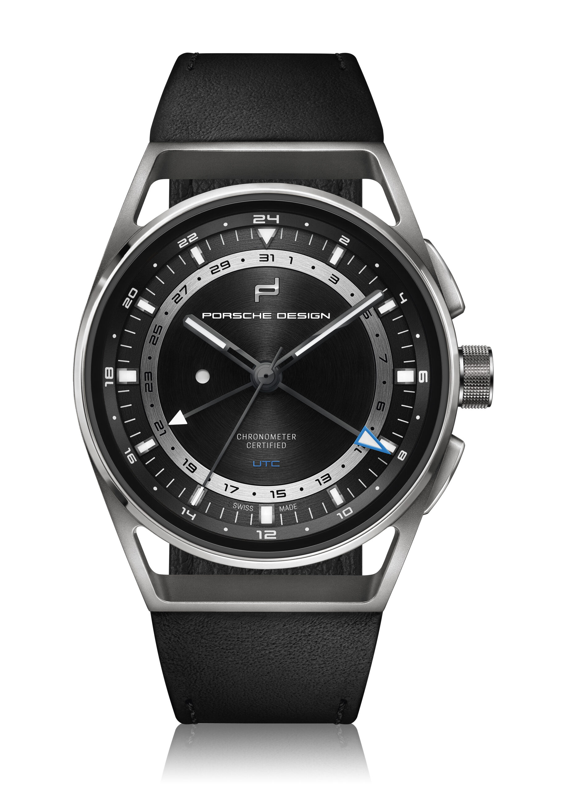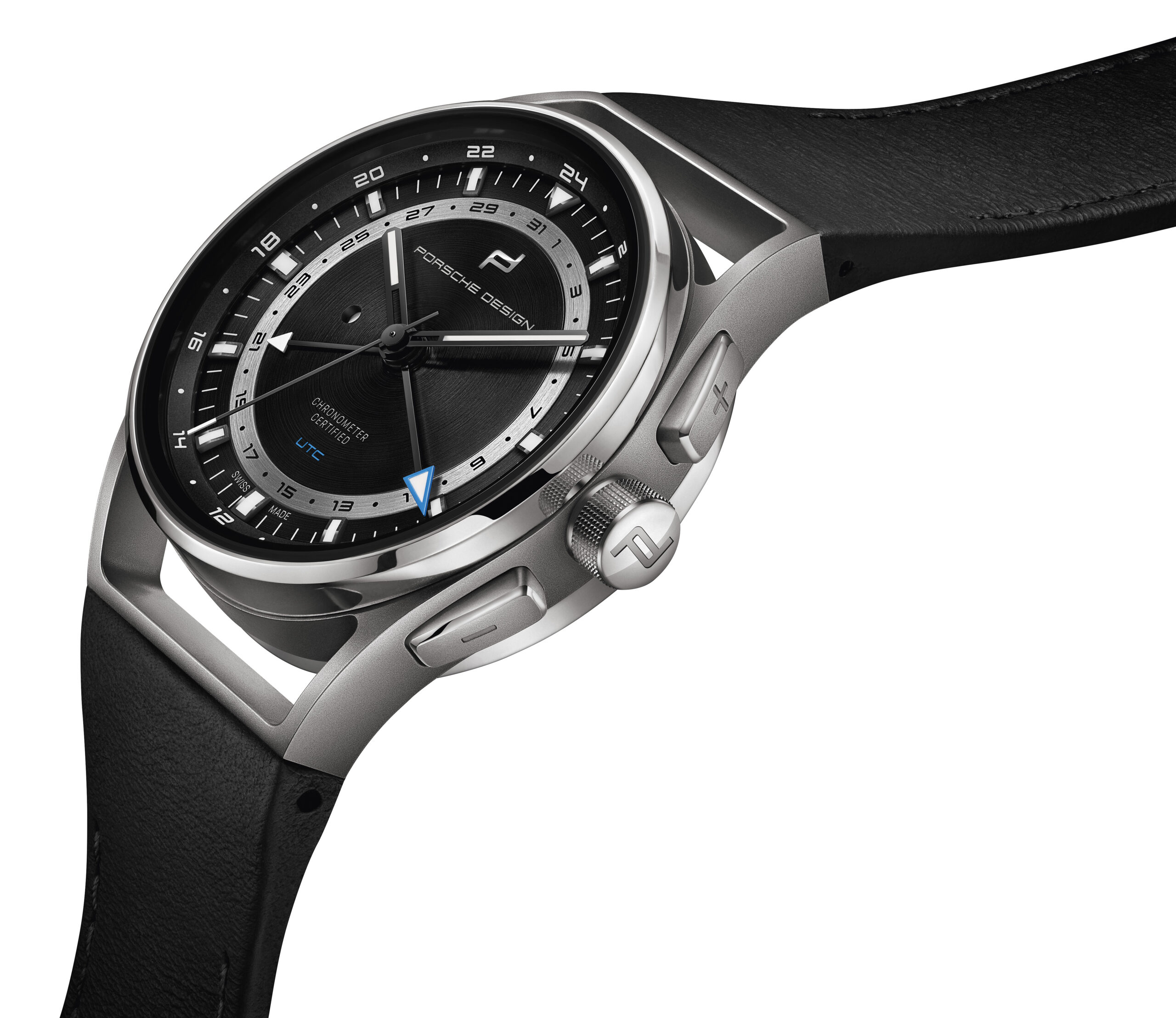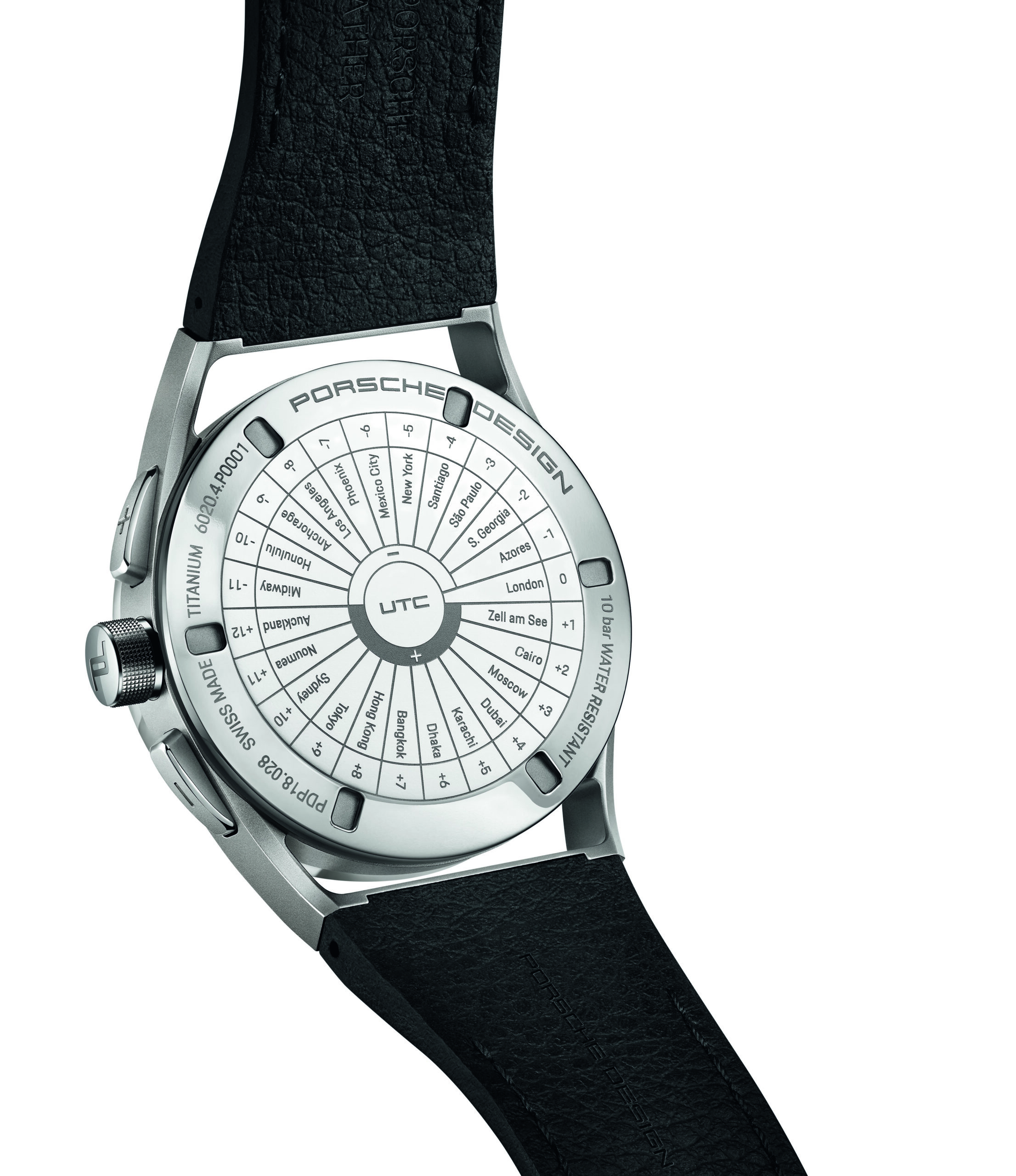 Praktikabilität ist für Fern-Reisende die oberste Maxime. Der Porsche Design 1919 Globetimer UTC macht es Vielreisenden unvergleichlich einfach, keine Zeit zu verlieren. Das Einstellen der lokalen Uhrzeit erfolgt ganz einfach mit Hilfe der formschlüssigen, ergonomisch positionierten Drücker. Jede Betätigung lässt den kurzen Ortszeit-Stundenzeiger um eine Position springen. Bei Reisen in östlicher Richtung wird die zweite Zeitzone durch betätigen des «+» Drücker schrittweise um jeweils eine Stunde vorgestellt. Die UTC-Zeiger bewegen sich dabei synchronisch. Bei Reisen in westlicher Richtung werden die UTC-Zeiger durch betätigen des «-» Drücker in die entgegengesetzte Richtung bewegt. Der zugehörige Zeiger folgt dem Lokalzeit-Stundenzeiger in jeder Richtung. Damit dies mitternachts und nicht mittags geschieht, muss die Uhrzeit nur einmal korrekt eingestellt werden. Dabei hilft ein kreisrundes Fenster links im Zifferblatt: Tagsüber erscheint dort ein weißer Punkt, in der Nacht bleibt es schwarz. Auch die Referenzzeit wurde von Porsche Design be-dacht. Für sie ist ein zweiter, deutlich unterscheidbarer Stundenzeiger mit markanter Leuchtspitze zuständig. Er dreht einmal in 24 Stunden und vermittelt so auf einen Blick, ob man zu Hause anrufen kann oder es noch/bereits Nachtzeit ist.