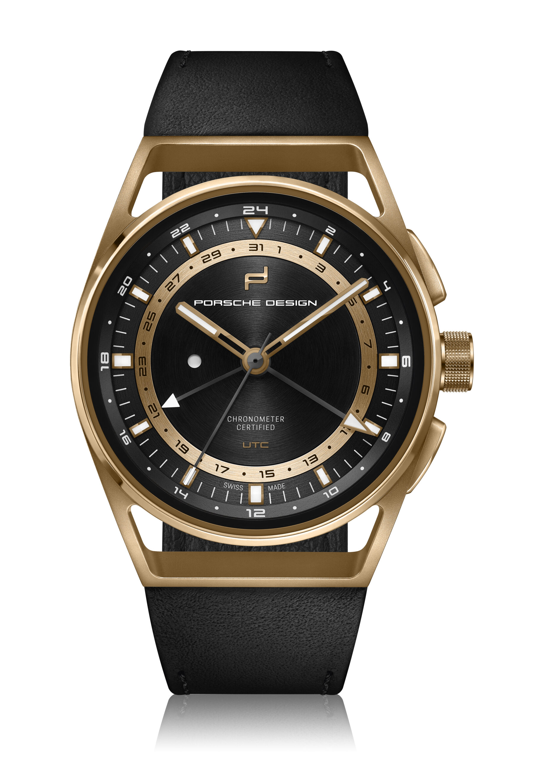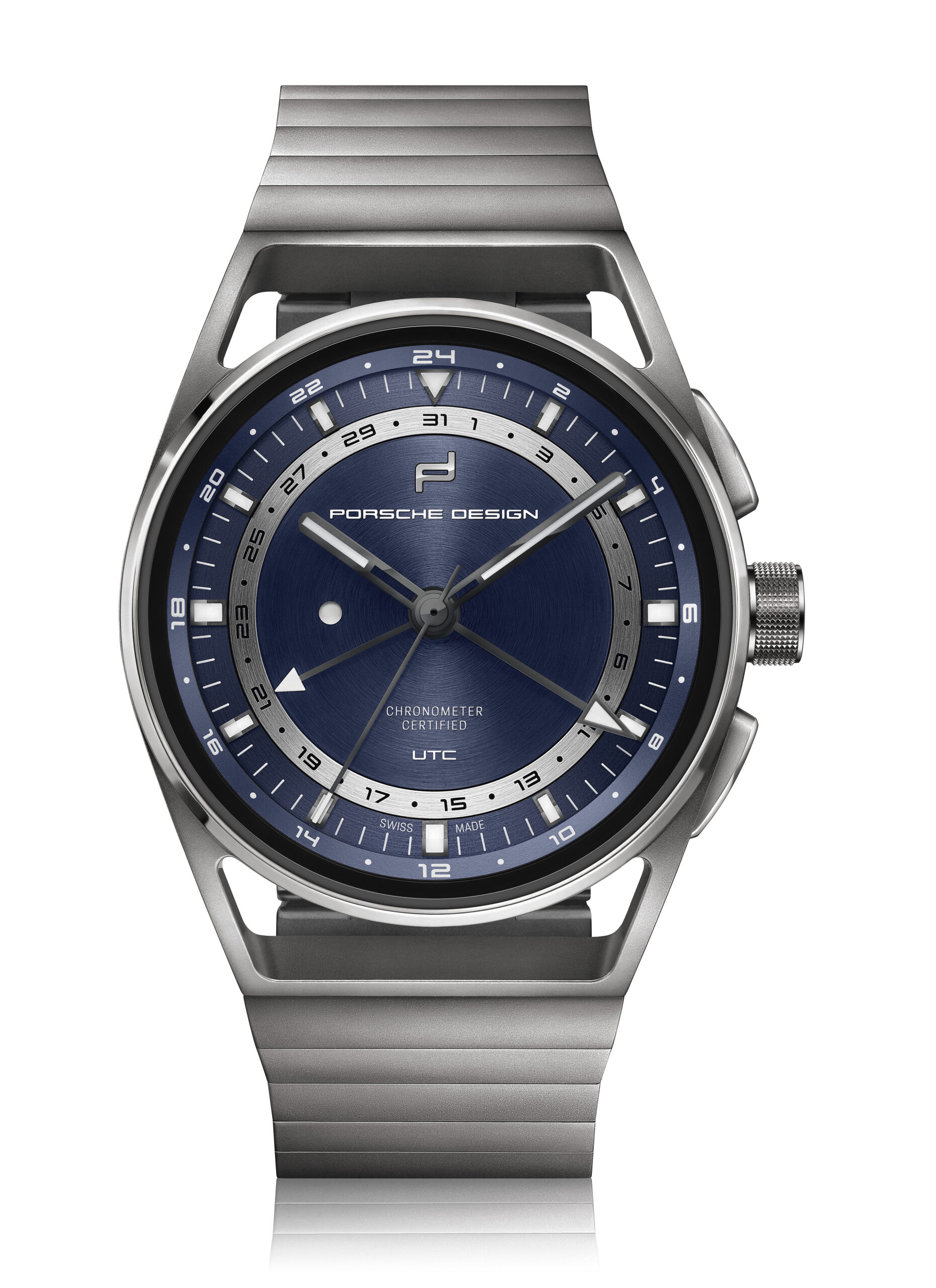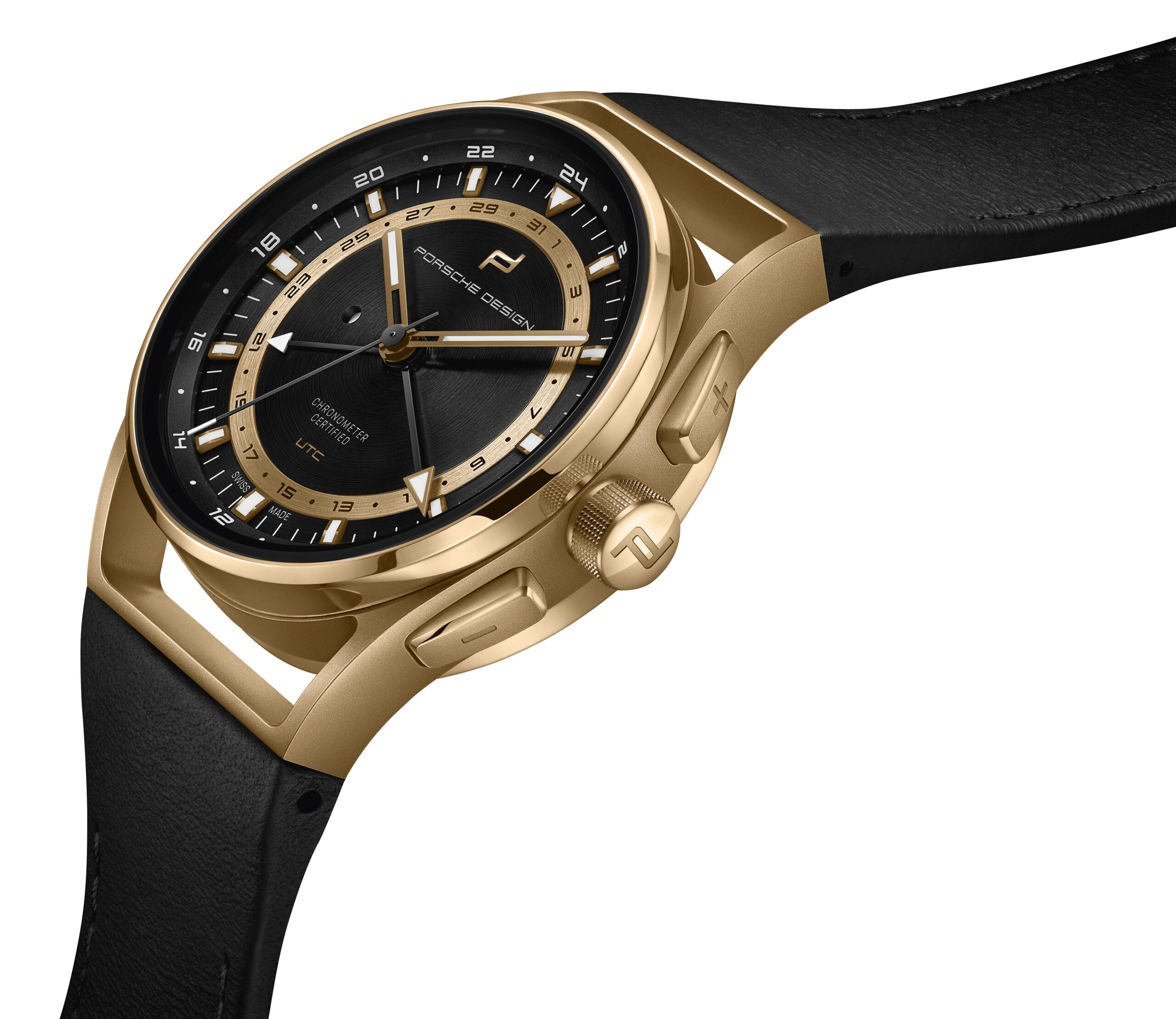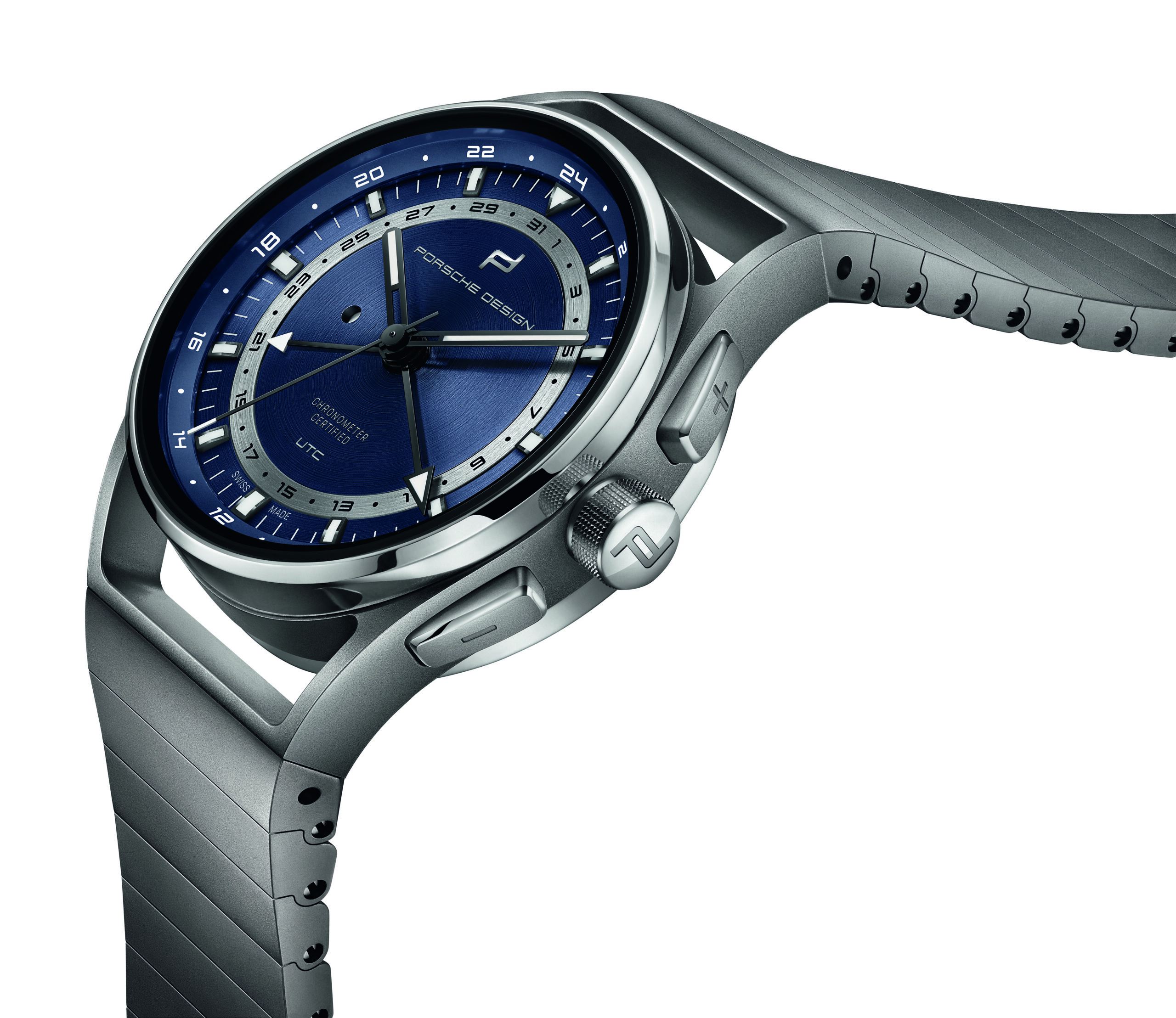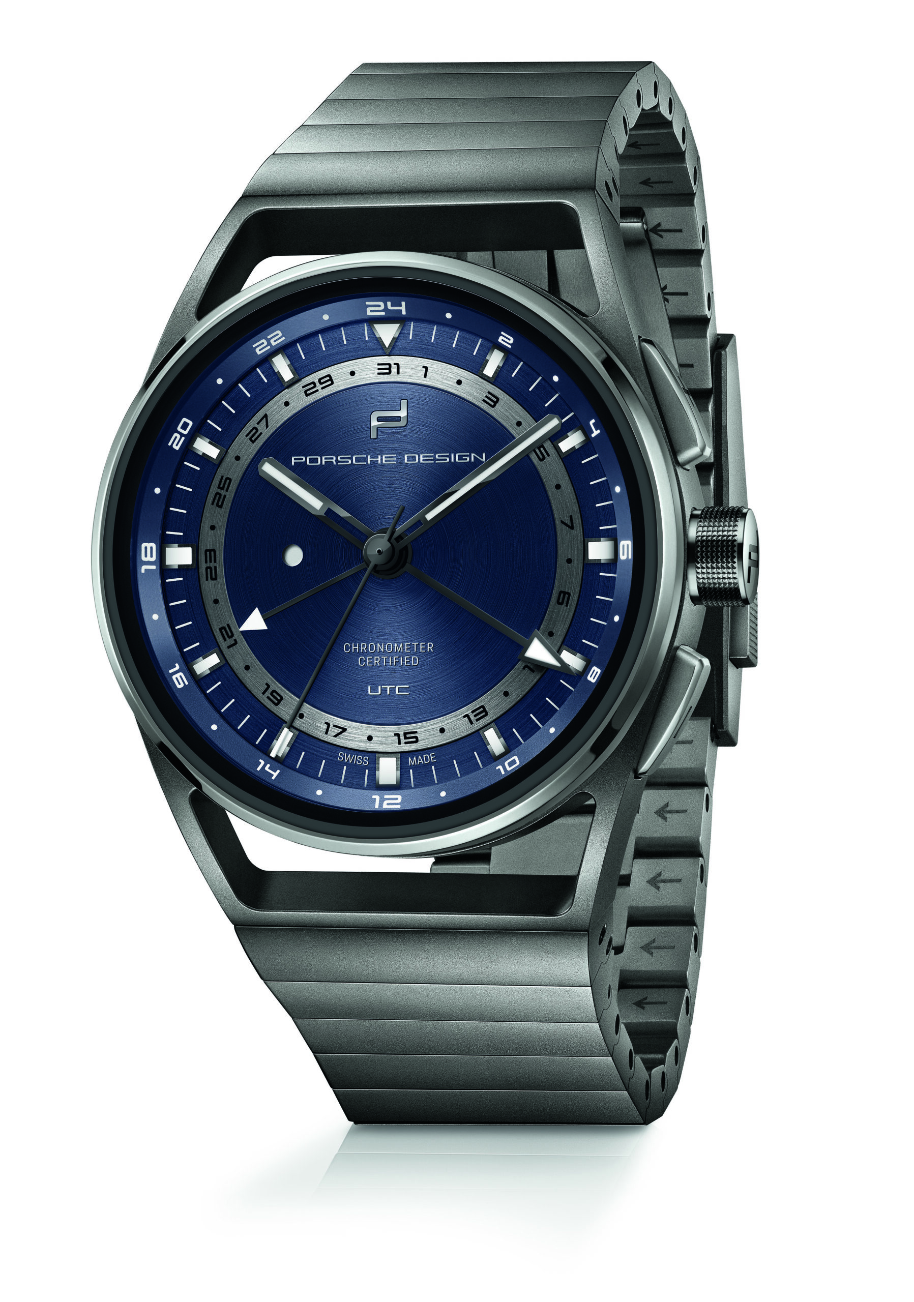 Praktikabilität ist für Fern-Reisende die oberste Maxime. Der Porsche Design 1919 Globetimer UTC macht es Vielreisenden unvergleichlich einfach, keine Zeit zu verlieren. Das Einstellen der lokalen Uhrzeit erfolgt ganz einfach mit Hilfe der formschlüssigen, ergonomisch positionierten Drücker. Jede Betätigung lässt den kurzen Ortszeit-Stundenzeiger um eine Position springen. Bei Reisen in östlicher Richtung wird die zweite Zeitzone durch betätigen des «+» Drücker schrittweise um jeweils eine Stunde vorgestellt. Die UTC-Zeiger bewegen sich dabei synchronisch. Bei Reisen in westlicher Richtung werden die UTC-Zeiger durch betätigen des «-» Drücker in die entgegengesetzte Richtung bewegt. Der zugehörige Zeiger folgt dem Lokalzeit-Stundenzeiger in jeder Richtung. Damit dies mitternachts und nicht mittags geschieht, muss die Uhrzeit nur einmal korrekt eingestellt werden. Dabei hilft ein kreisrundes Fenster links im Zifferblatt: Tagsüber erscheint dort ein weißer Punkt, in der Nacht bleibt es schwarz. Auch die Referenzzeit wurde von Porsche Design be-dacht. Für sie ist ein zweiter, deutlich unterscheidbarer Stundenzeiger mit markanter Leuchtspitze zuständig. Er dreht einmal in 24 Stunden und vermittelt so auf einen Blick, ob man zu Hause anrufen kann oder es noch/bereits Nachtzeit ist.