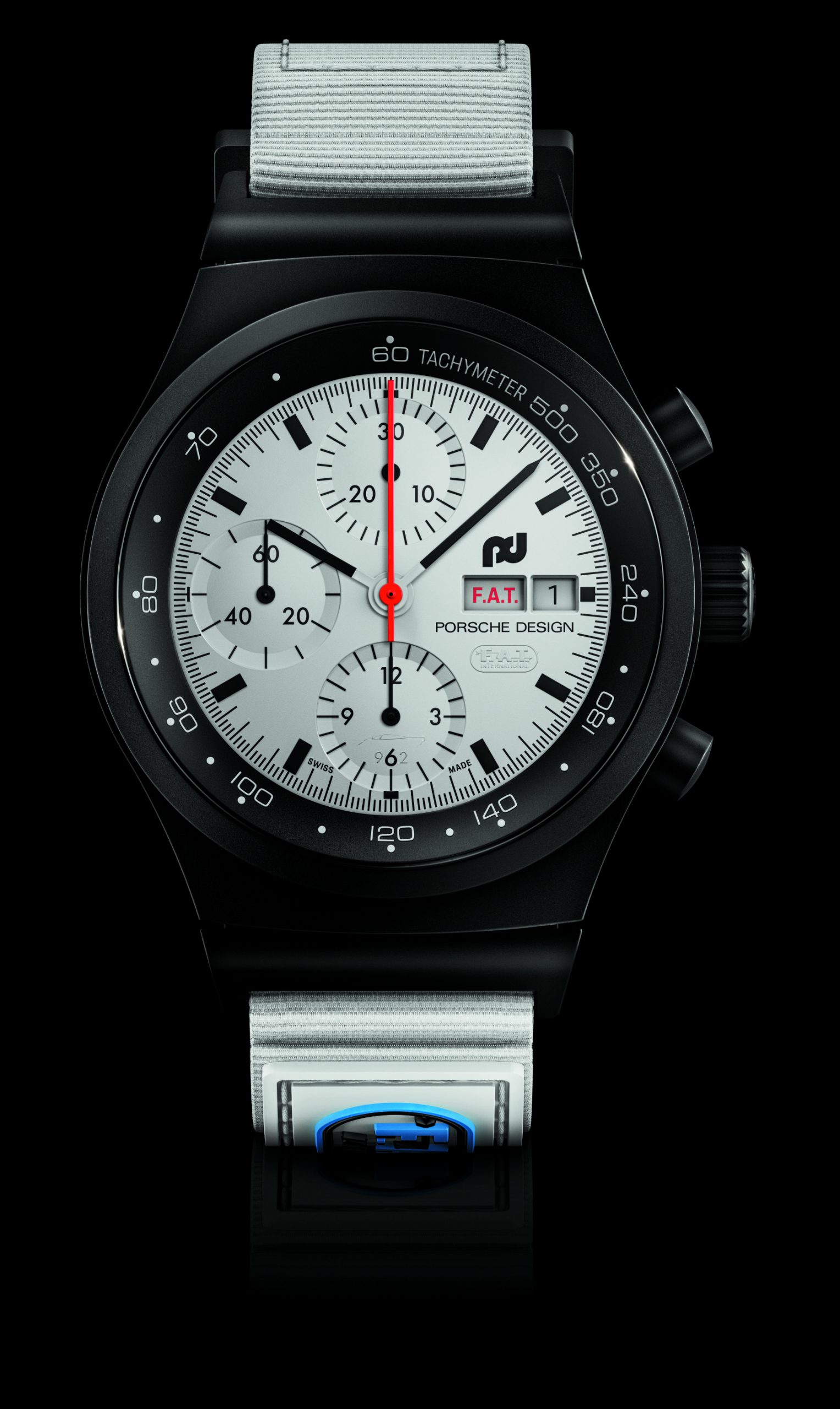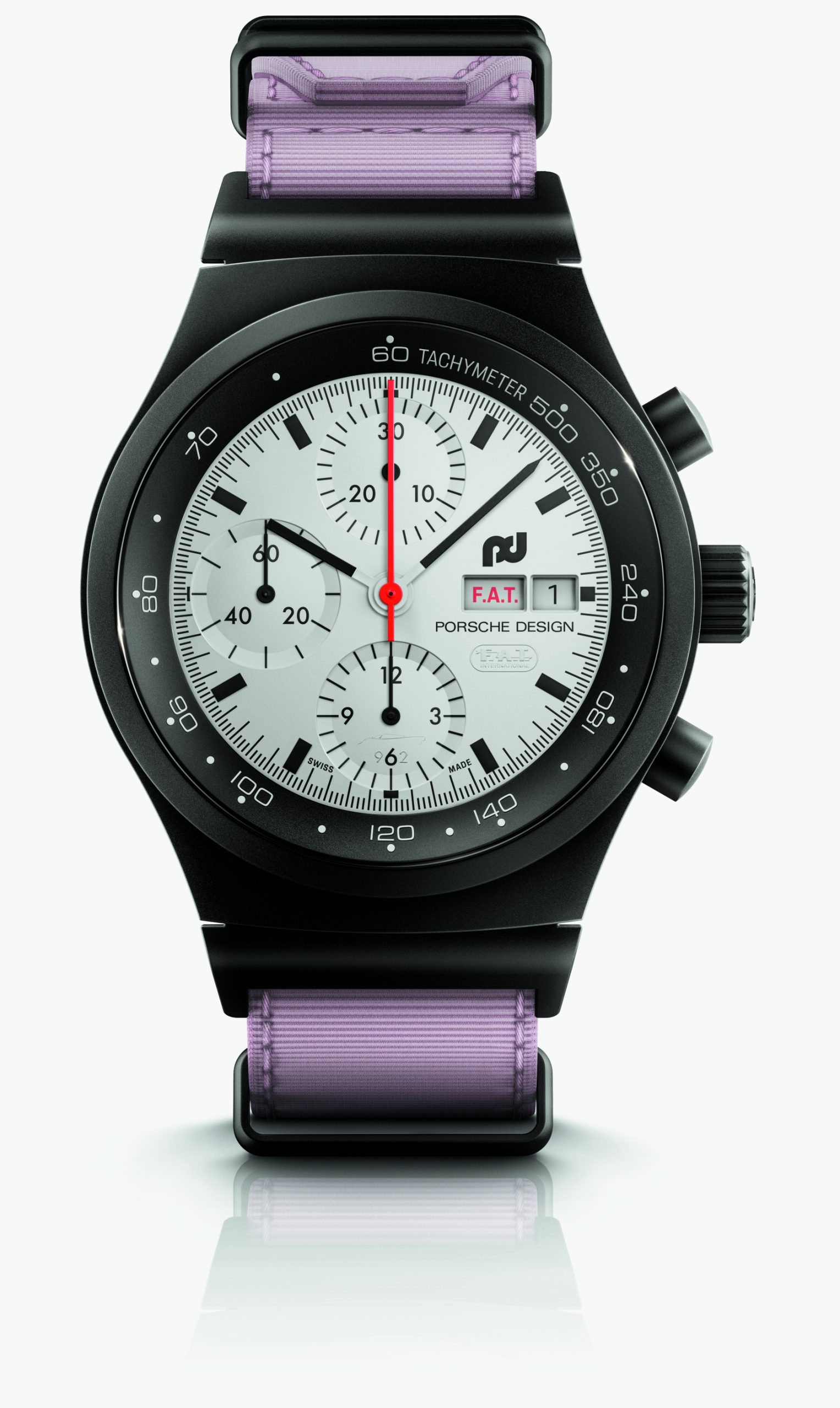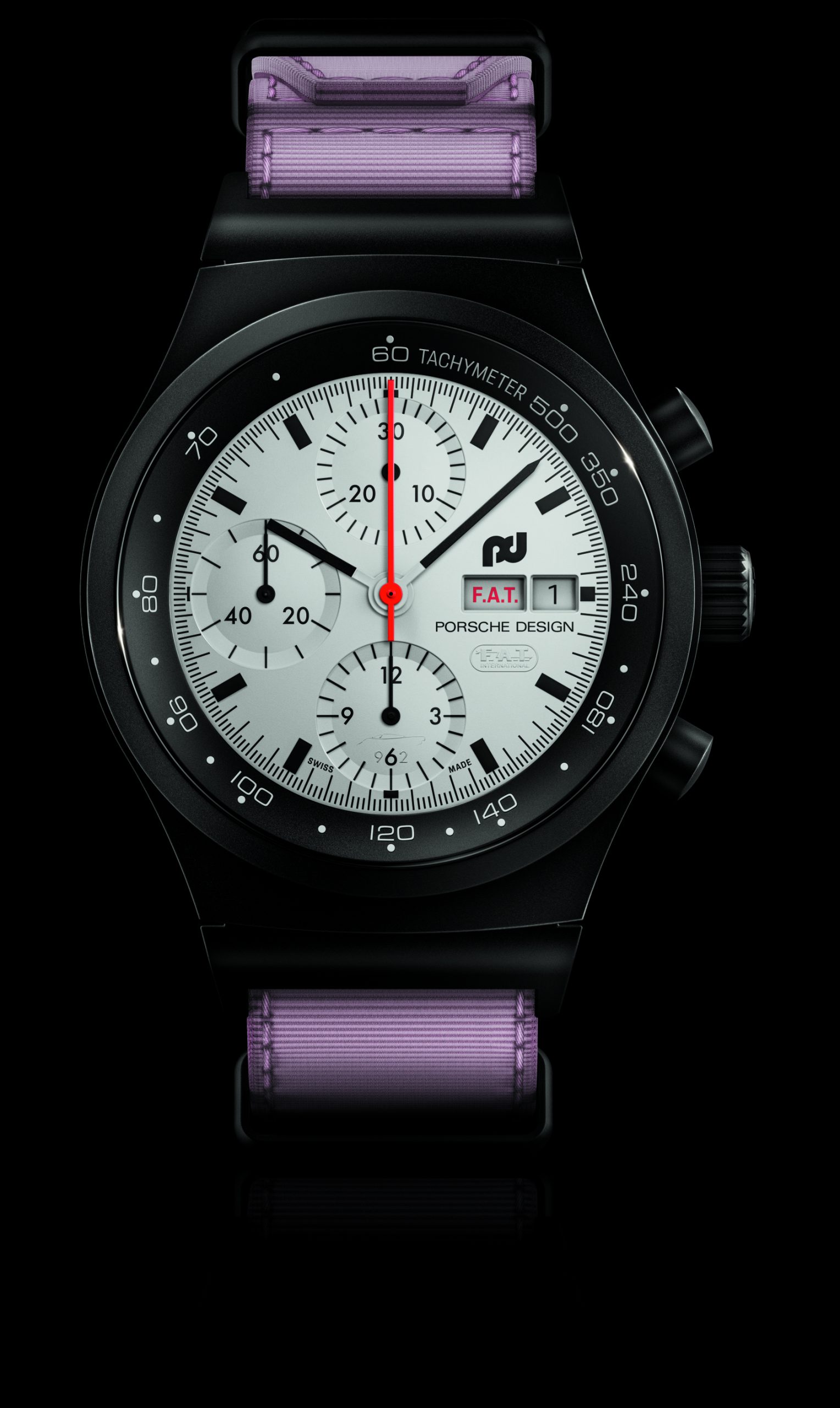 Die Designphilosophie von F. A. Porsche „Wenn man die Funktion einer Sache überdenkt, ergibt sich die Form manchmal wie von allein“, fand bereits in der Gestaltung des Chronograph I Anwendung. Dieser zeichnete sich durch ein matt-schwarzes Zifferblatt aus, das mit weißen Zeigern und Indizes sowie einem markanten roten Stoppsekundenzeiger einen optimalen Kontrast bot und so auch bei höchsten Geschwindigkeiten schnell und einfach abzulesen war. Mit dem Chronograph 1 – F.A.T. 2025 Edition geht Porsche Design nun noch einen Schritt weiter: Zum ersten Mal erscheint das Zifferblatt in strahlendem Weiß dank einer vollständigen Beschichtung mit innovativer Super-LumiNova®-Leuchtmasse. Die maximale Leuchtkraft bietet zusammen mit den schwarzen Indizes, Zahlen und Zeigern hervorragende Ablesbarkeit sowohl bei Tag als auch bei Nacht – ideal für Langstreckenrennen wie die 24 Stunden von Le Mans. Der Stoppsekundenzeiger ist im für den Chronograph 1 typischen markanten Rot gehalten. Bei Dunkelheit offenbaren leuchtende Highlights versteckte Details: Die Silhouette des Porsche 962 ziert den Stundenzähler. Die „6“ im Totalisator auf der 6-Uhr-Position bildet zusammen mit einer „9“ und einer „2“ den Fahrzeugnamen, und das F.A.T. International-Logo erscheint unter der Datumsanzeige. Die englische Tagesanzeige geht noch weiter – sie macht mit dem im F.A.T.-typischen Rot gehaltenen Schriftzug „F.A.T.“ anstelle von „S.A.T.“ und „S.U.N.“ jedes Wochenende zu einem Rennwochenende.