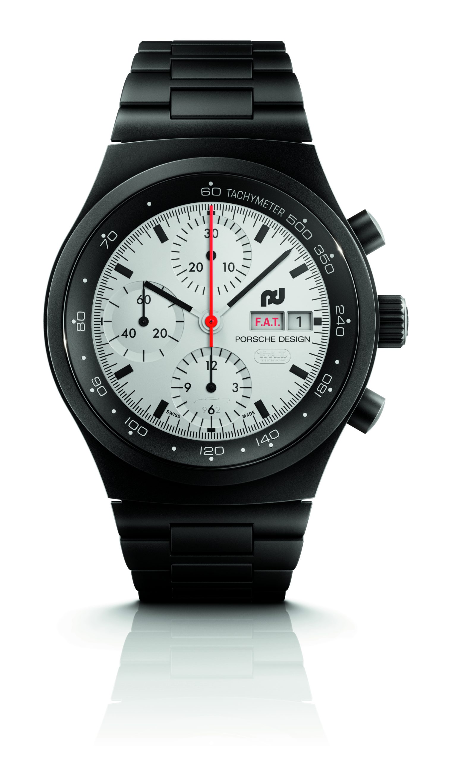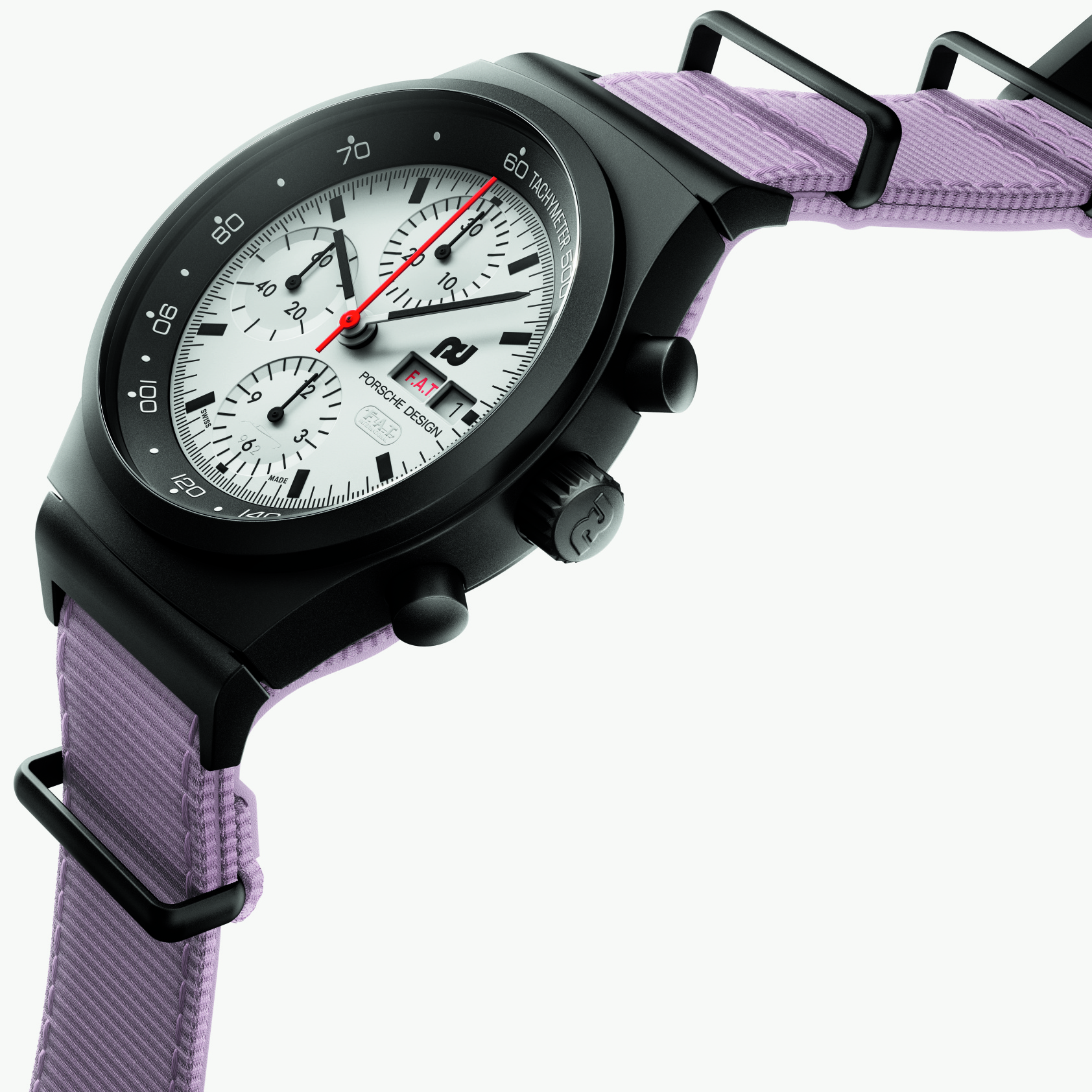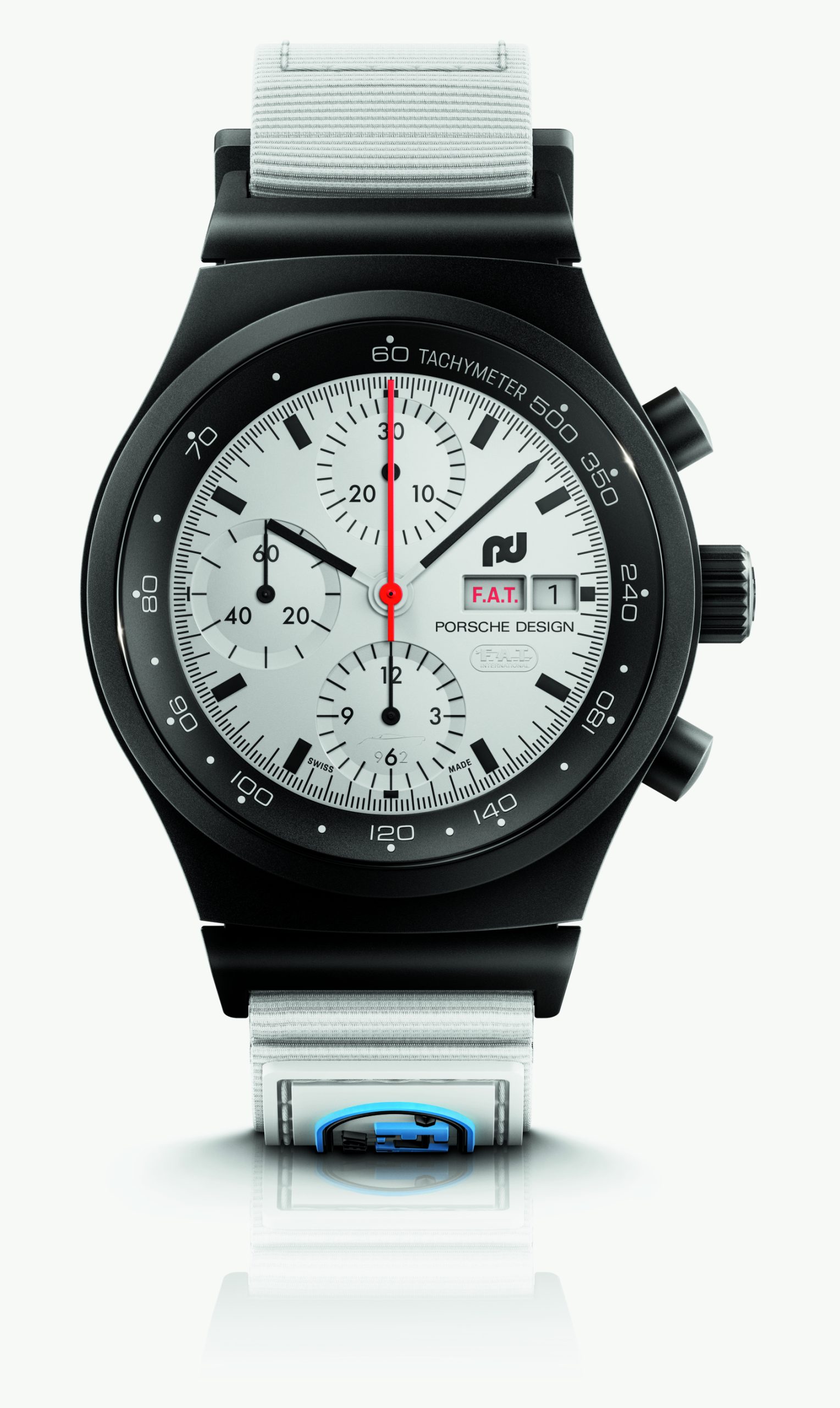 Die Designphilosophie von F. A. Porsche „Wenn man die Funktion einer Sache überdenkt, ergibt sich die Form manchmal wie von allein“, fand bereits in der Gestaltung des Chronograph I Anwendung. Dieser zeichnete sich durch ein matt-schwarzes Zifferblatt aus, das mit weißen Zeigern und Indizes sowie einem markanten roten Stoppsekundenzeiger einen optimalen Kontrast bot und so auch bei höchsten Geschwindigkeiten schnell und einfach abzulesen war. Mit dem Chronograph 1 – F.A.T. 2025 Edition geht Porsche Design nun noch einen Schritt weiter: Zum ersten Mal erscheint das Zifferblatt in strahlendem Weiß dank einer vollständigen Beschichtung mit innovativer Super-LumiNova®-Leuchtmasse. Die maximale Leuchtkraft bietet zusammen mit den schwarzen Indizes, Zahlen und Zeigern hervorragende Ablesbarkeit sowohl bei Tag als auch bei Nacht – ideal für Langstreckenrennen wie die 24 Stunden von Le Mans. Der Stoppsekundenzeiger ist im für den Chronograph 1 typischen markanten Rot gehalten. Bei Dunkelheit offenbaren leuchtende Highlights versteckte Details: Die Silhouette des Porsche 962 ziert den Stundenzähler. Die „6“ im Totalisator auf der 6-Uhr-Position bildet zusammen mit einer „9“ und einer „2“ den Fahrzeugnamen, und das F.A.T. International-Logo erscheint unter der Datumsanzeige. Die englische Tagesanzeige geht noch weiter – sie macht mit dem im F.A.T.-typischen Rot gehaltenen Schriftzug „F.A.T.“ anstelle von „S.A.T.“ und „S.U.N.“ jedes Wochenende zu einem Rennwochenende.
