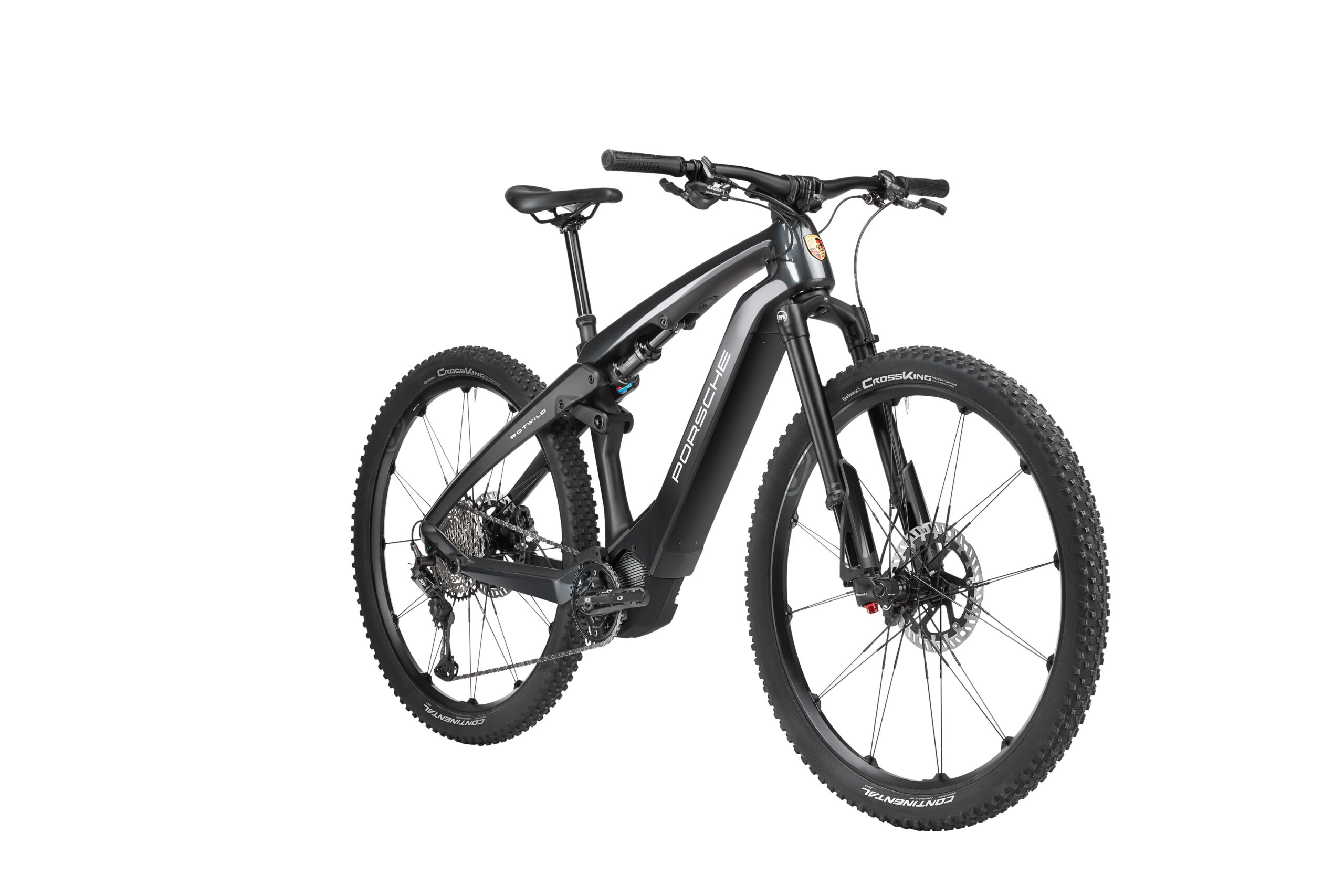 Abseits der Straßen im Gelände und auf unbekannten Pfaden ist das Porsche eBike Cross zu Hause. Gerade in schwierigem Terrain zeigt der von Shimano neu entwickelte, kraftvolle Motor sein ganzes Können und unterstützt mit maximaler Performance bei natürlichem Fahrgefühl. Die Magura-MT Trail-Hochleistungsbremsen sorgen mit extra großen, hitzebeständigen Bremsscheiben für eine optimale Verzögerung, während die mechanische Shimano XT 12-fach Schaltung schnelle Gangwechsel je nach Anspruch und Gelände garantiert. Für eine ideale und rasch anpassbare Sitzposition mit maximaler Bewegungsfreiheit sorgt die hydraulisch verstellbare Crankbrothers Highline Sattelstütze. Der ergonomisch geformte Lenker garantiert stets volle Kontrolle und beherbergt unter anderem das Shimano-Farbdisplay, das neben der Geschwindigkeit auch Distanz und Reichweite in Echtzeit anzeigt. Abgerundet wird das cleane Design vom vollgefederten Carbon-Rahmen, der perfekt Abenteuerlust mit Stil verbindet.